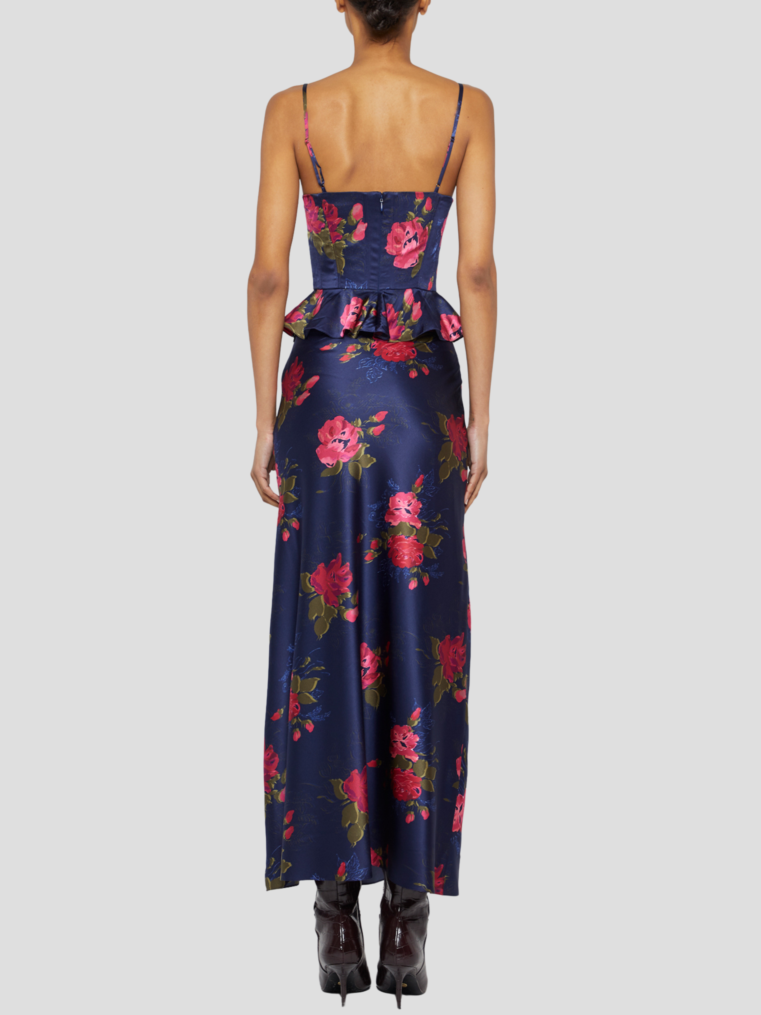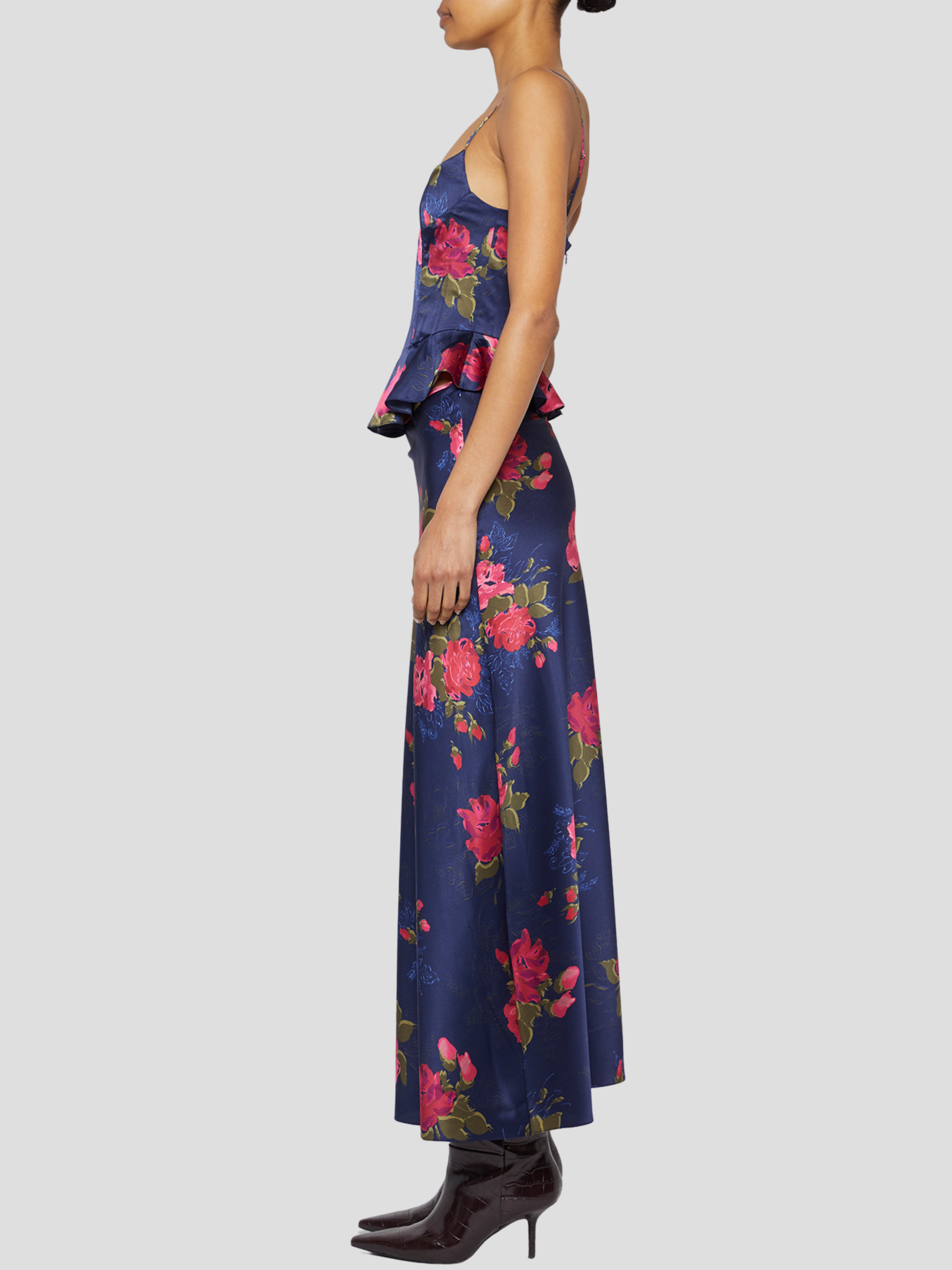Indulge in luxurious style with the Bias Floral Midi Skirt in Navy. This elegant skirt features a bias cut for a flattering silhouette and a gorgeous floral print that adds a touch of sophistication. Its midi length makes it perfect for any occasion, while the deep navy color adds a touch of drama. Elevate your wardrobe with this premium piece.
