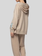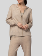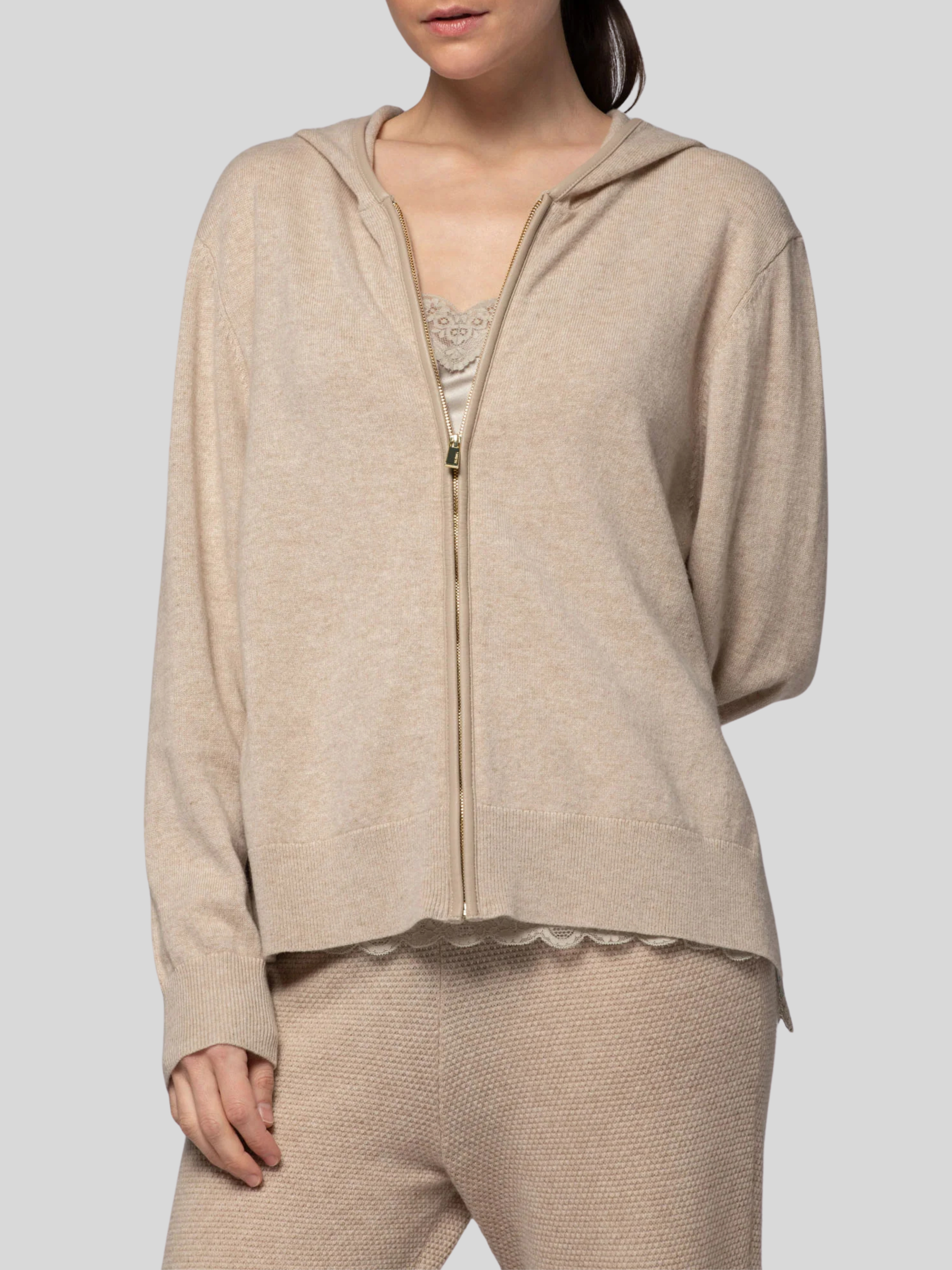 With its relaxed fit and clean lines, the long-sleeved GARANCE hoodie is a must-have in any woman’s wardrobe. It stands out with a zip fastening edged in leather, adding a subtle sporty-chic twist to its understated elegance. Knitted in a luxurious wool and cashmere jersey, it charms with its asymmetric design and wide side slits that create movement and gently enhance the shape. Practical and cozy, it features a large enveloping hood — perfect for braving windy days this season.