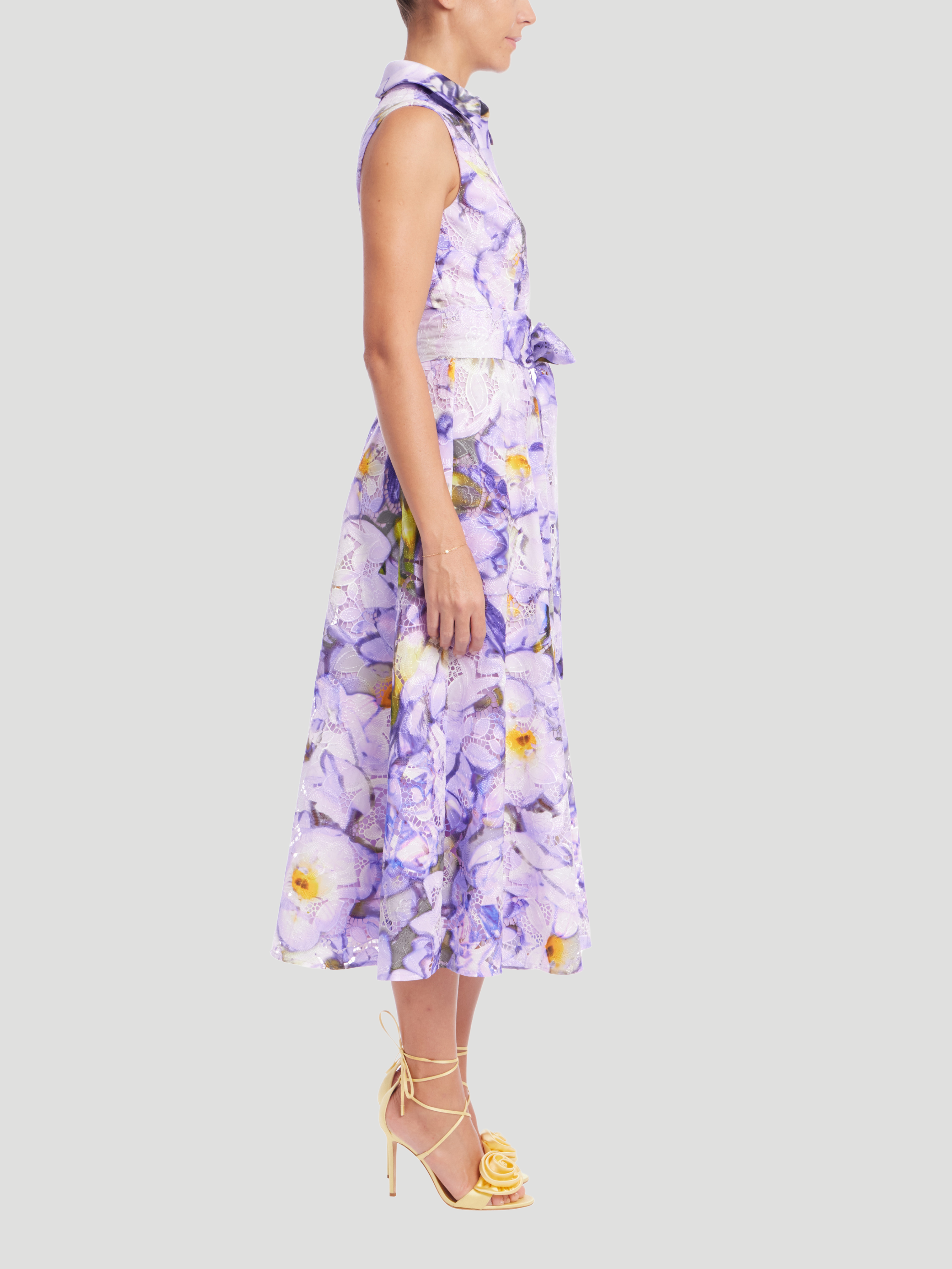 Elevate your wardrobe with Badgley Mischka's Sleeveless Printed Lace A-Line Dress. Its structured shirt dress silhouette is softened by a delicate lace overlay, creating a dreamy, nature-inspired look. Perfect for sunny days or special occasions, you'll feel effortlessly chic and comfortable with its breezy, sleeveless design and adjustable self-tie belt. A must-have for any fashion-forward woman.