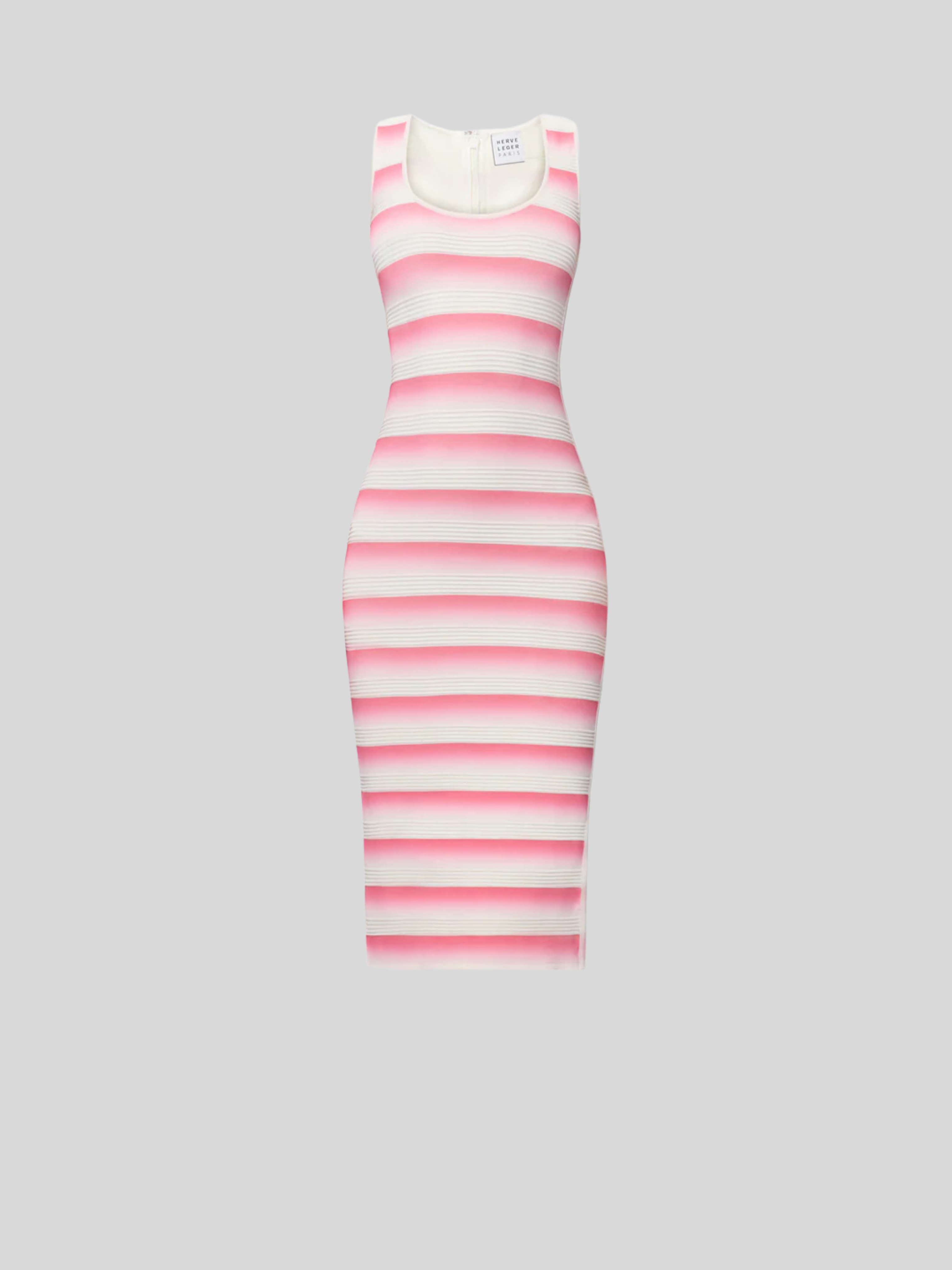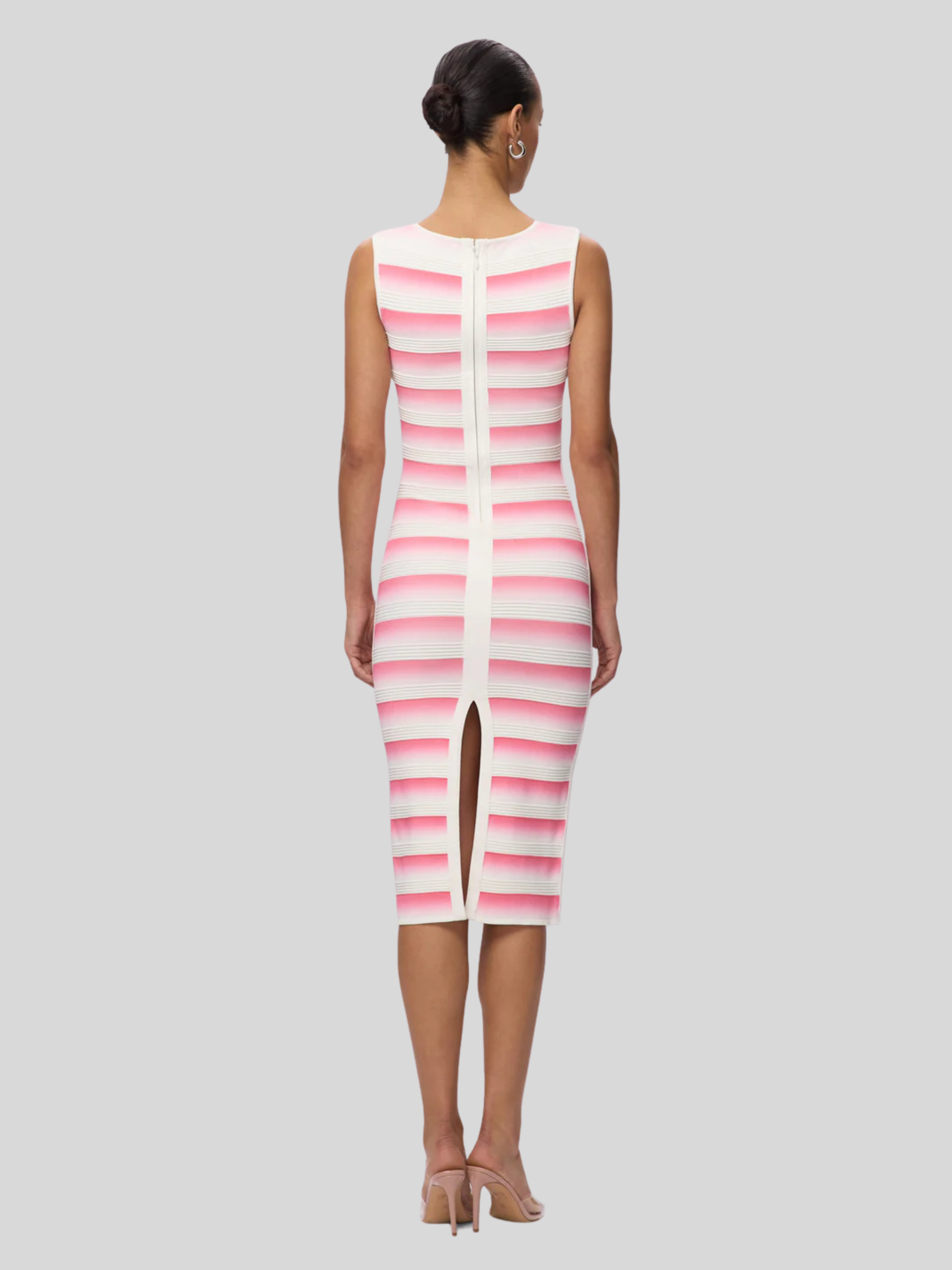 As seen in Look 15 of the Spring '26 Lookbook, the Clea Dress is a body-hugging midi cut from a viscose knit with a banded ombre effect. Features a scoop neckline, back slit and is finished with a center-back zip.