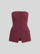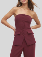 Borrowed from the boys, this bustier in a structured suiting blend Vino has classic menswear styling--structured shape, front buttons, and front flap pockets (plus, a comfortable elastic back!). The Dream Phoebe Bustier looks especially sharp paired with your favorite denim or styled as a set with The Jones Pant