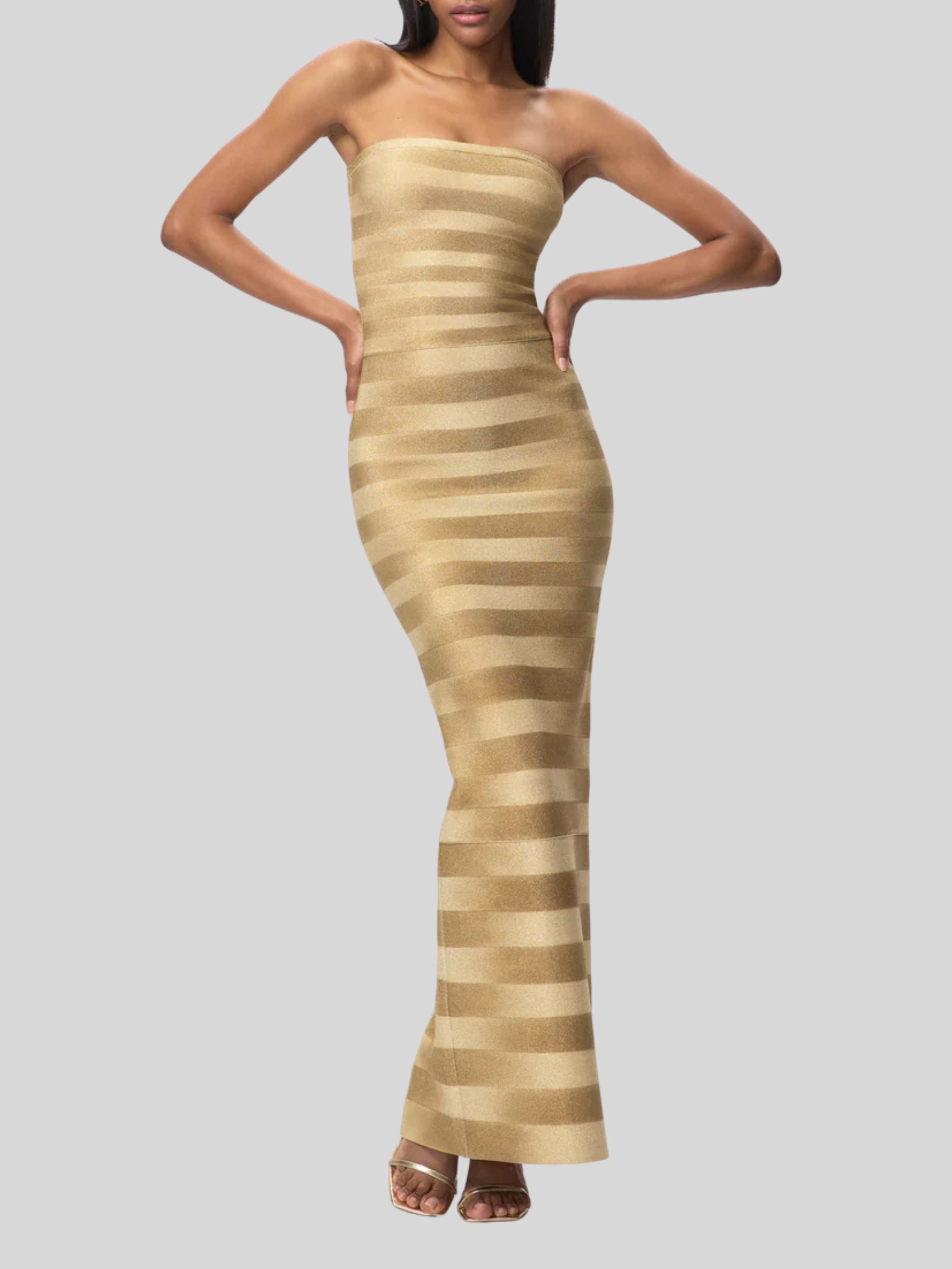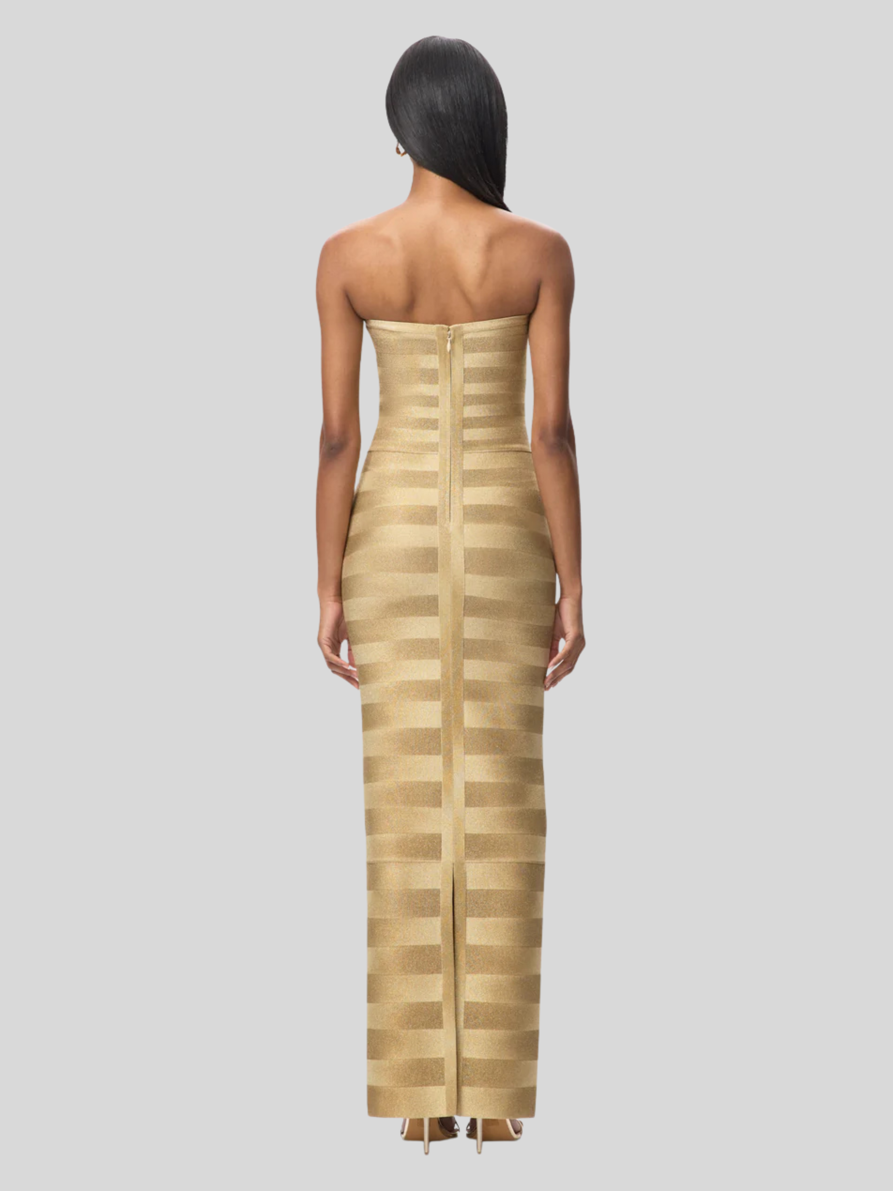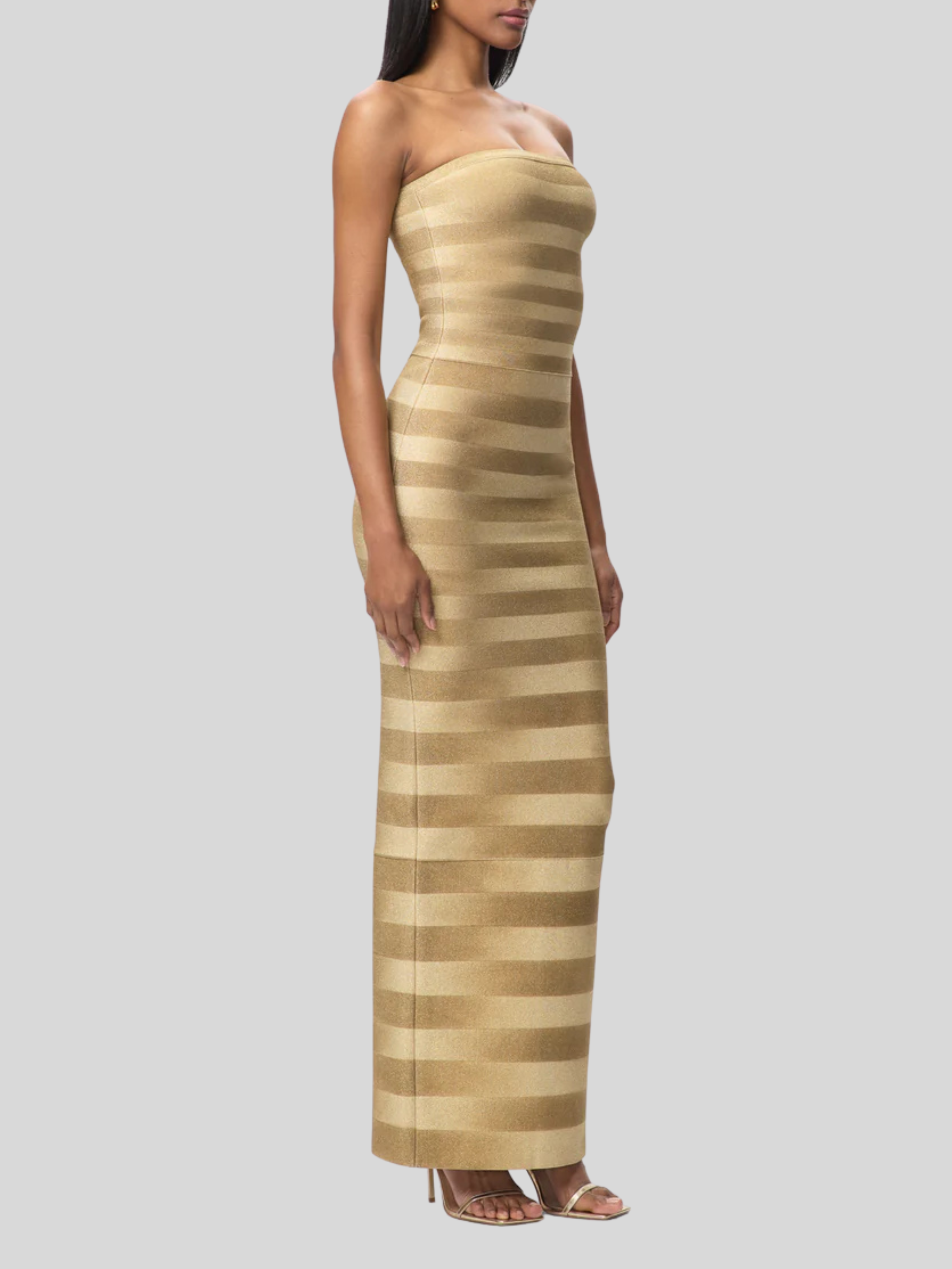 The Nia Gown, as seen in Look 5 of the Resort '26 Lookbook, is a strapless column silhouette in a body-contouring compact knit. The ankle-length design features an ombré bandage effect and is finished with a back slit and center-back zip.