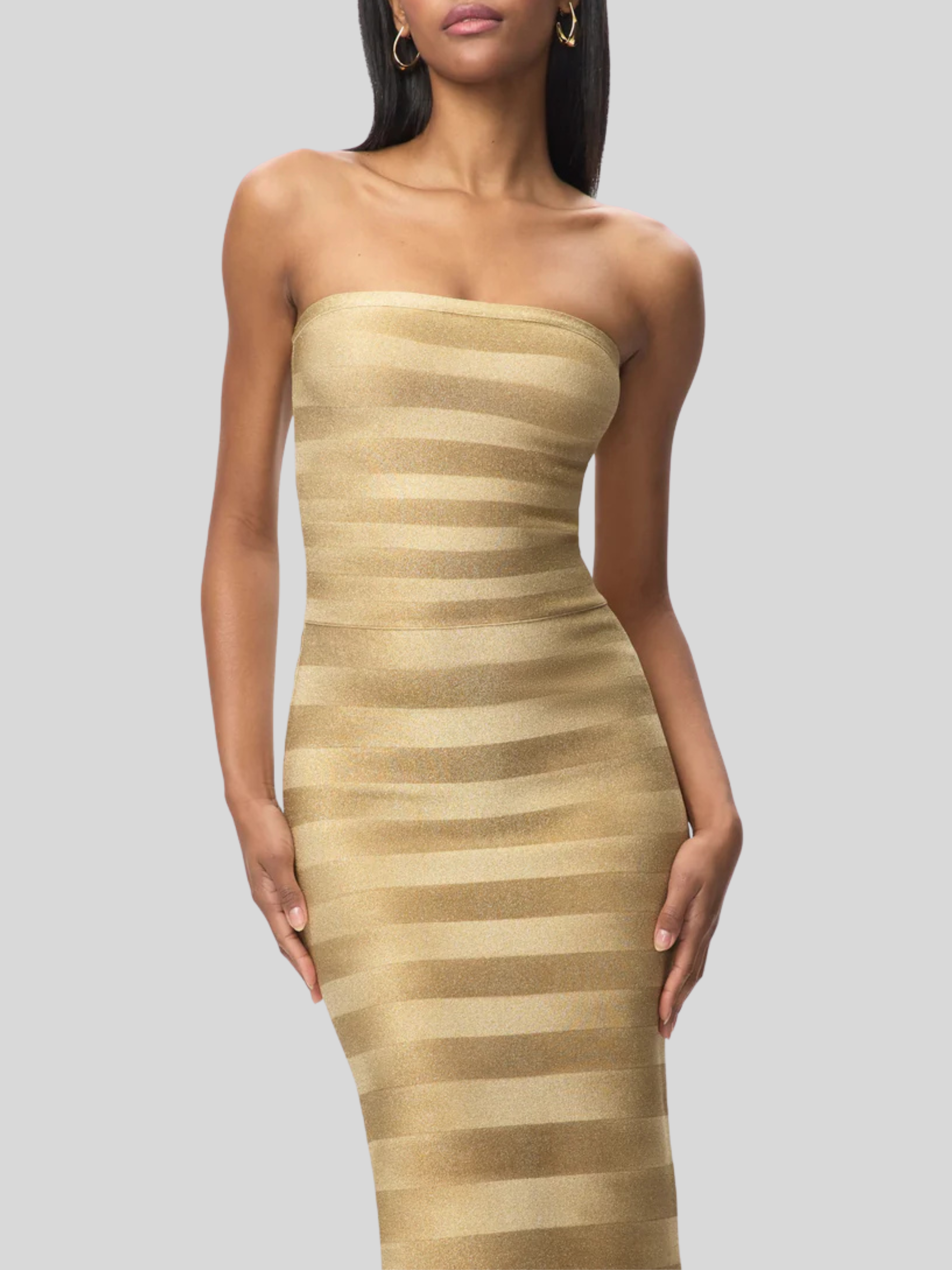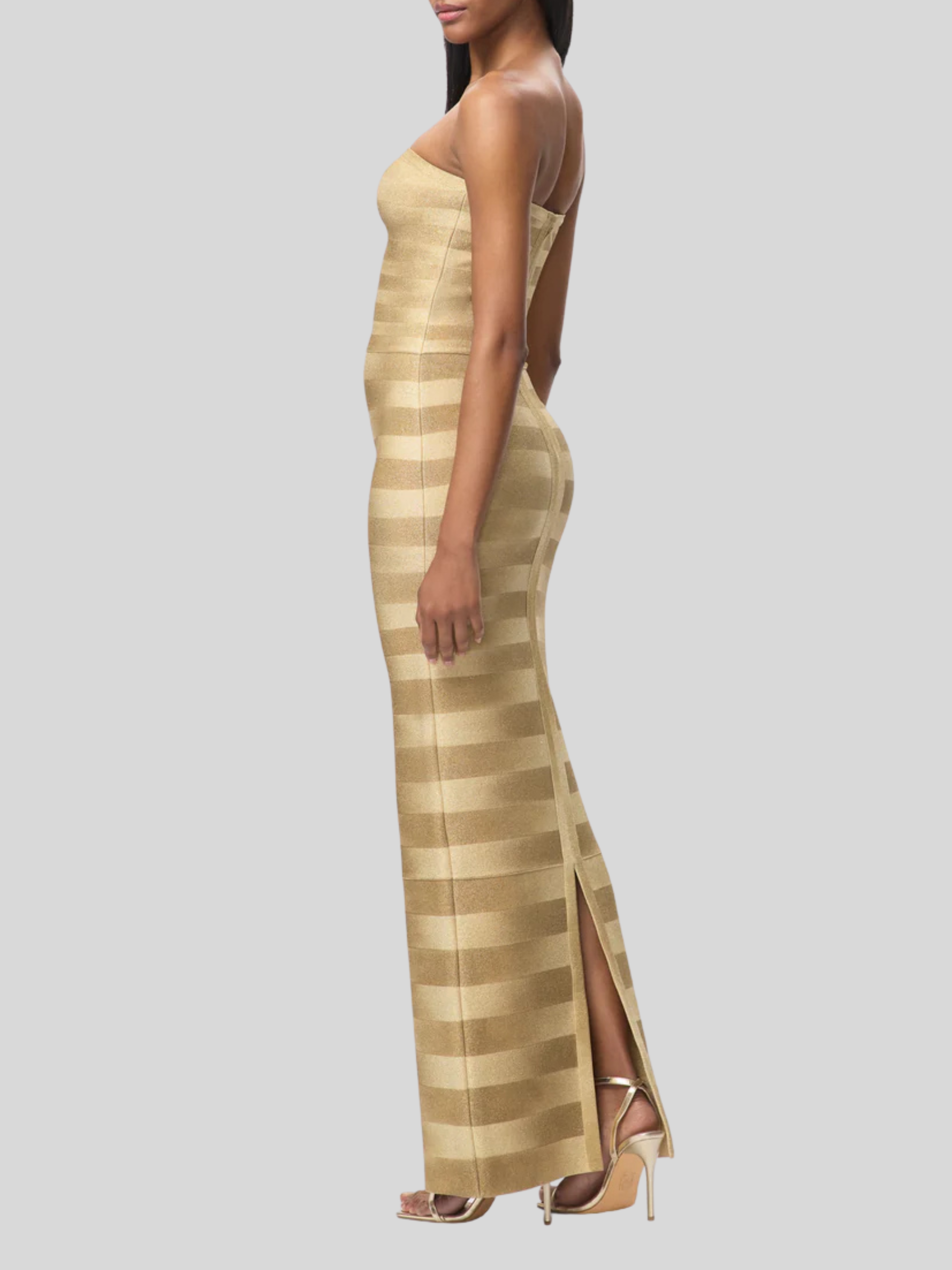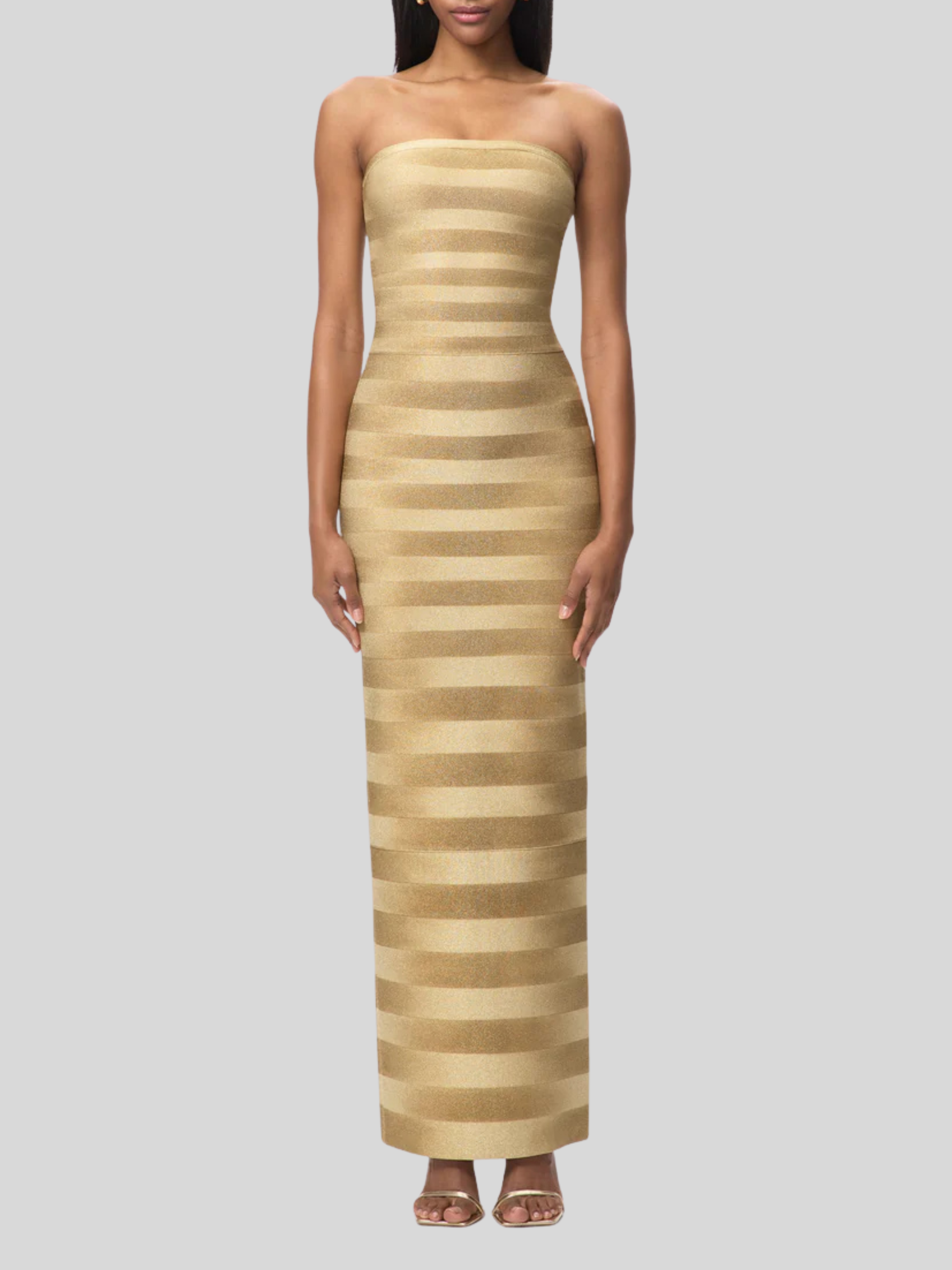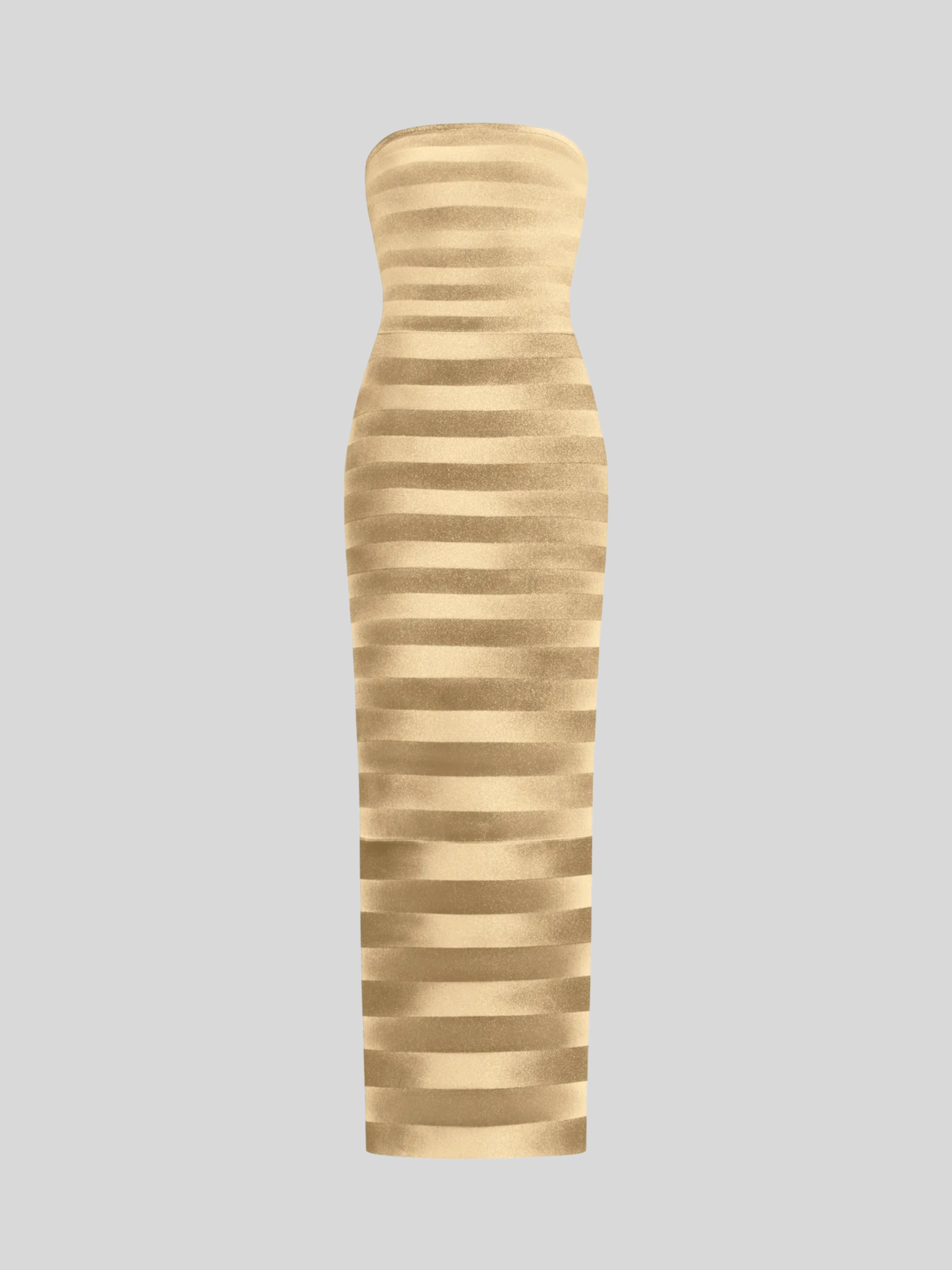 The Nia Gown, as seen in Look 5 of the Resort '26 Lookbook, is a strapless column silhouette in a body-contouring compact knit. The ankle-length design features an ombré bandage effect and is finished with a back slit and center-back zip.