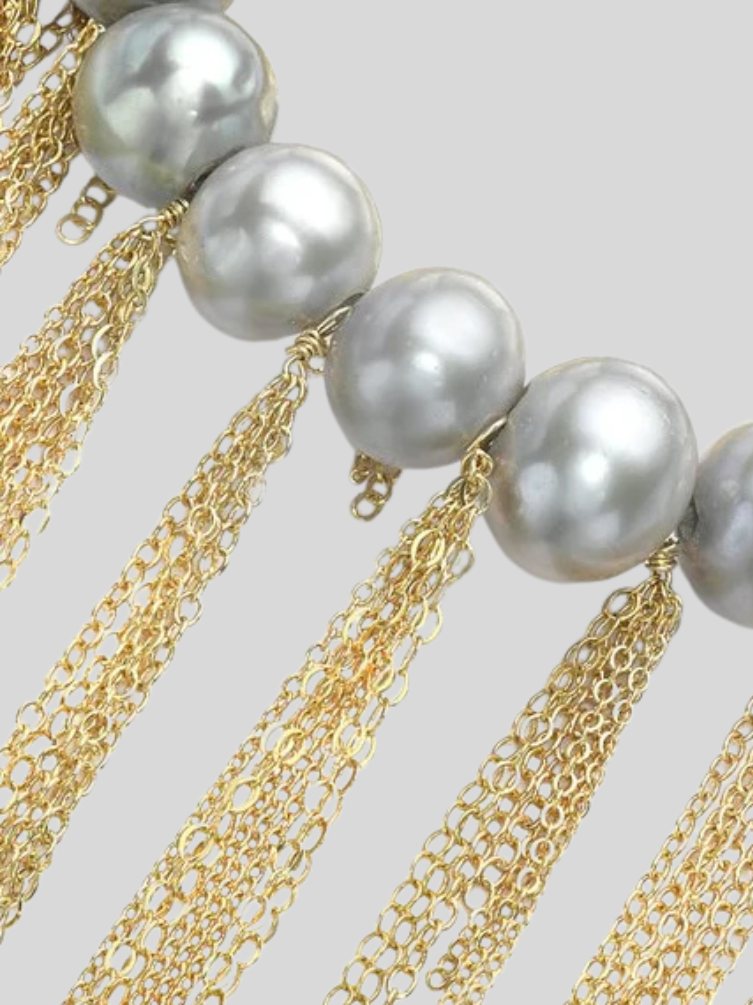 Elevate your elegance with this fringe bracelet featuring lustrous silver freshwater pearls delicately arranged along a refined yellow gold-filled chain. Its fluid design adds a touch of sophisticated movement, making it a perfect accessory for both day and evening wear. This bracelet seamlessly blends timeless craftsmanship with modern charm.