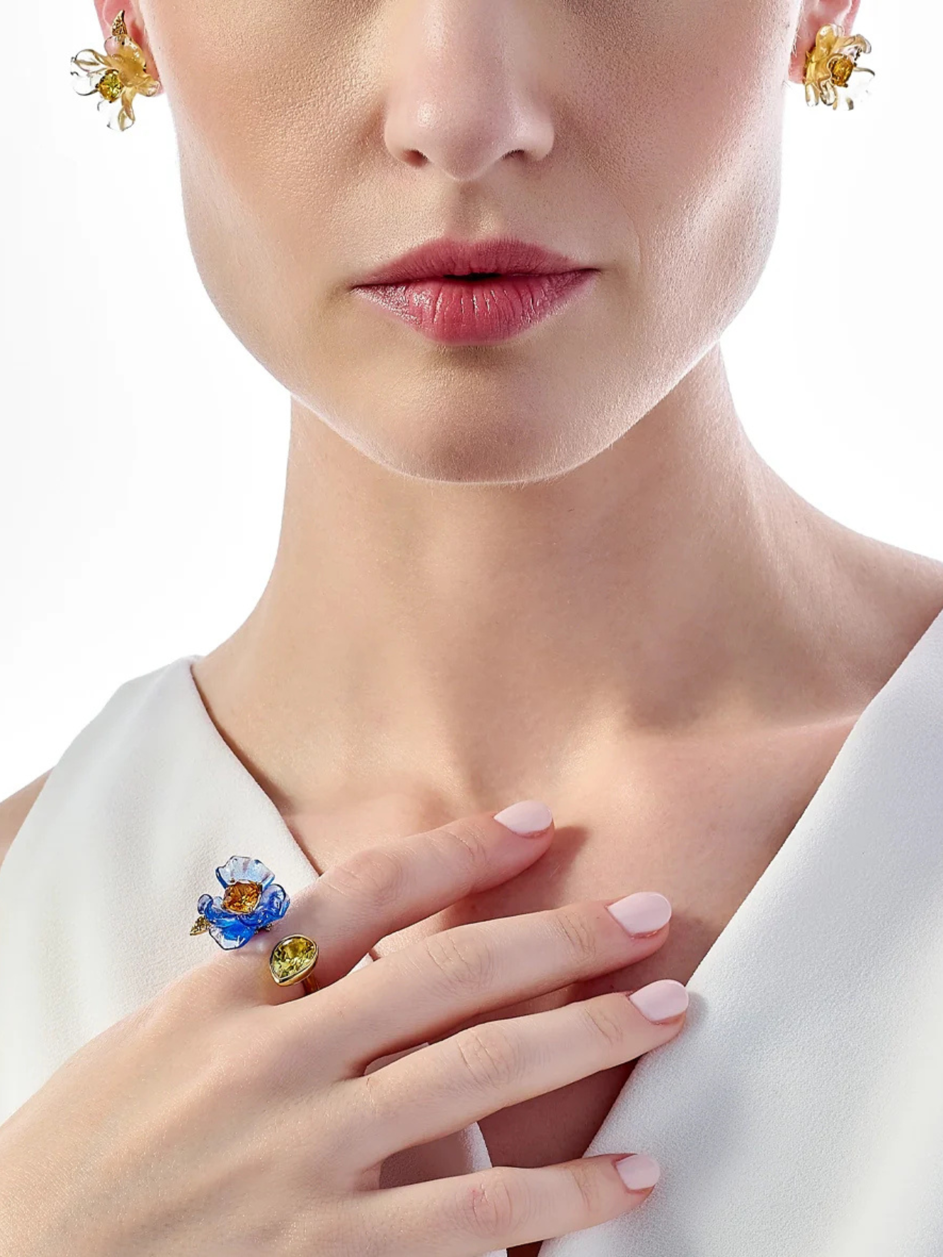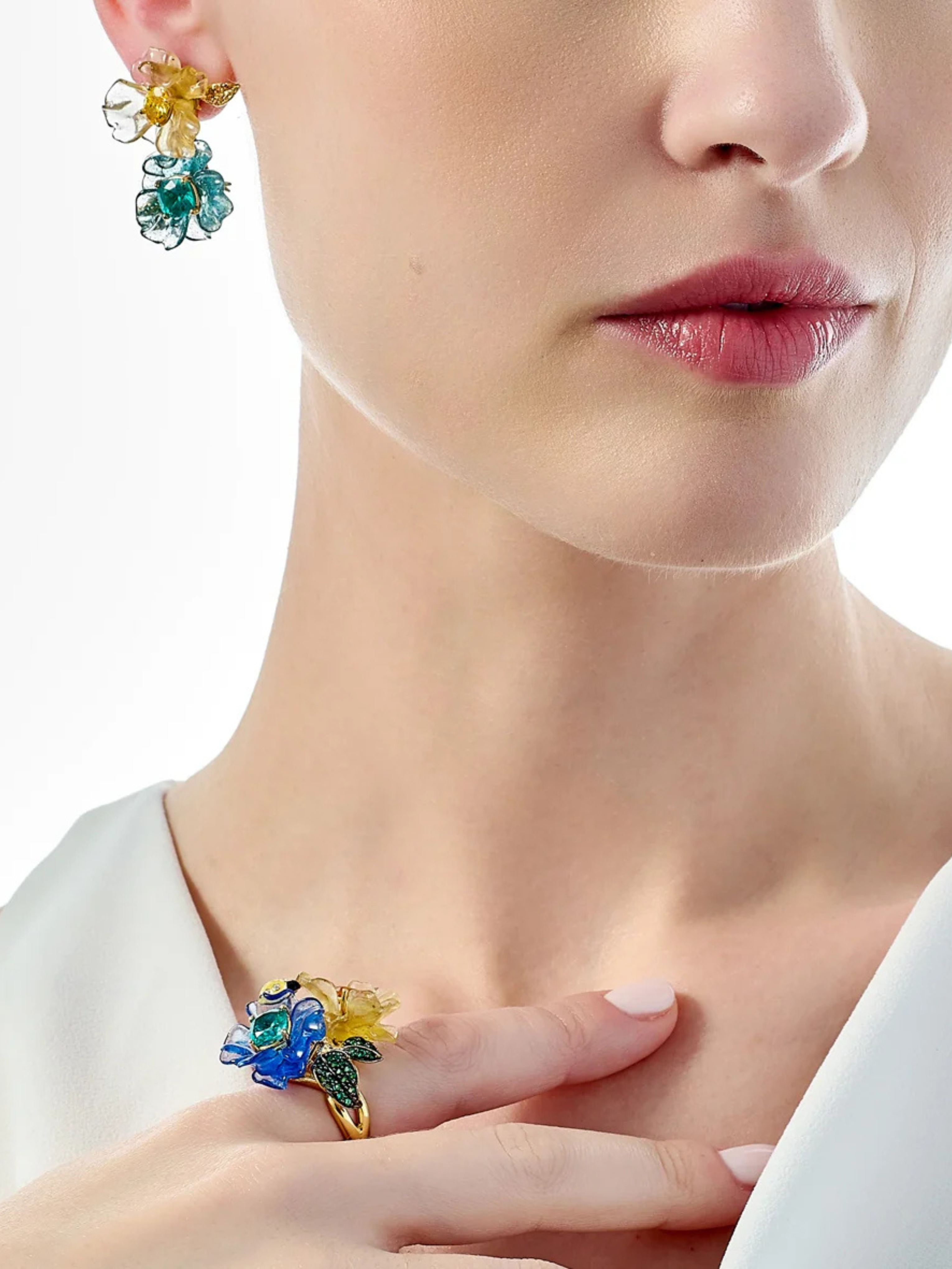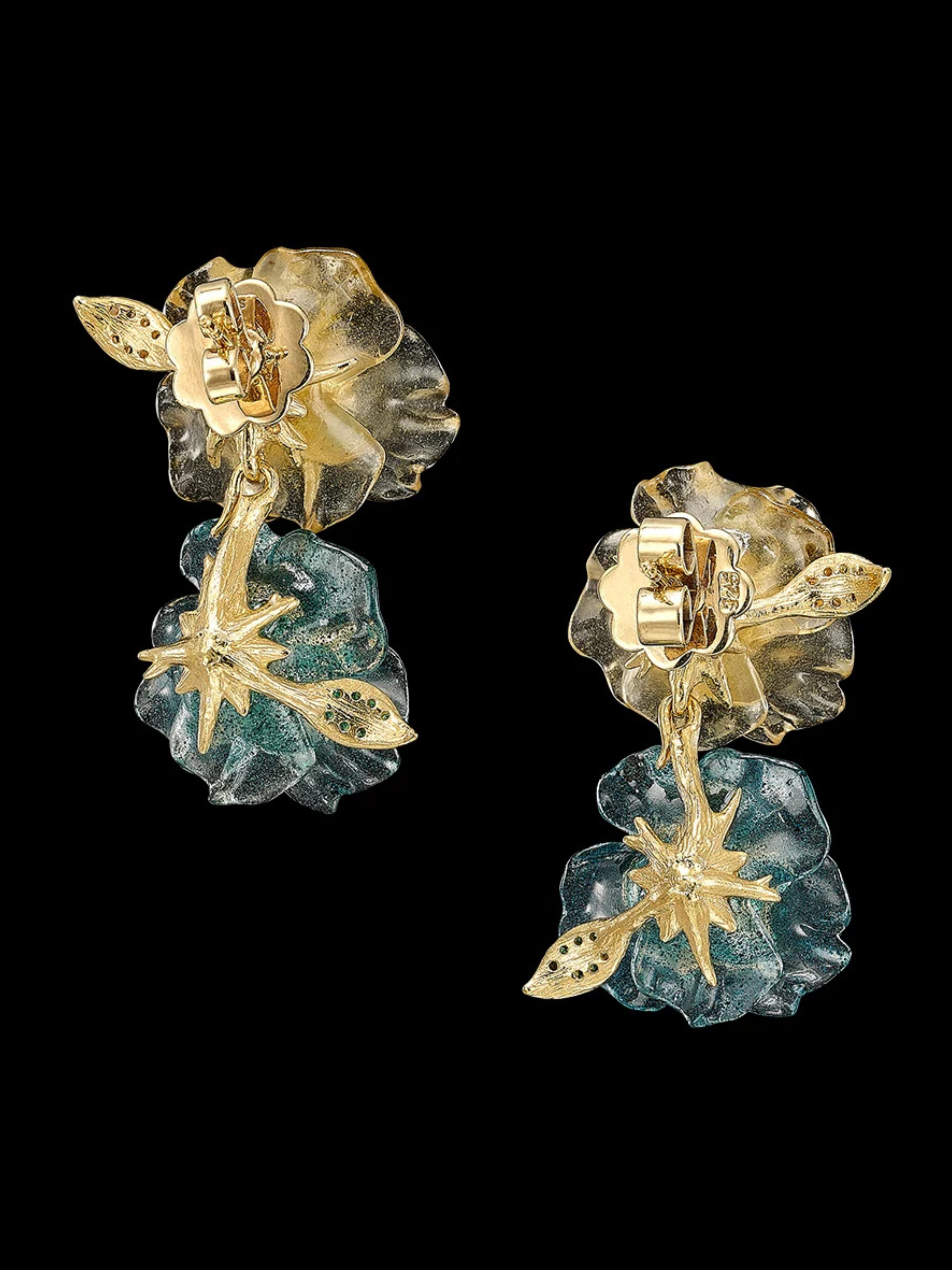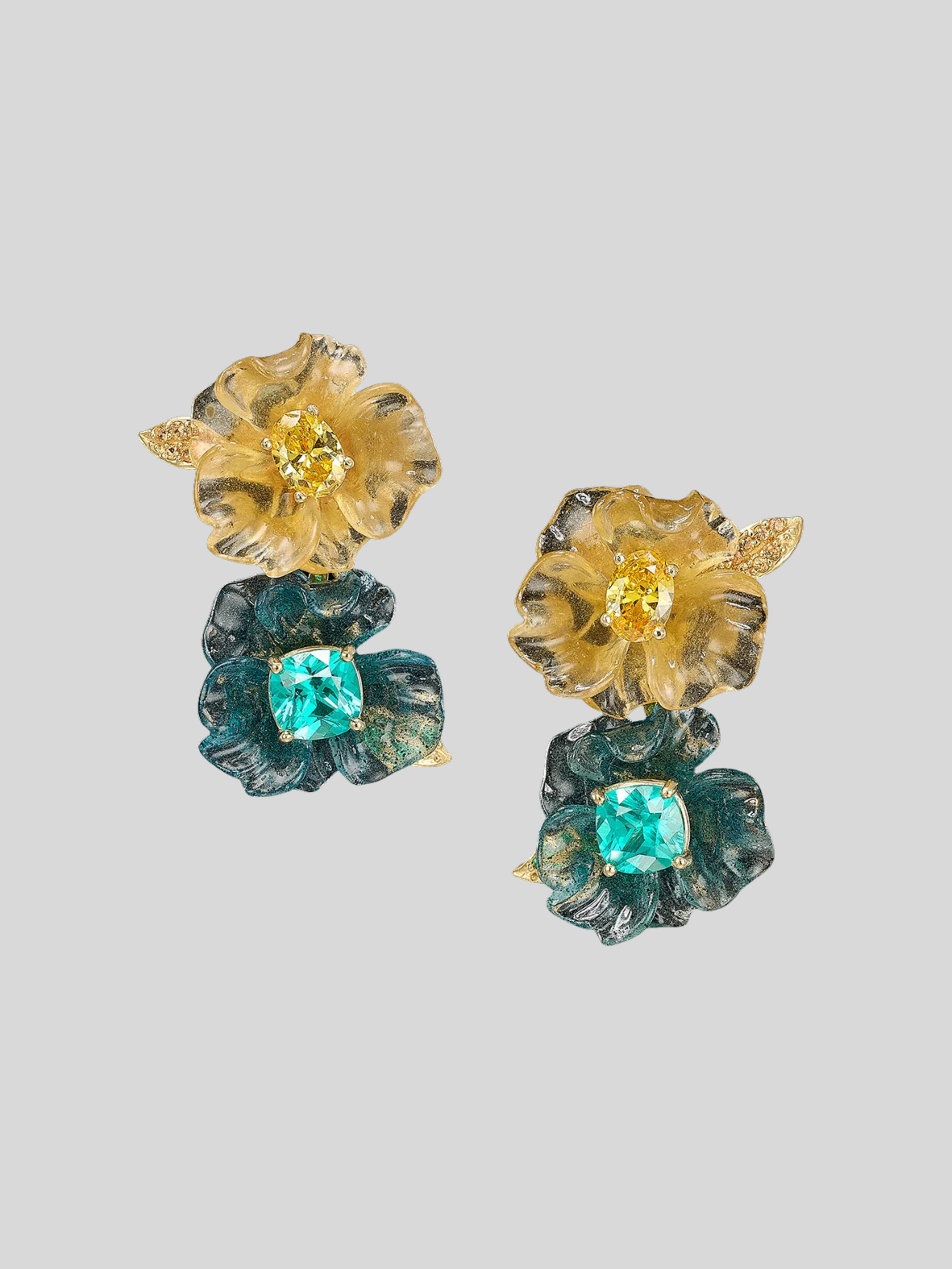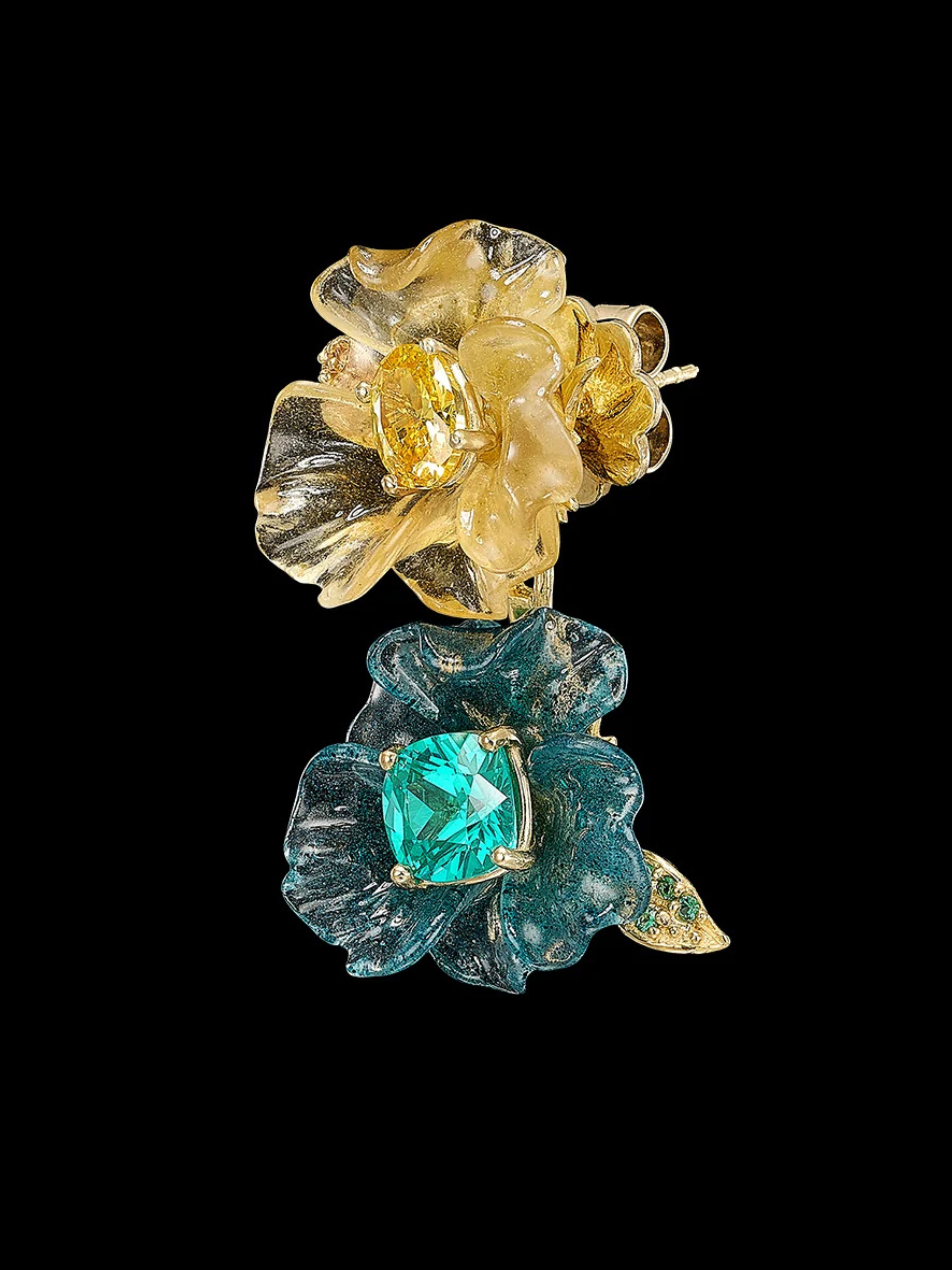The Paraiba Petunia Drop Earrings are handcrafted with Green Spirulina and Spinach Fruit Gems™, with chlorophyll contributing hues of green extracted from spirulina and plankton and hues of yellow from carotenoids in spinach; casted in the form of petunia flowers, hand-set with a pair of laboratory-grown paraiba tourmalines and yellow sapphires, with delicate golden leaves pave-set with yellow sapphires.