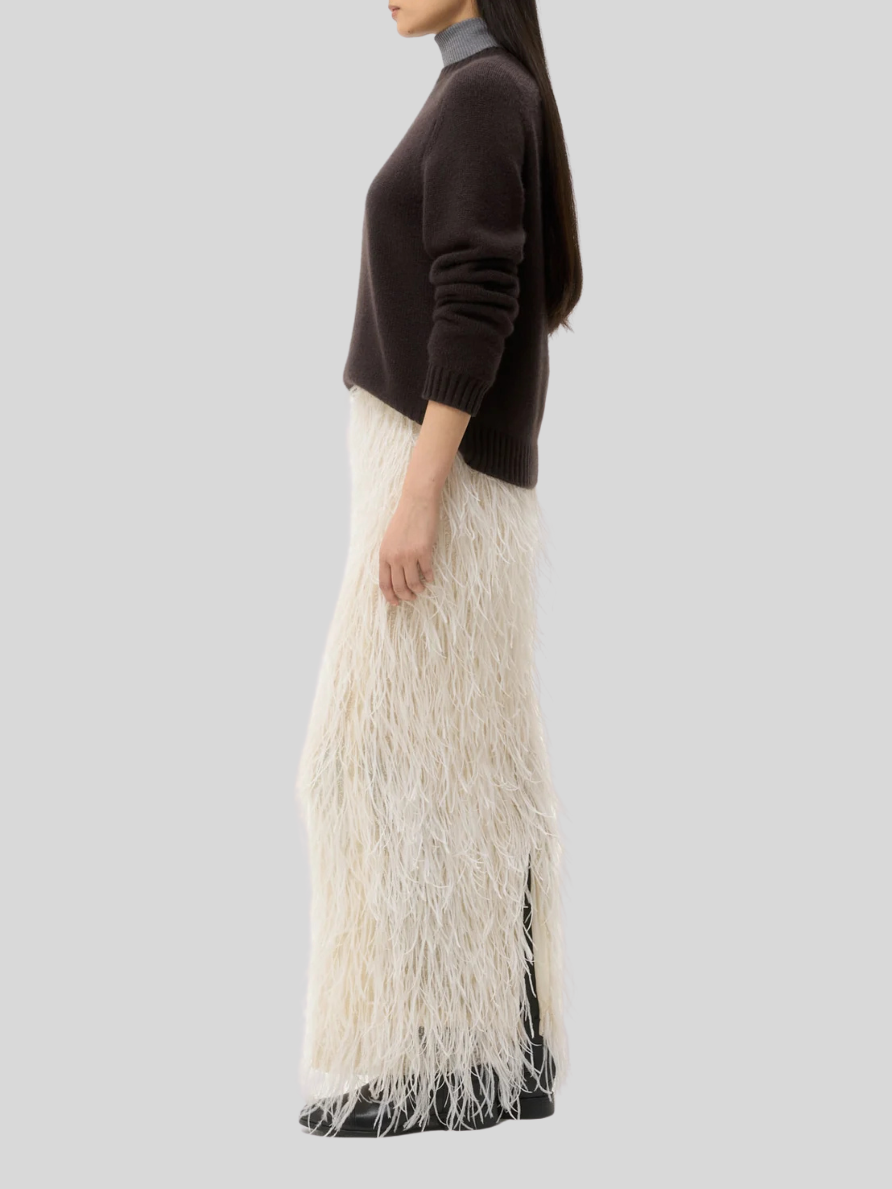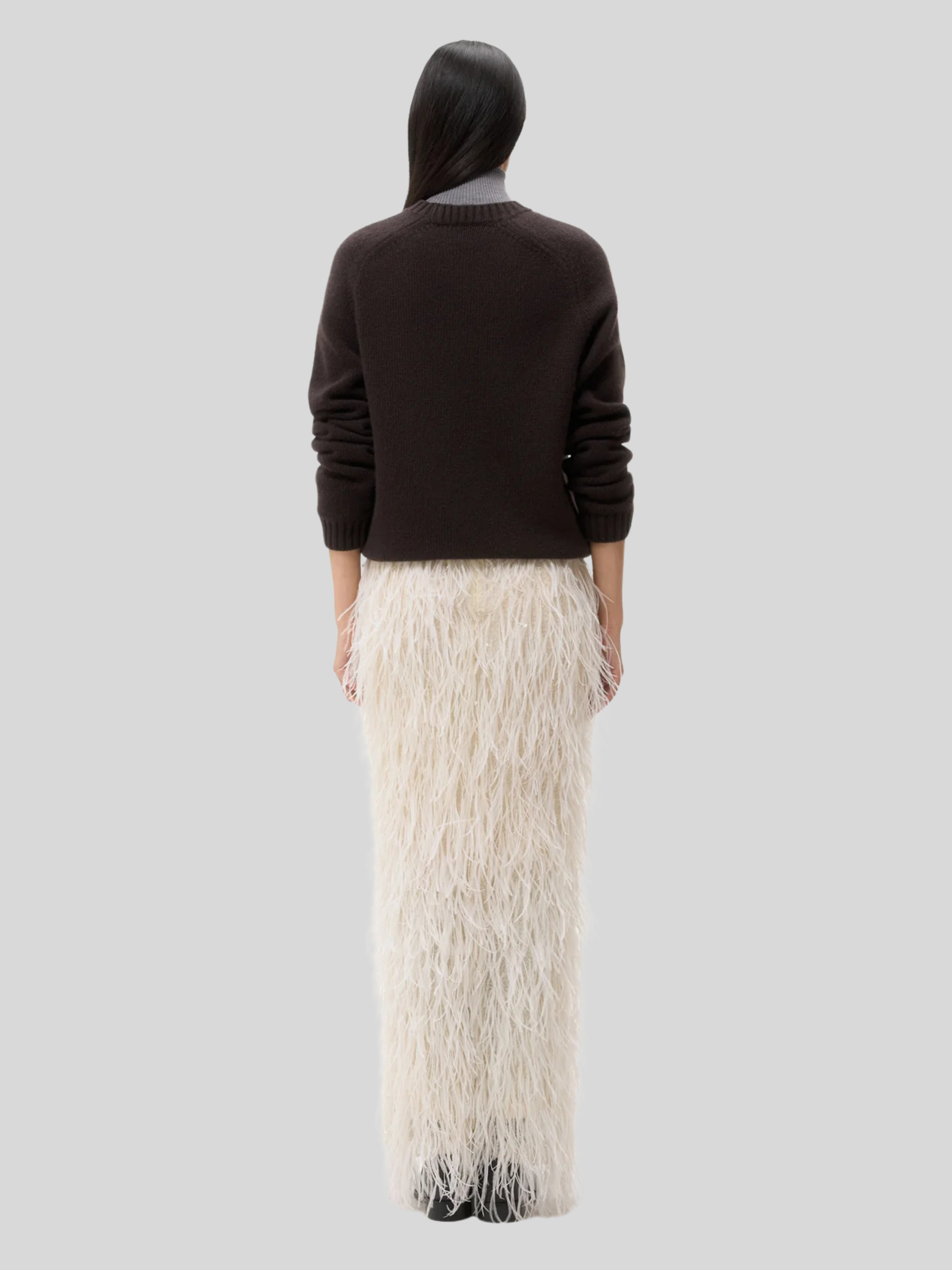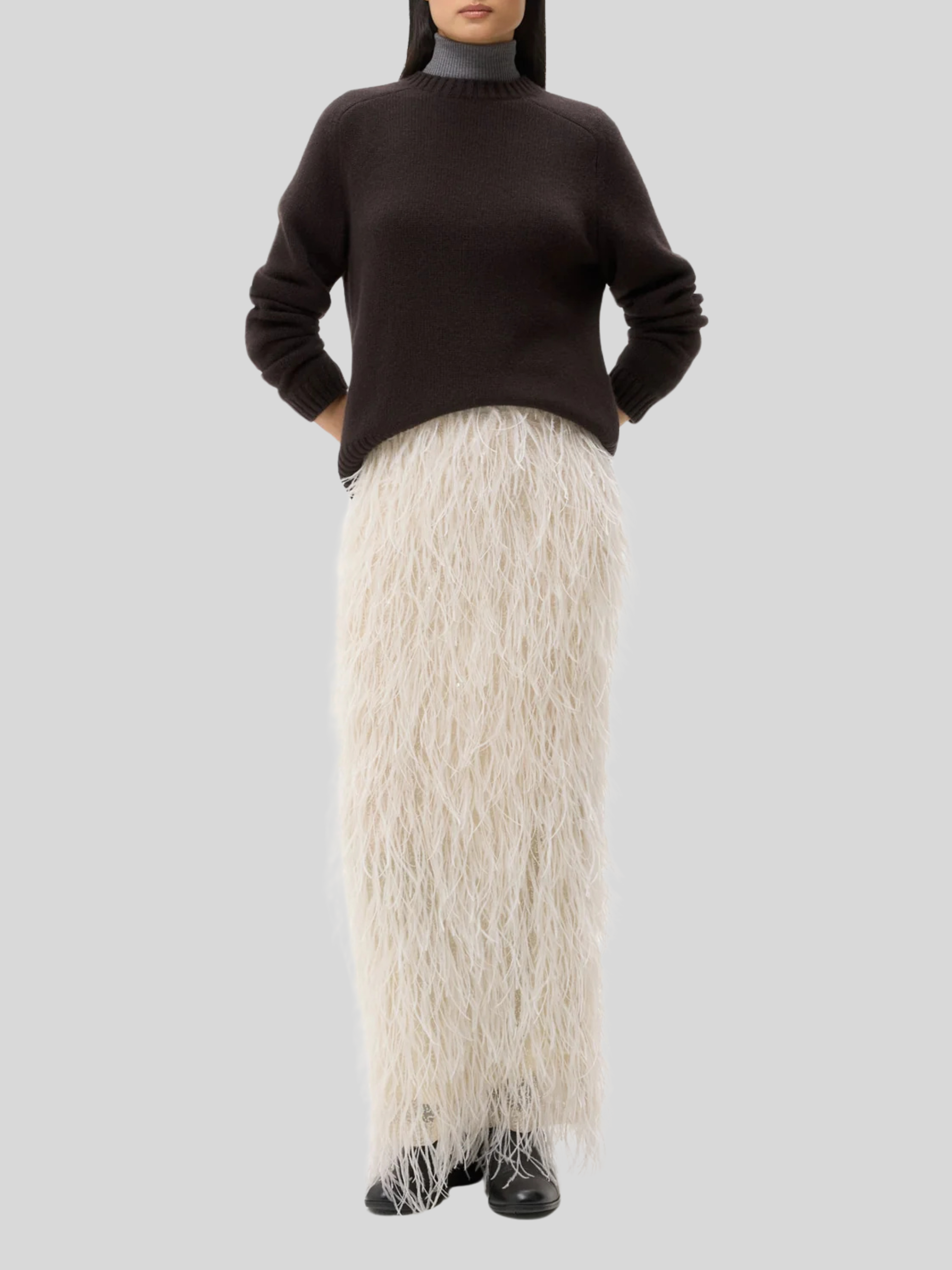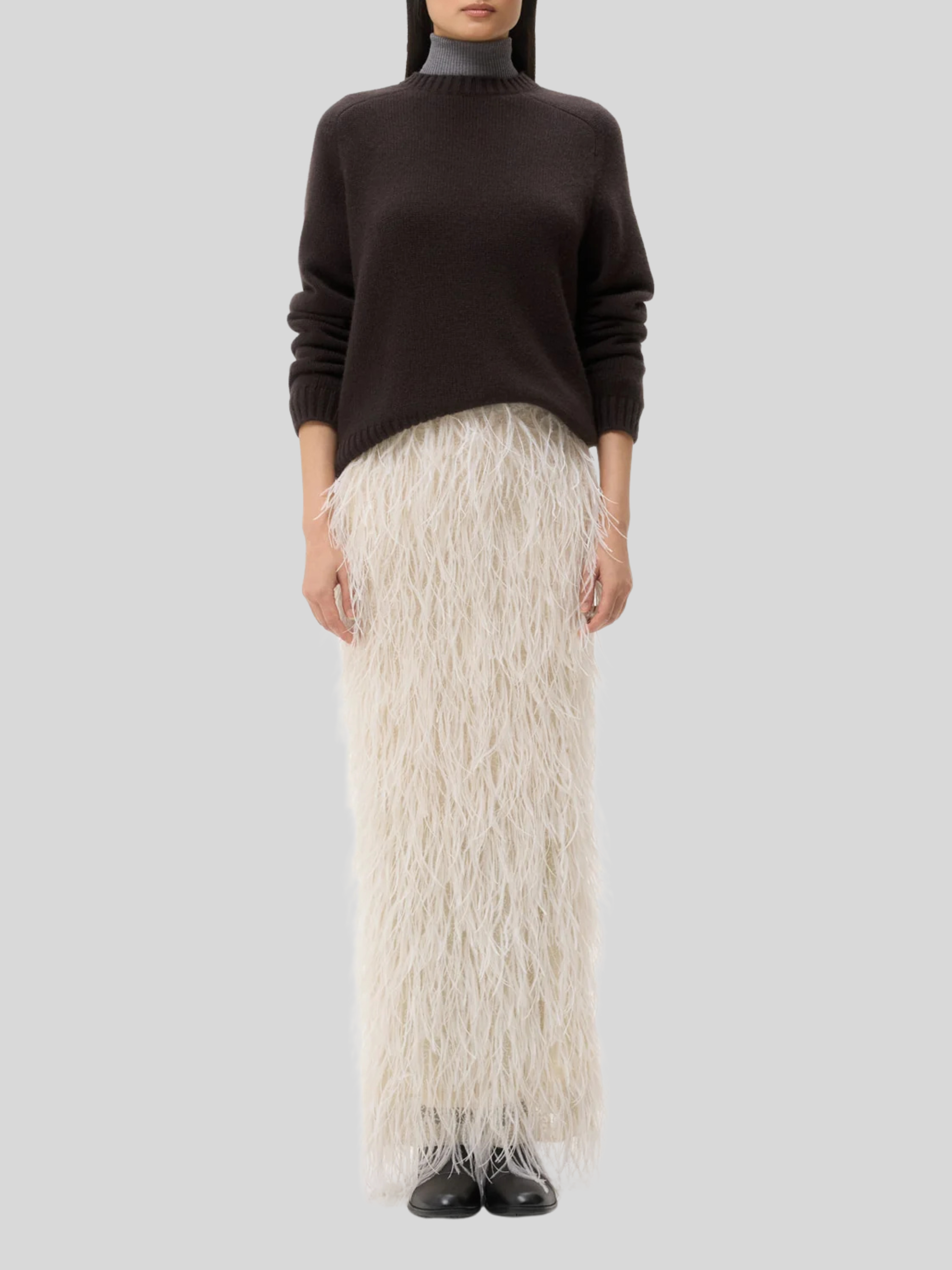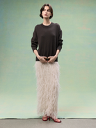 Mid-length skirt lined in silk georgette and embellished with glass beads and ostrich feathers on mesh. Light as a Feather has a fitted silhouette with a mid-rise waist. Complete with a back slit and hidden zipper.