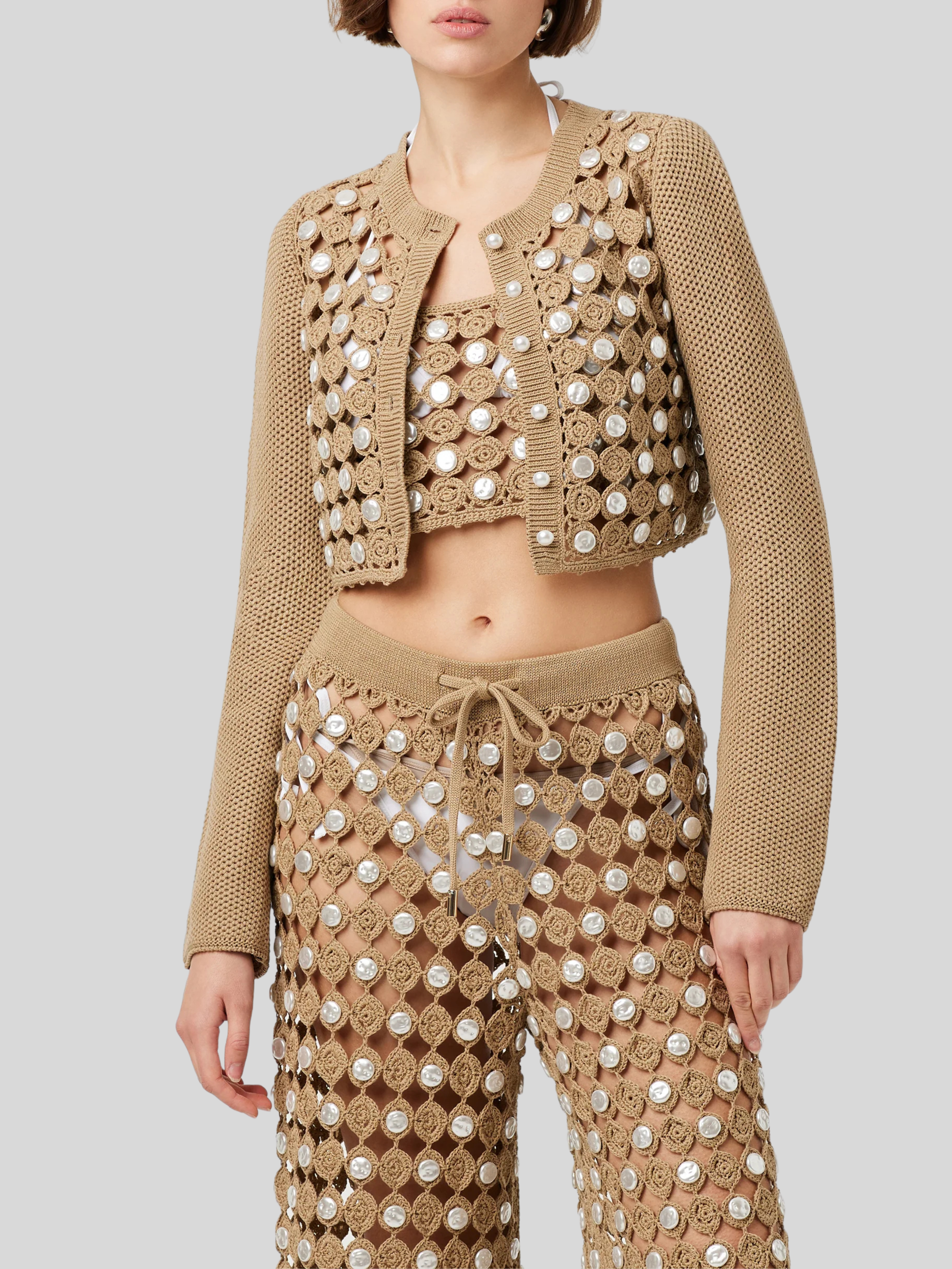 Noah Long Sleeve Cardigan with Pearls in Sand