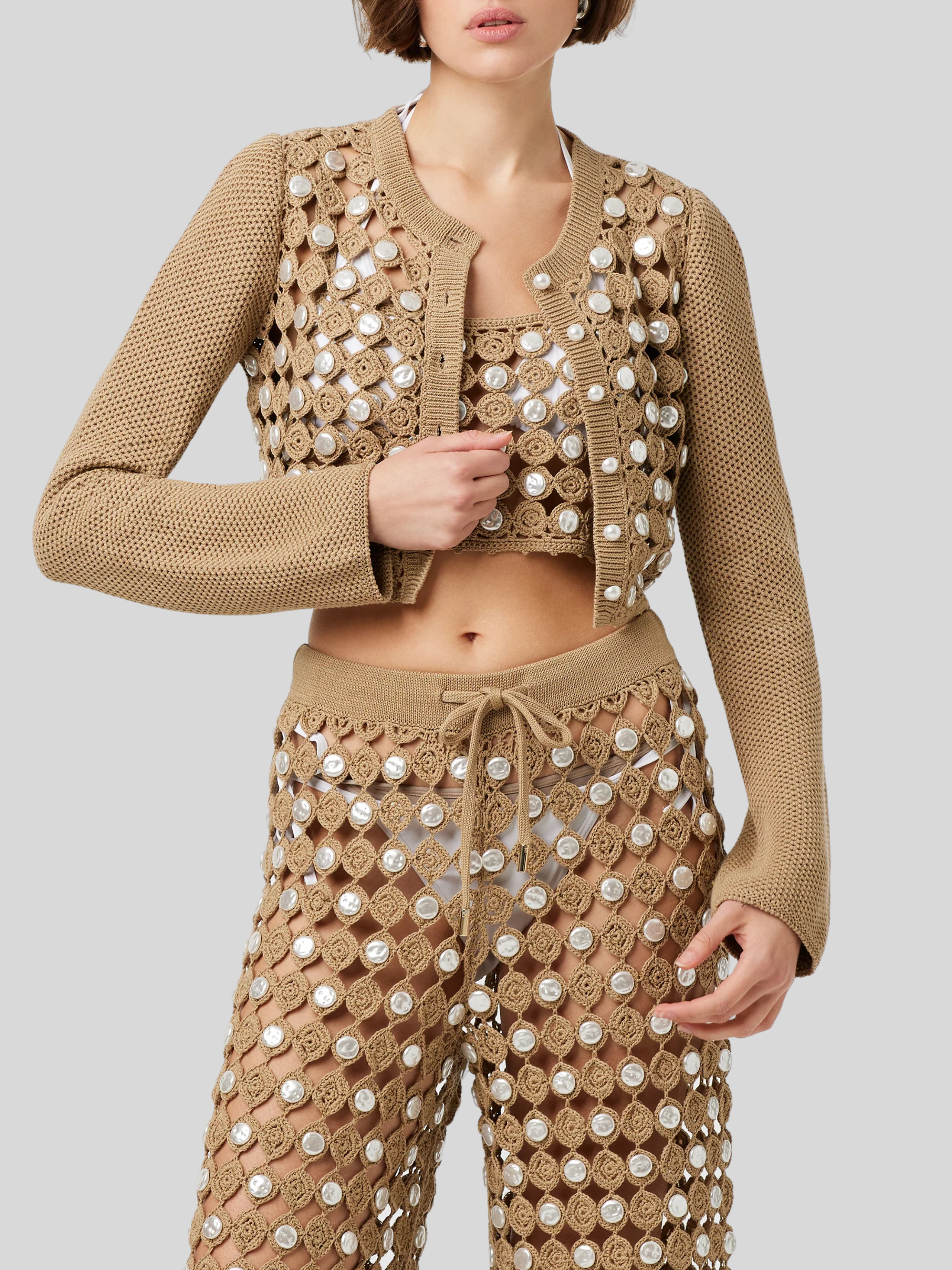 The Noah Crochet Front Crop Cardigan adds elegance to any look. With pearl embellishments and a chic long-sleeve cropped fit, it’s the perfect lightweight layer for summer styling.