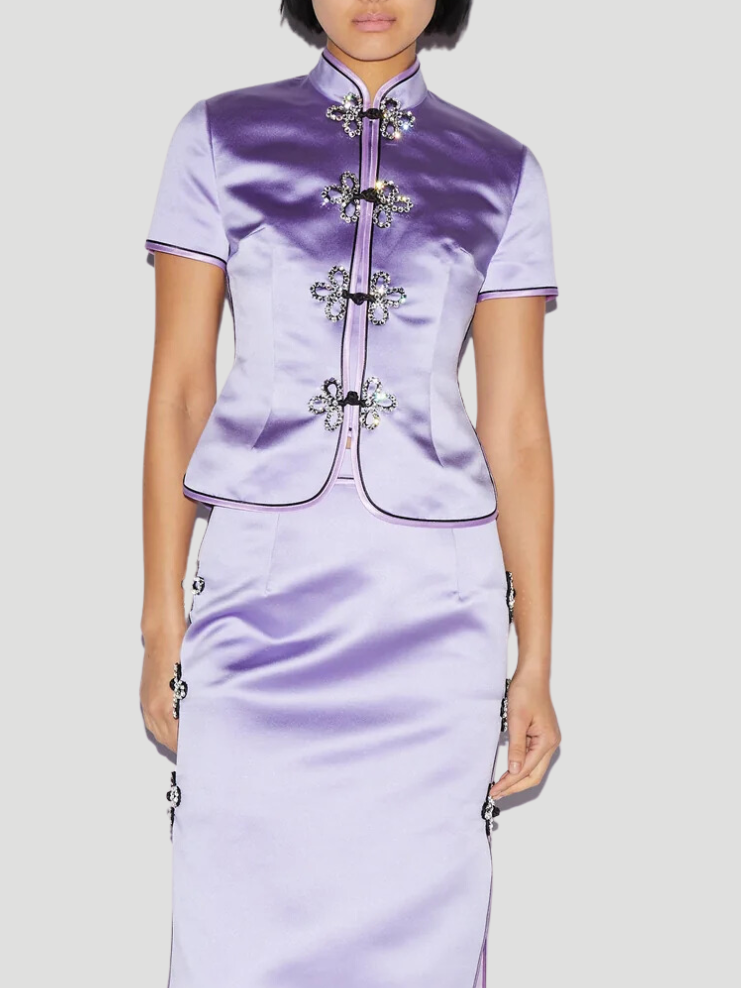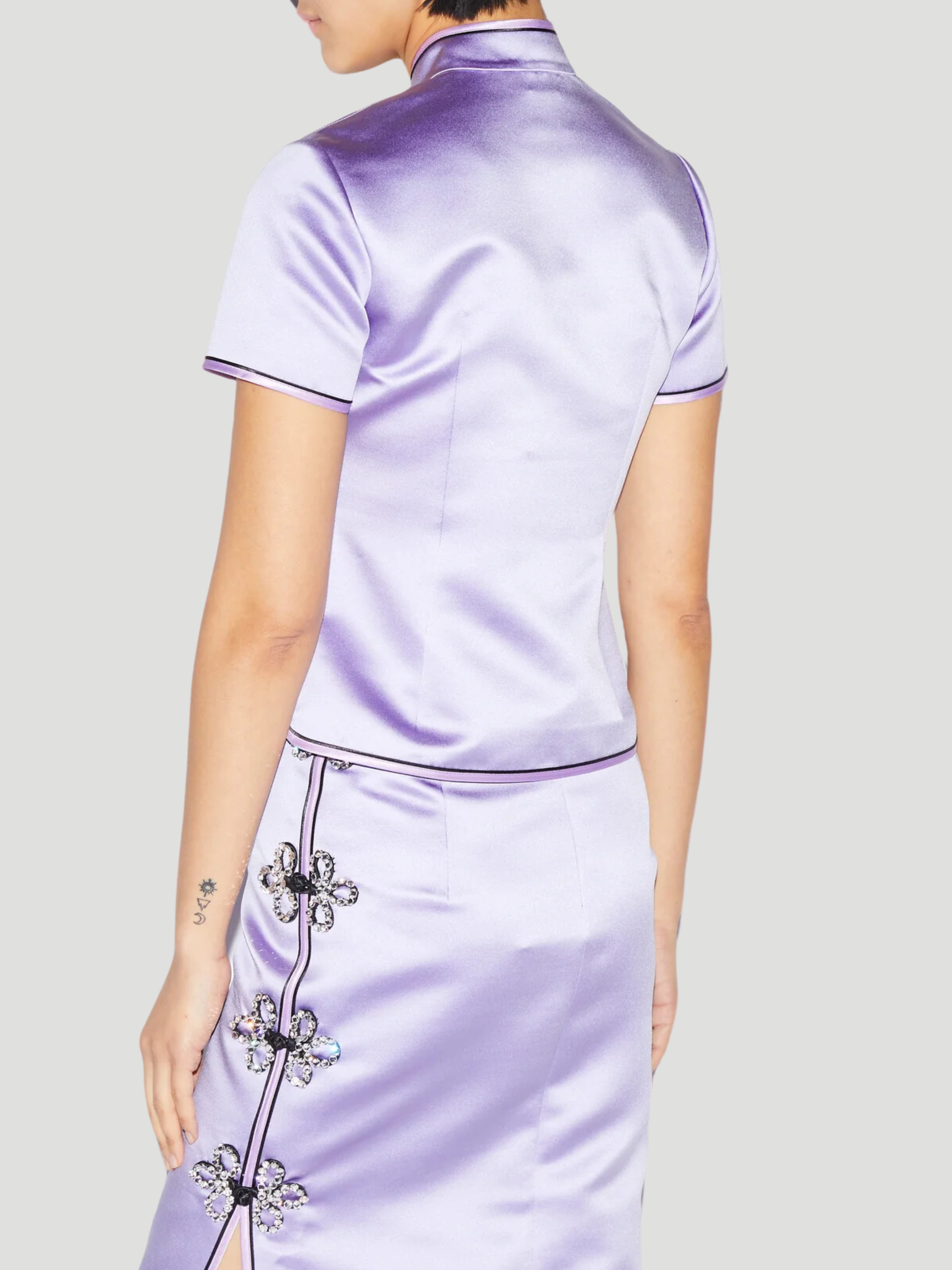 Elevate your style with the Danny Crystal-Embellished Satin Top by Huishan Zhang. Made from shiny lilac satin, this modern take on the traditional cheongsam features contrast black piping and crystal embellished qipao knot buttons for a touch of elegance. Perfect for any occasion.