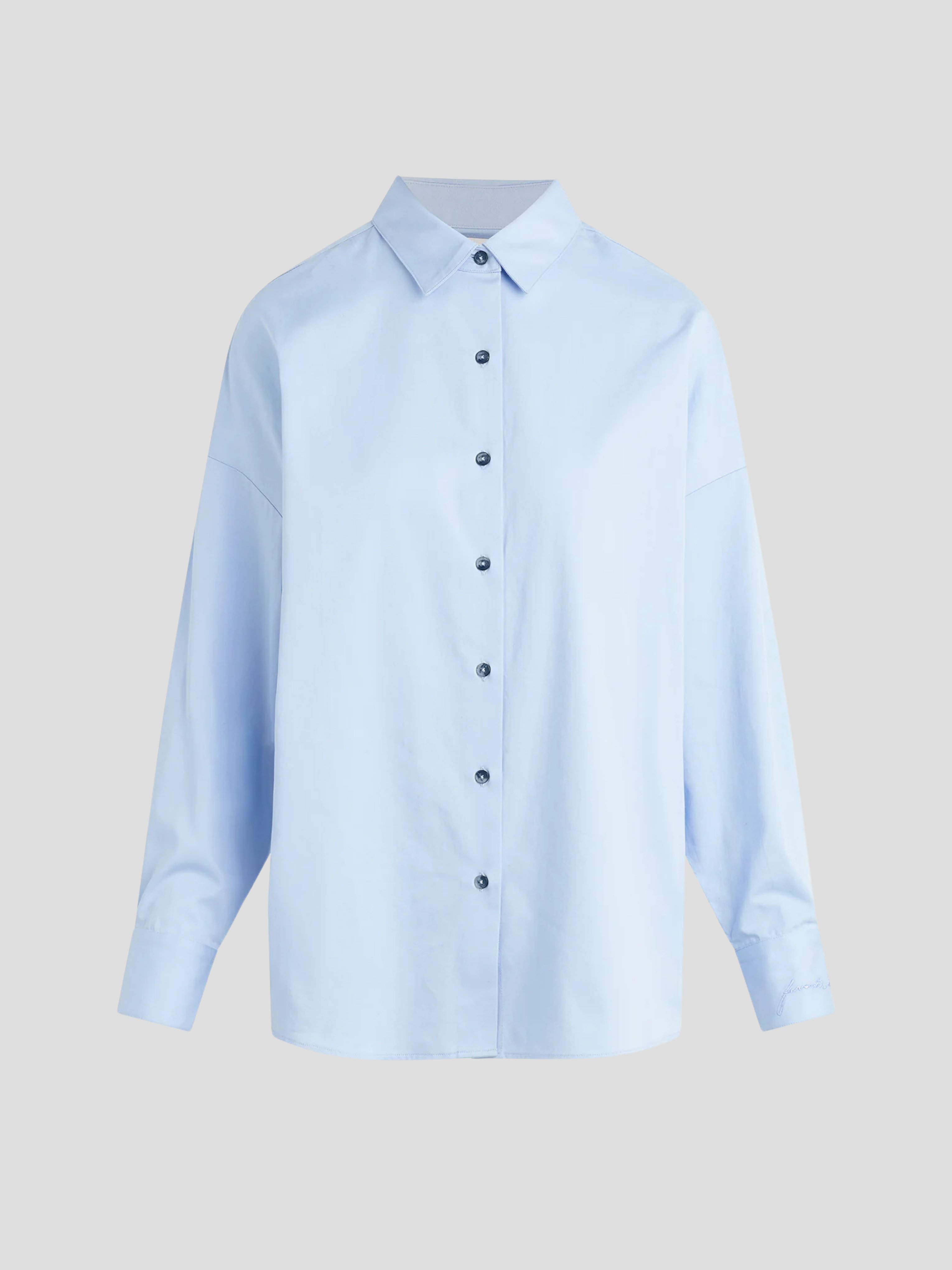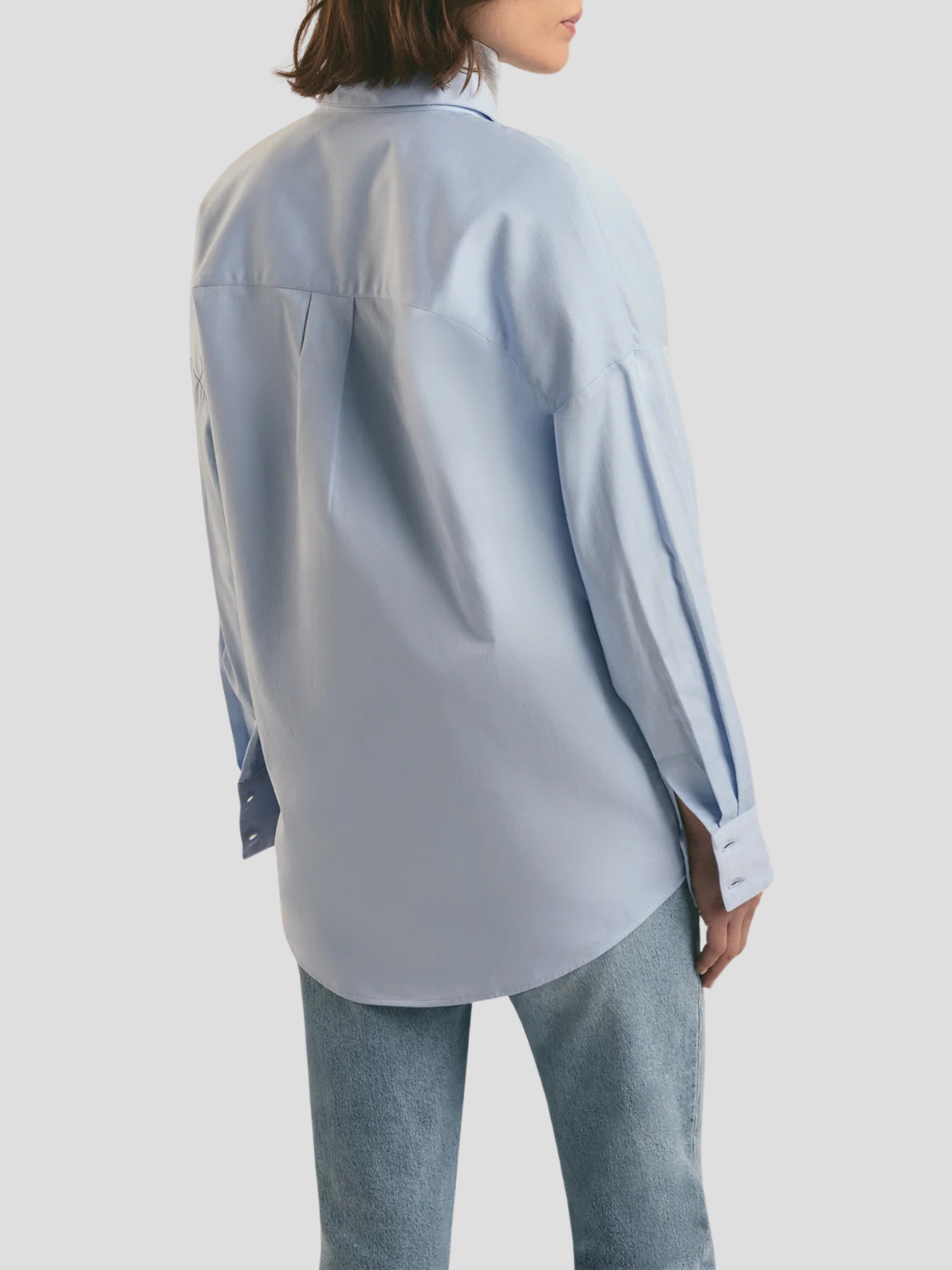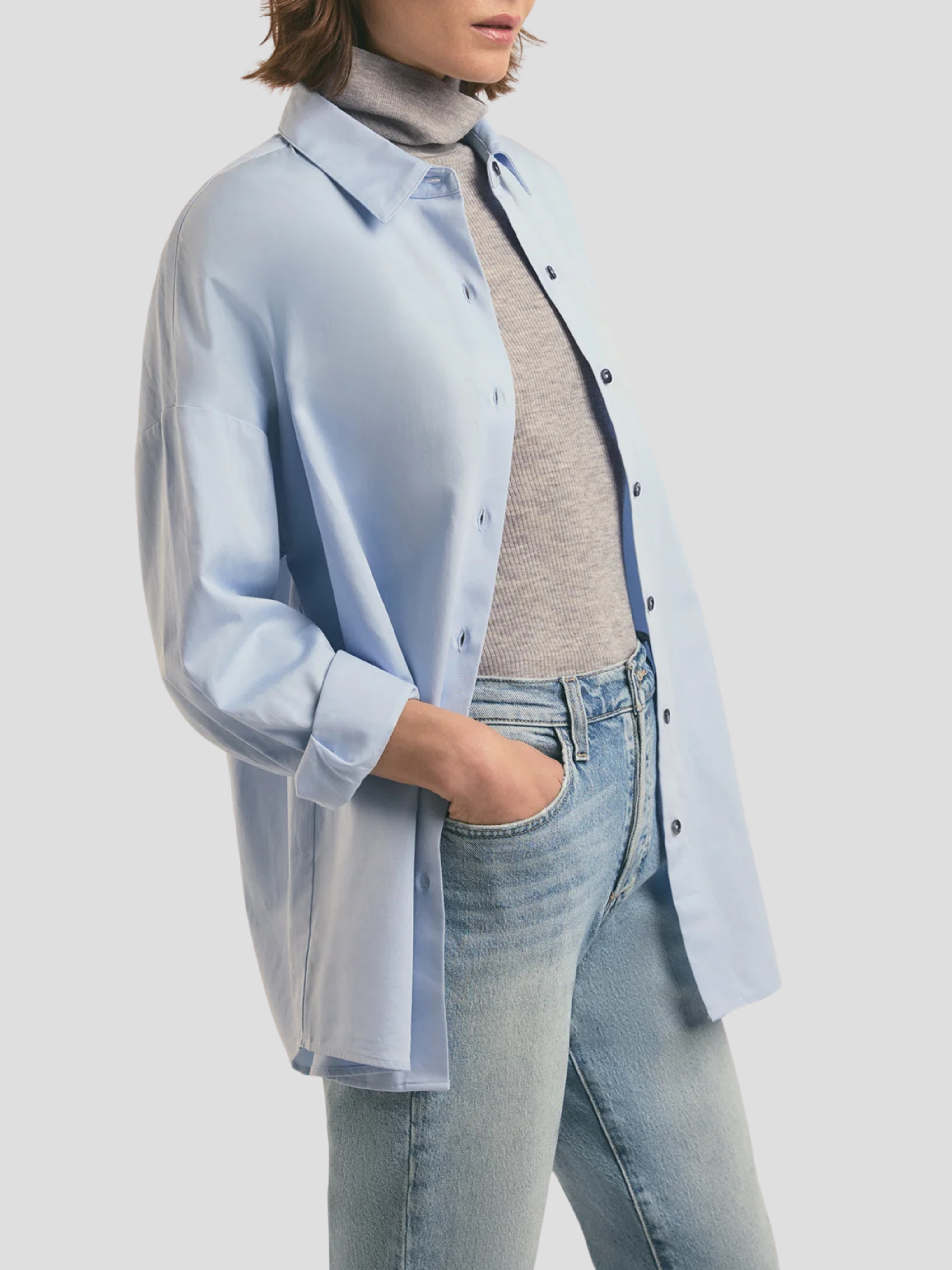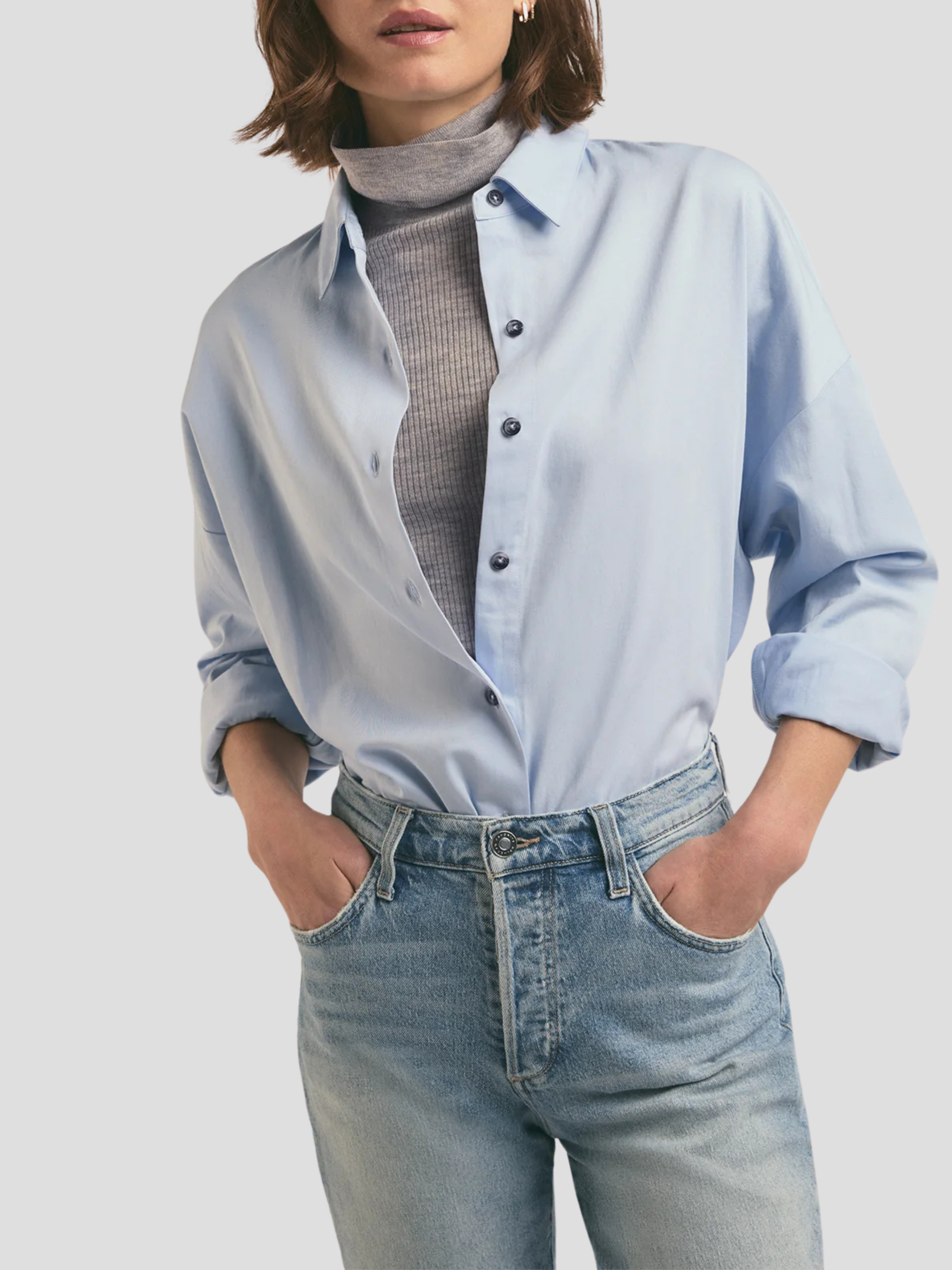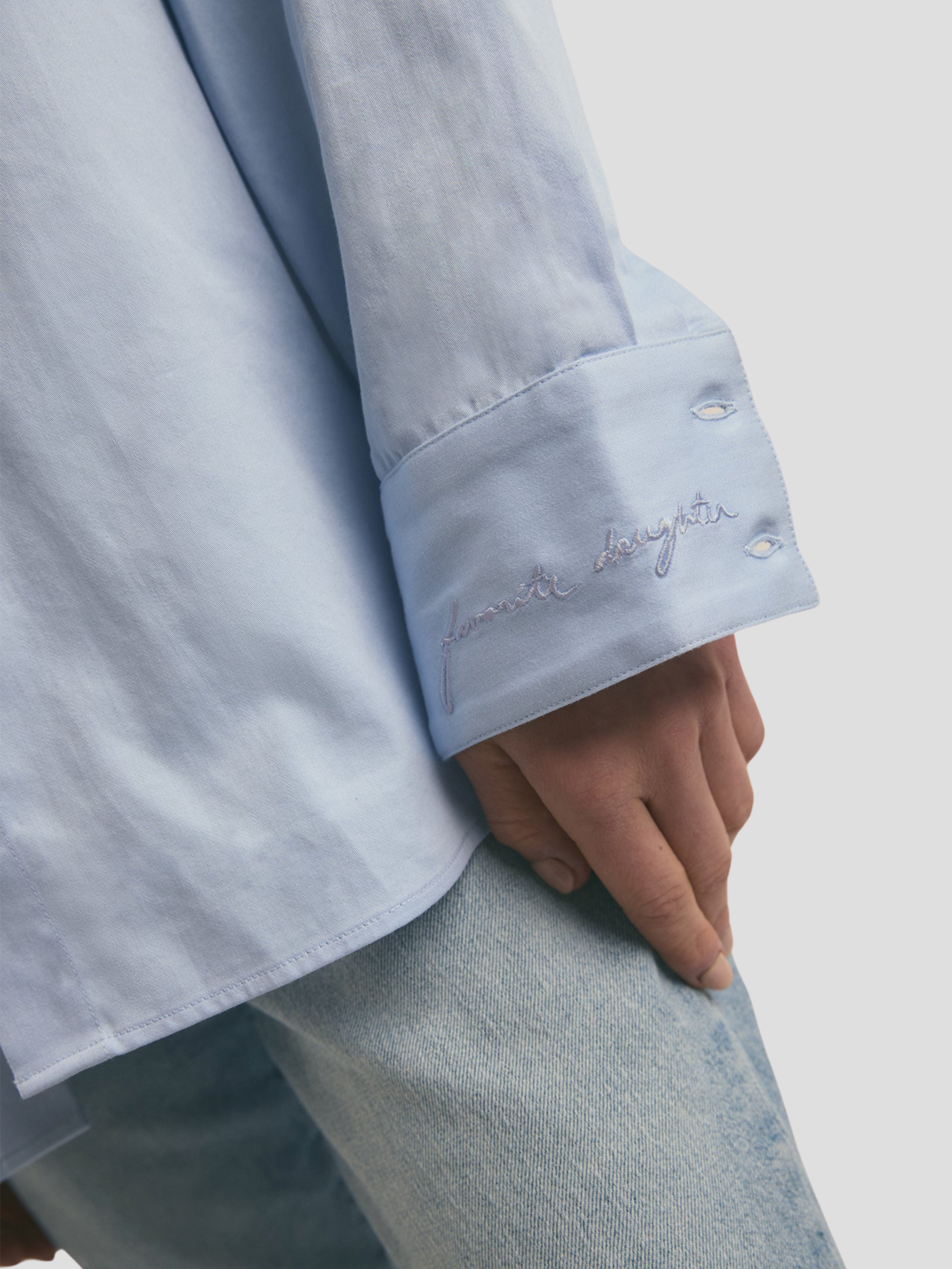 Take your wardrobe to the next level with The Ex Boyfriend Shirt in Blue from Favorite Daughter. Featuring a relaxed fit and pointed collar, this oversized button up is made of a soft cotton satin and boasts our signature embroidery on the sleeve cuff. Whether you prefer it tied, tucked, half-tucked, or unbuttoned, this versatile Powder Blue shirt is a must-have for any fashion lover.