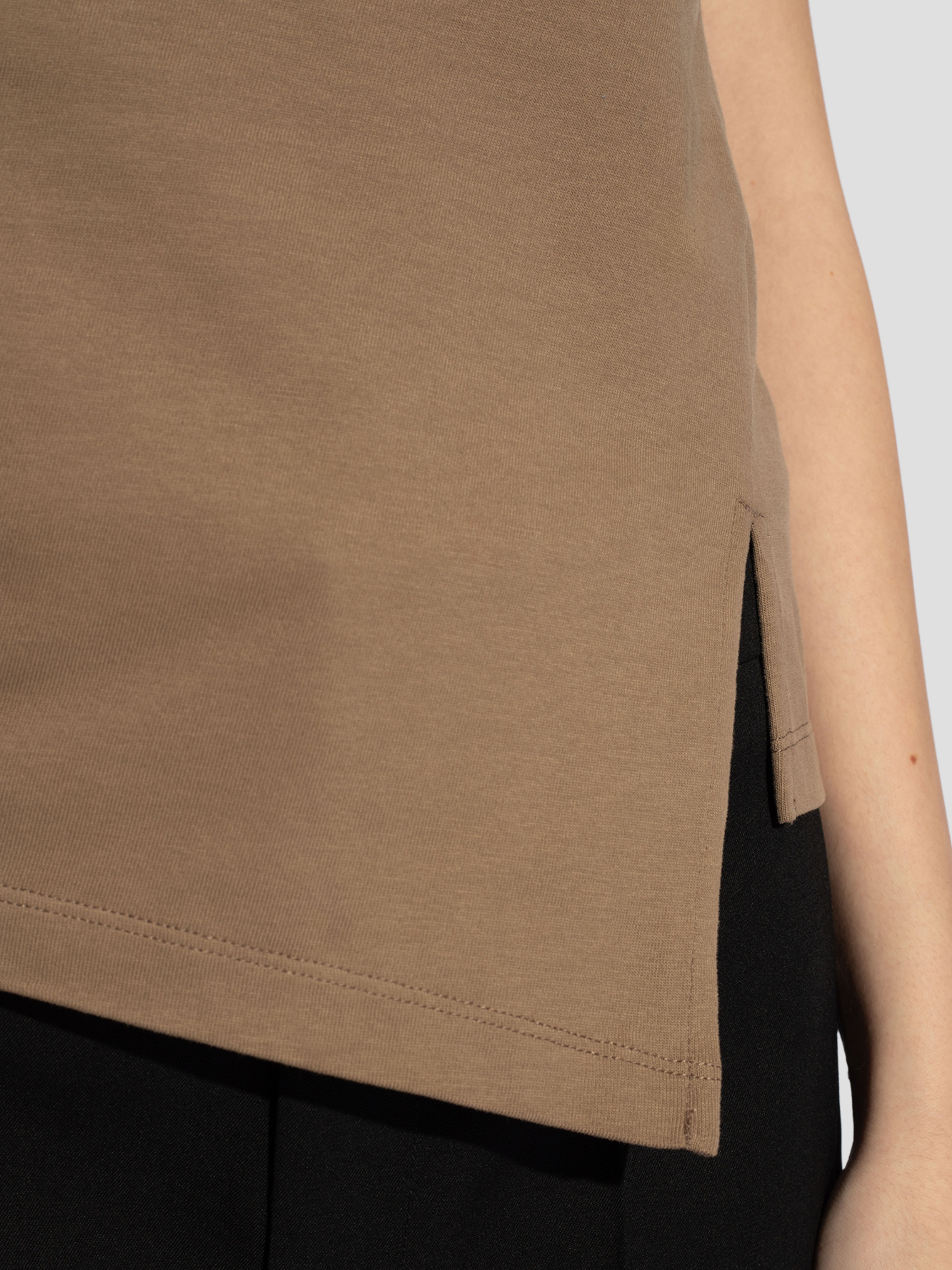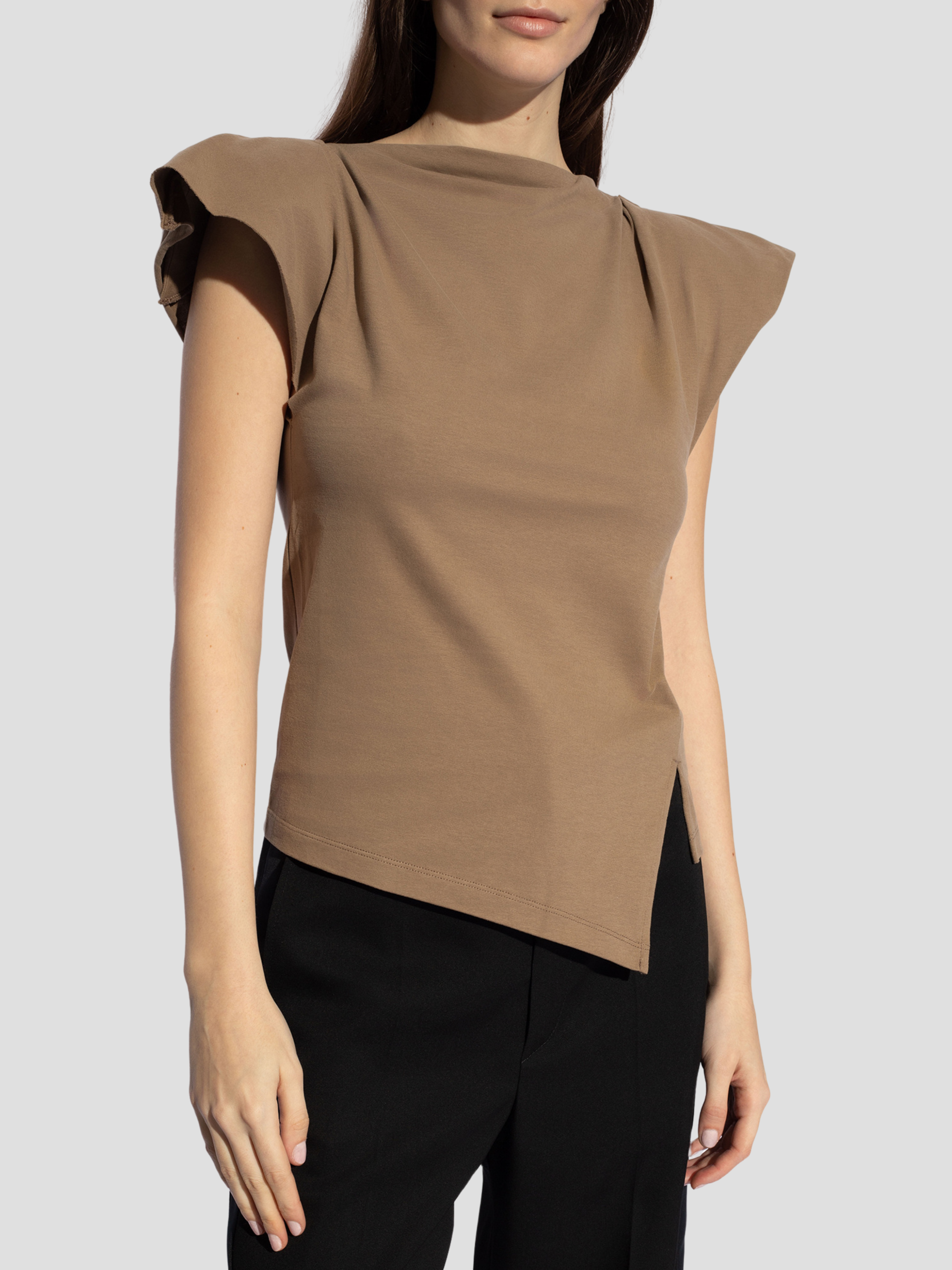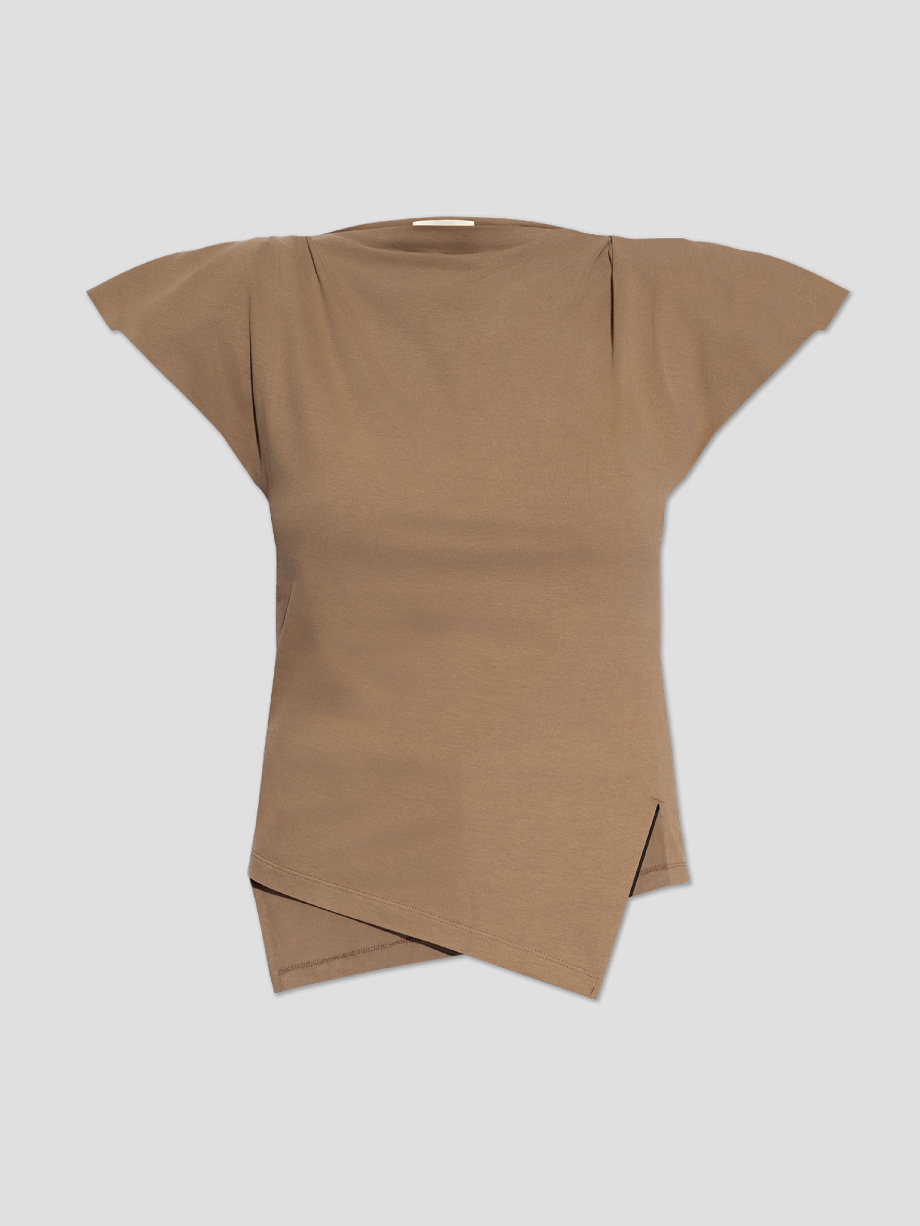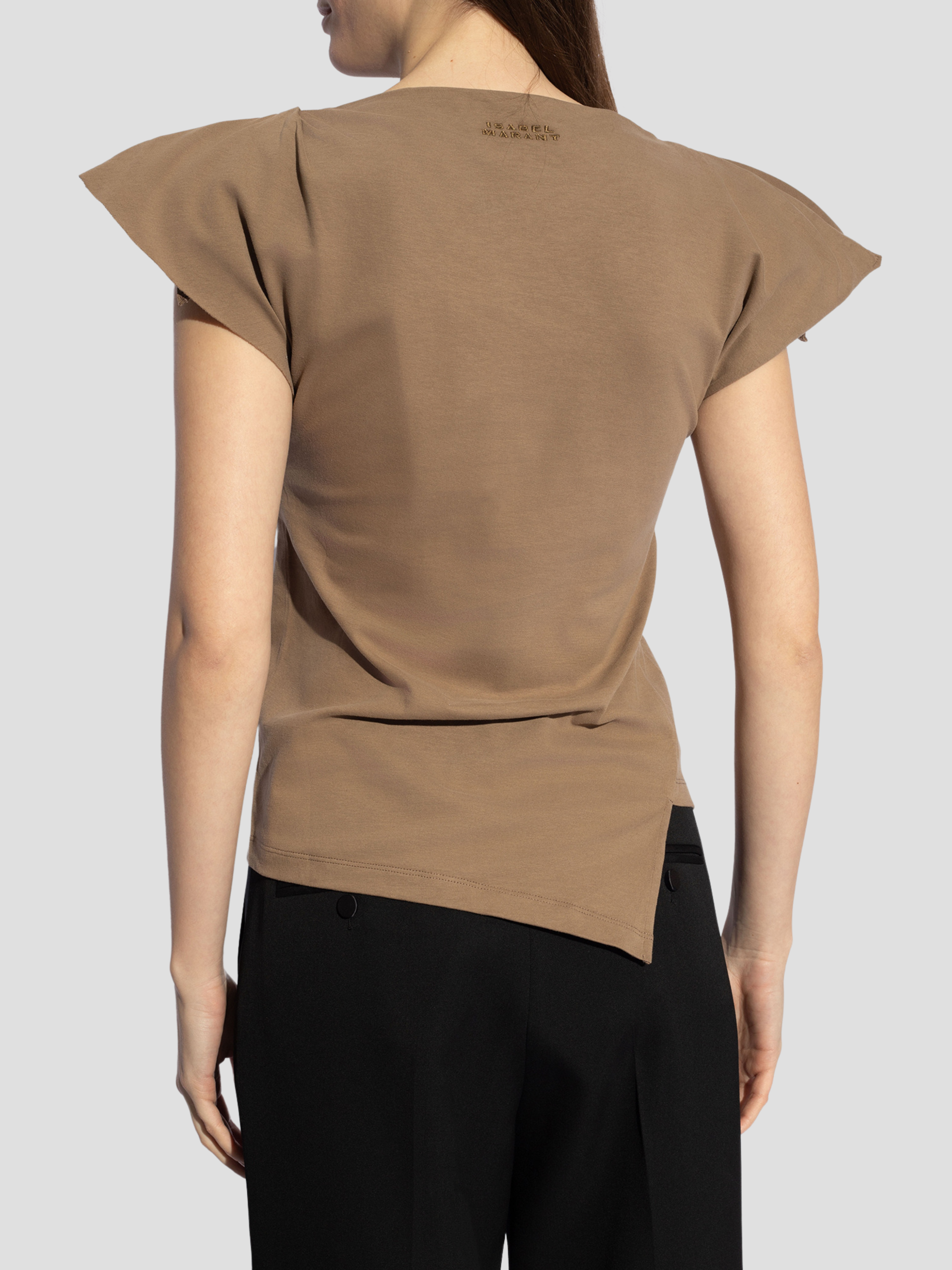 Khaki ‘Sebani’ T-shirt from Isabel Marant. Made of cotton, this design features padded shoulders, logo embroidery at the back, raw trims and a slit at the hem.