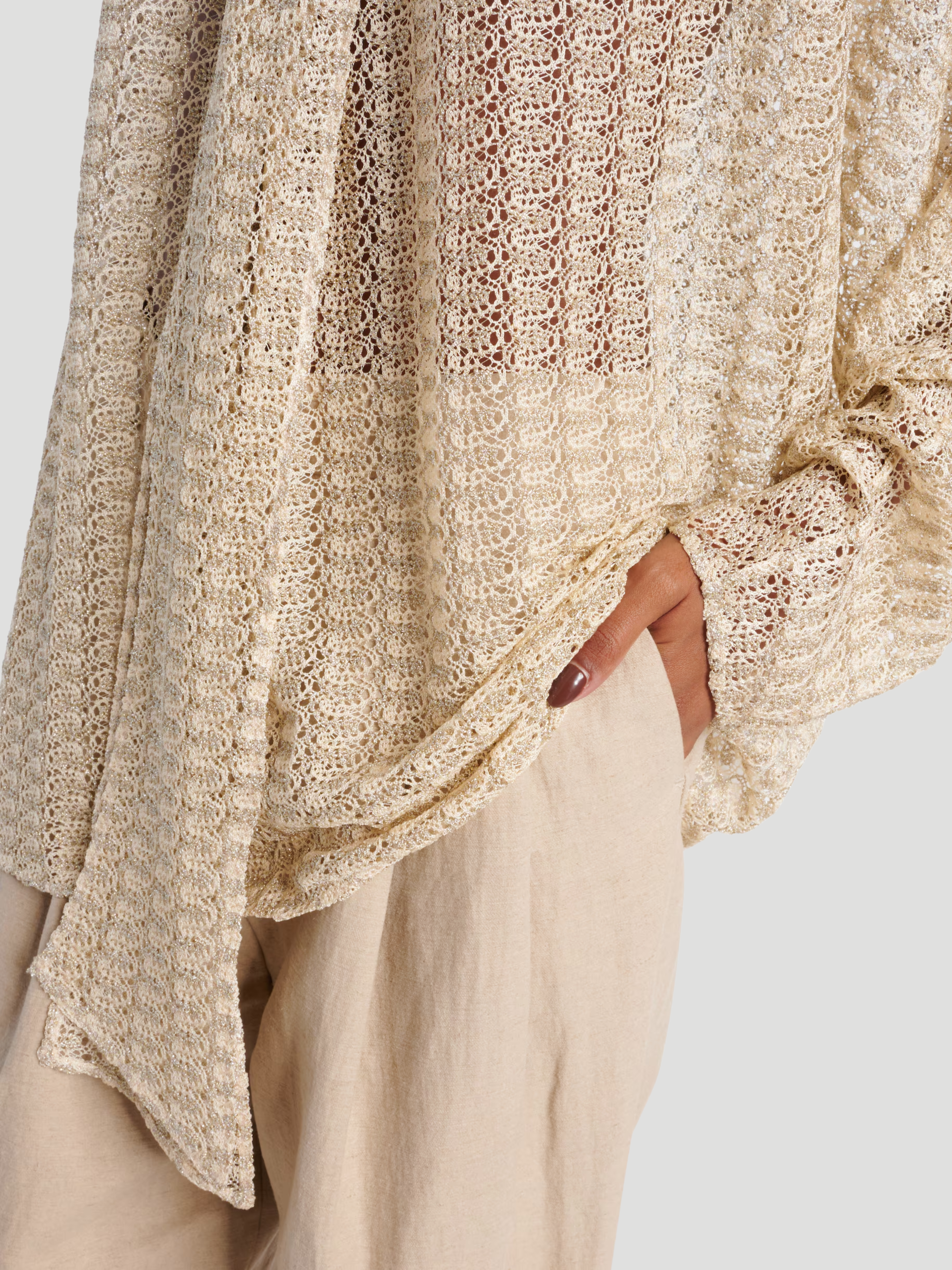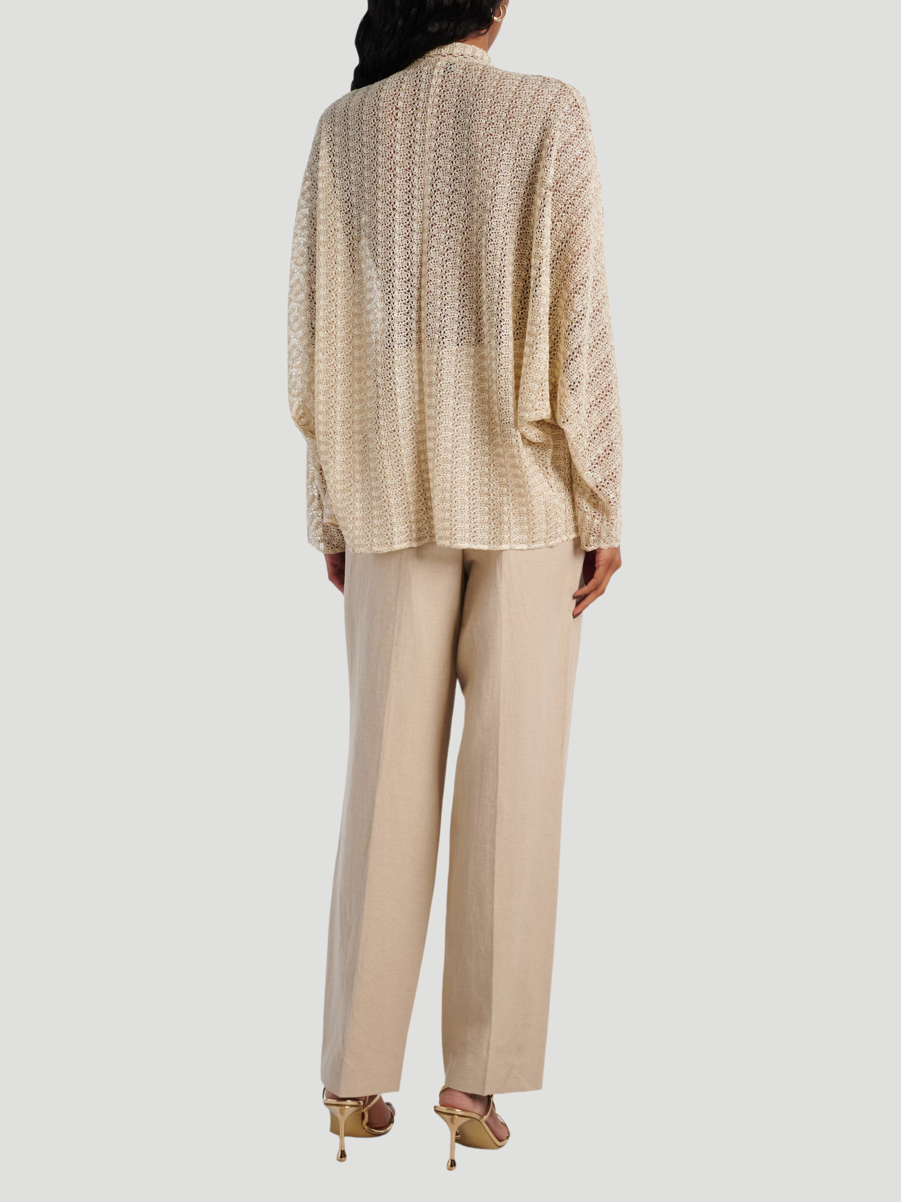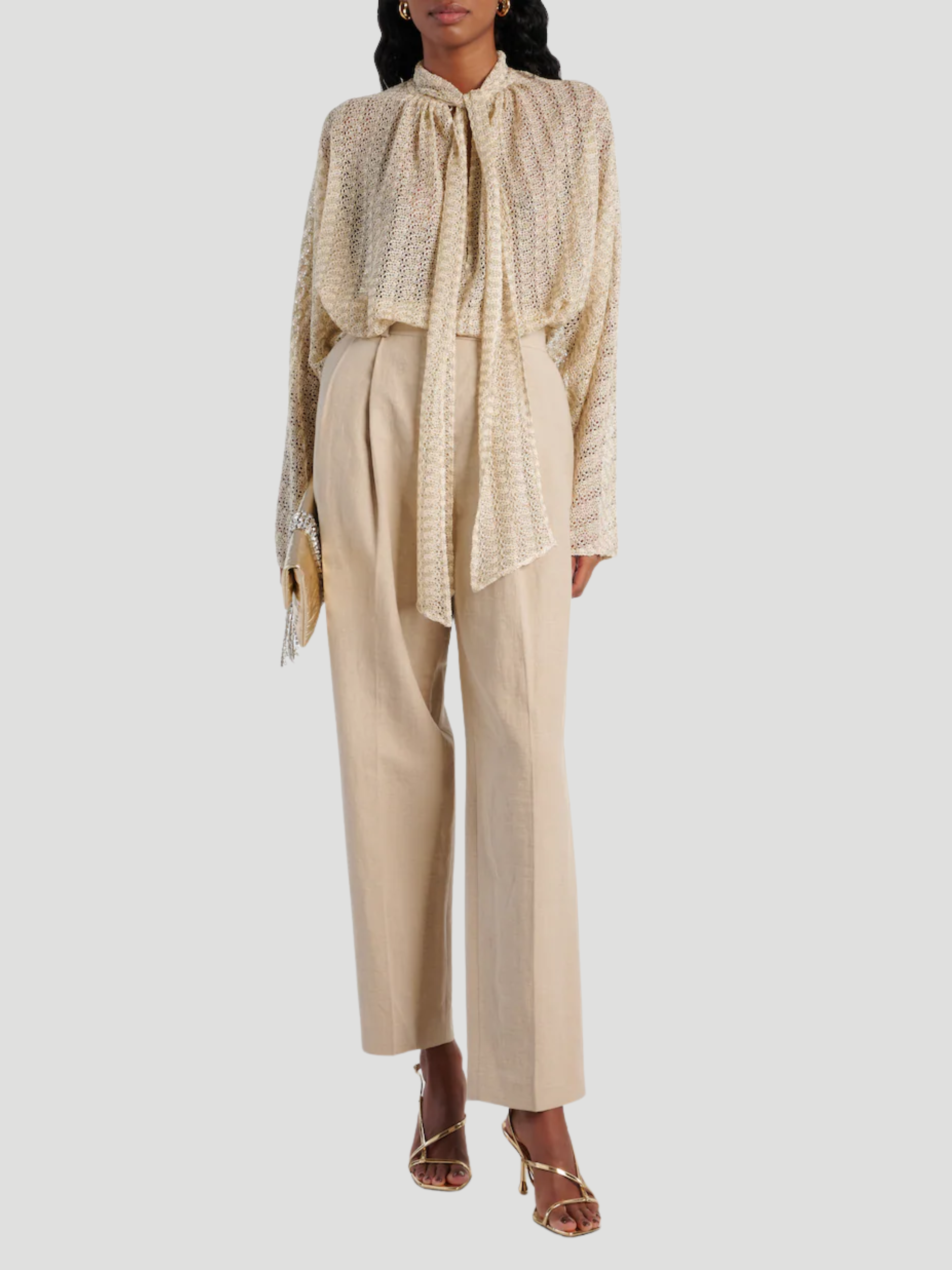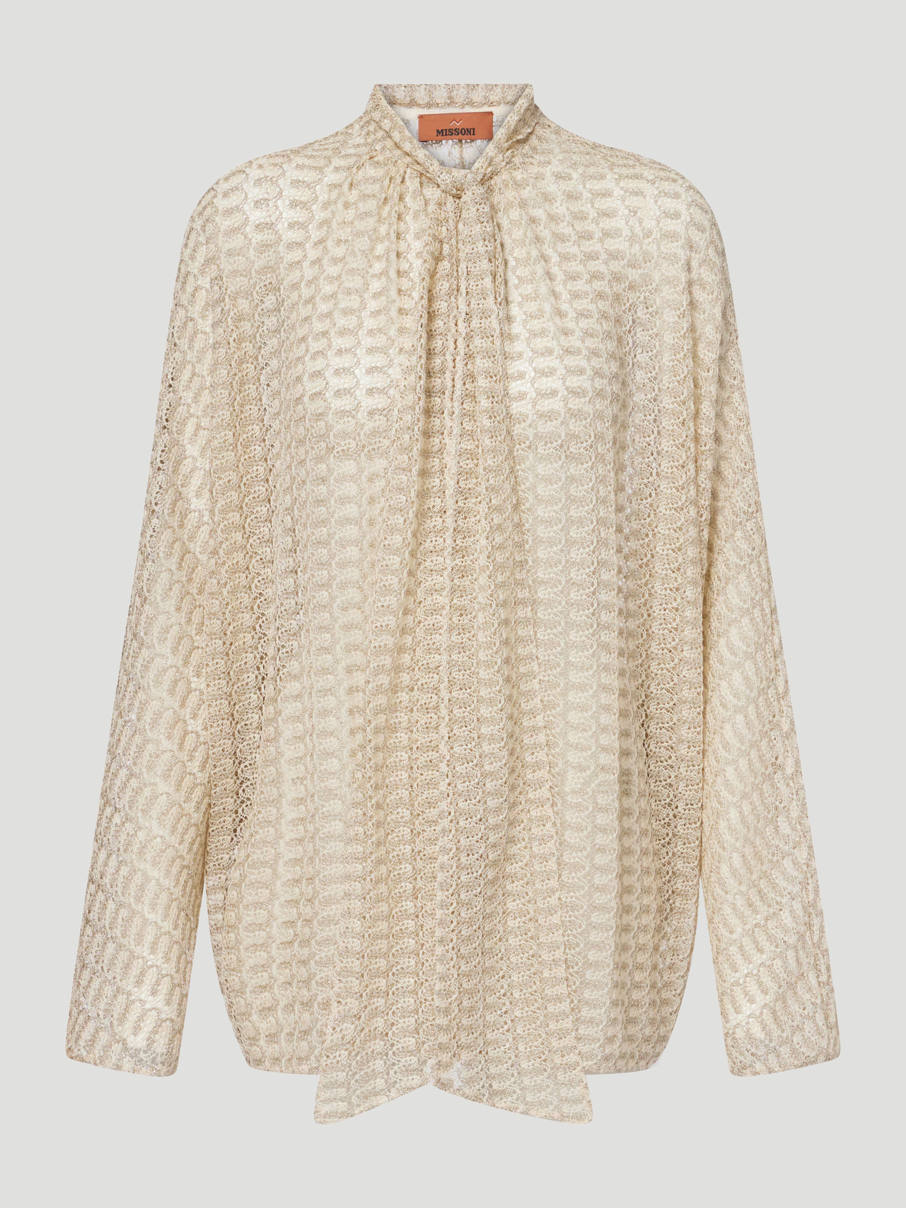 Introducing Missoni's Zigzag Tie-Neck Lamé Blouse. Combining gold and cream metallic tones, this blouse is an elegant and eye-catching must-have. The front neck tie adds a touch of sophistication, while the long sleeves and relaxed fit make for an effortless and chic look. Perfectly paired with trousers and heels, it's the ultimate choice for a polished and luxurious ensemble.