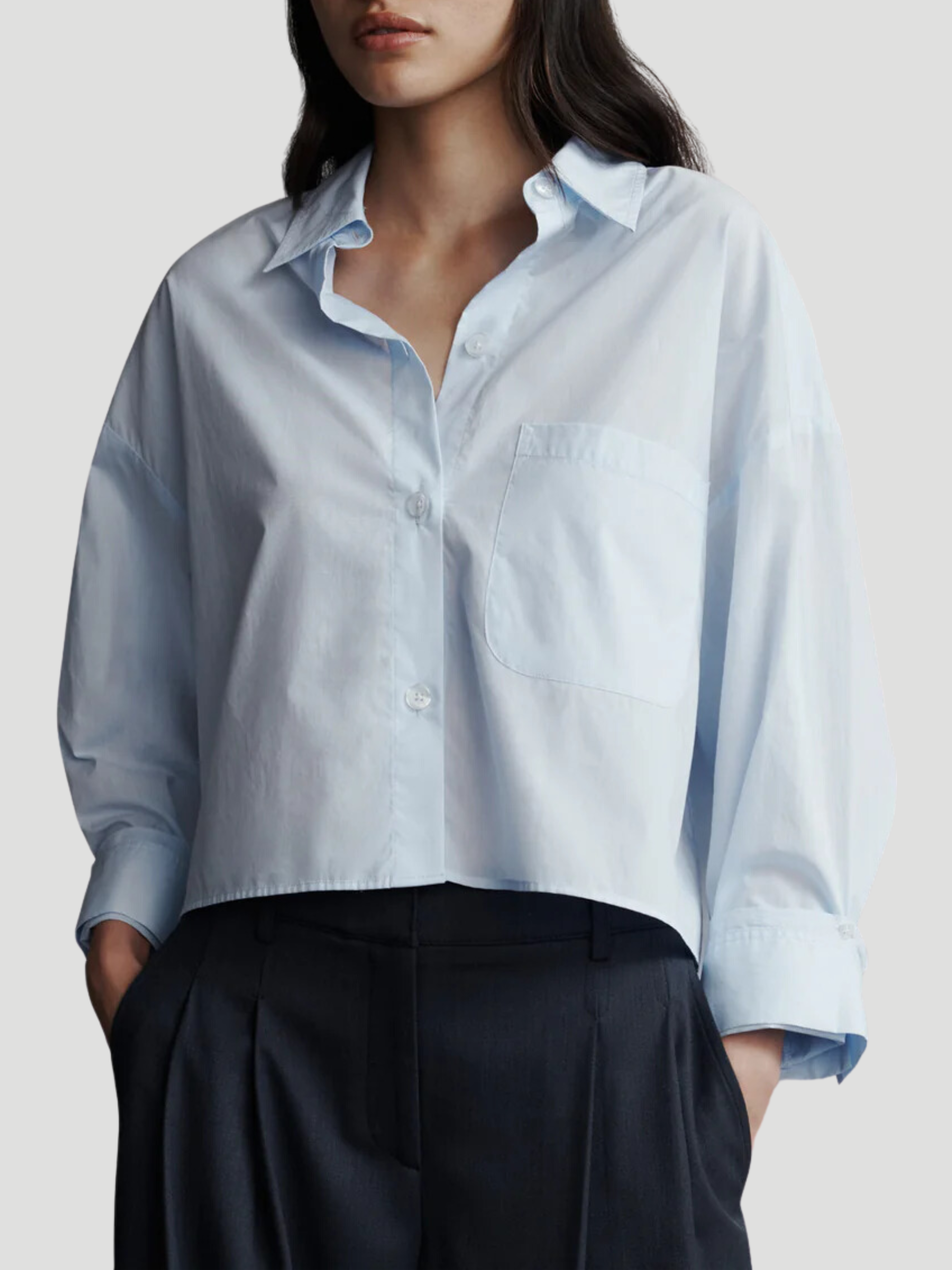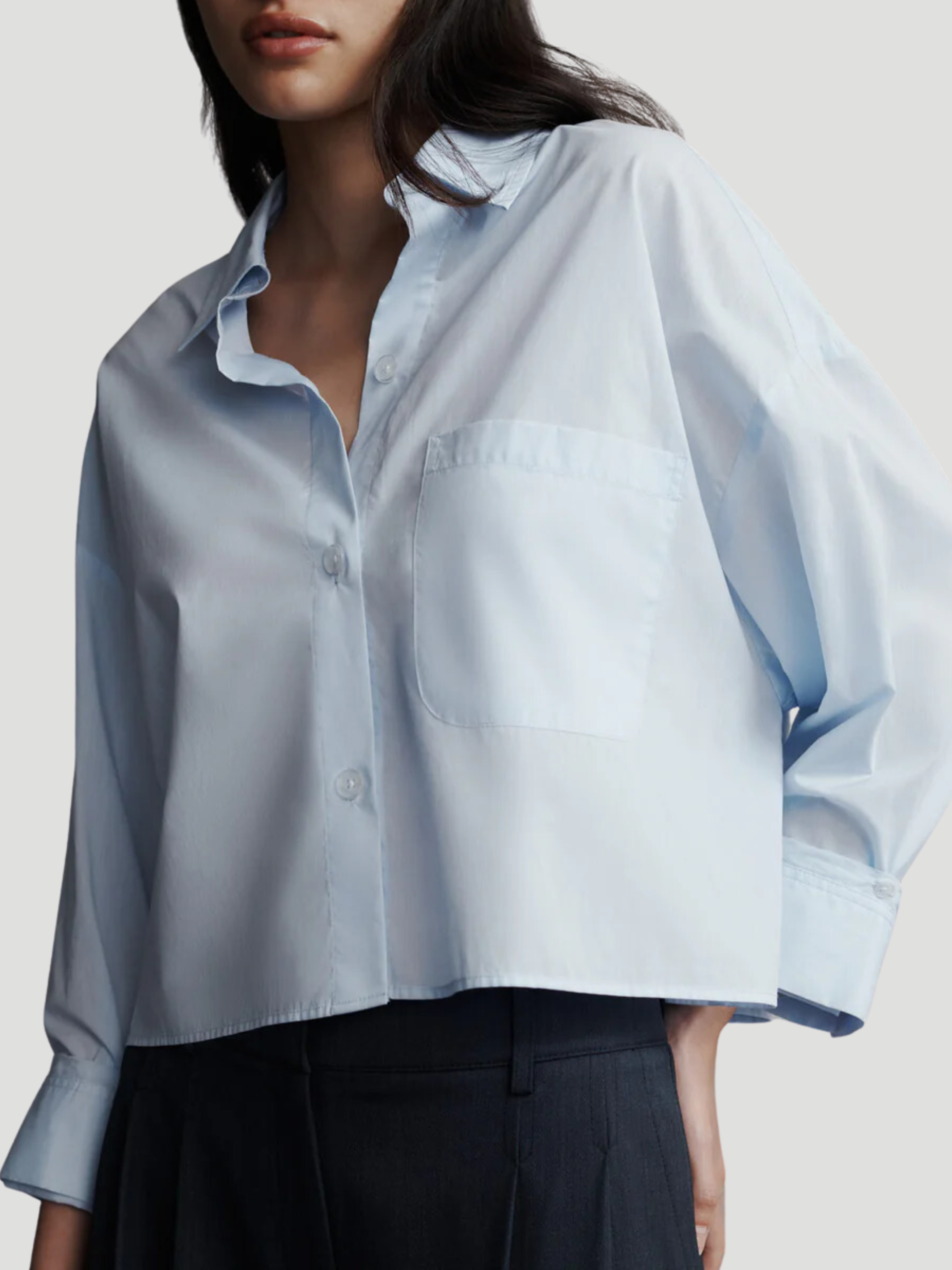 Expertly crafted in soft and breathable cotton poplin, the Soon To Be Ex shirt from TWP offers a stylish and comfortable cropped fit. With a classic point collar and long sleeves, this shirt is perfect for any occasion. Made from superfine cotton, it features a single chest pocket for added convenience. Upgrade your wardrobe with this must-have shirt.