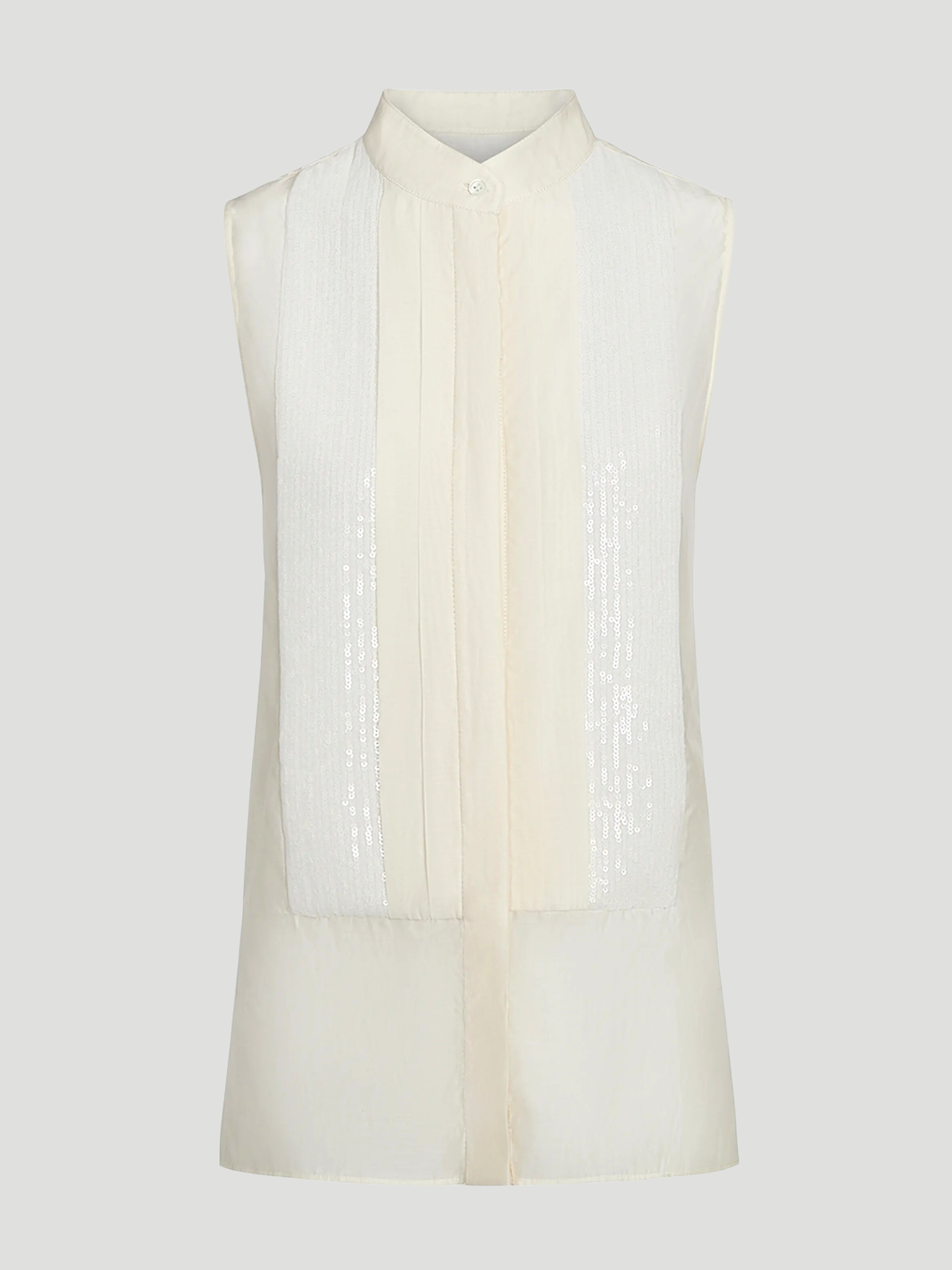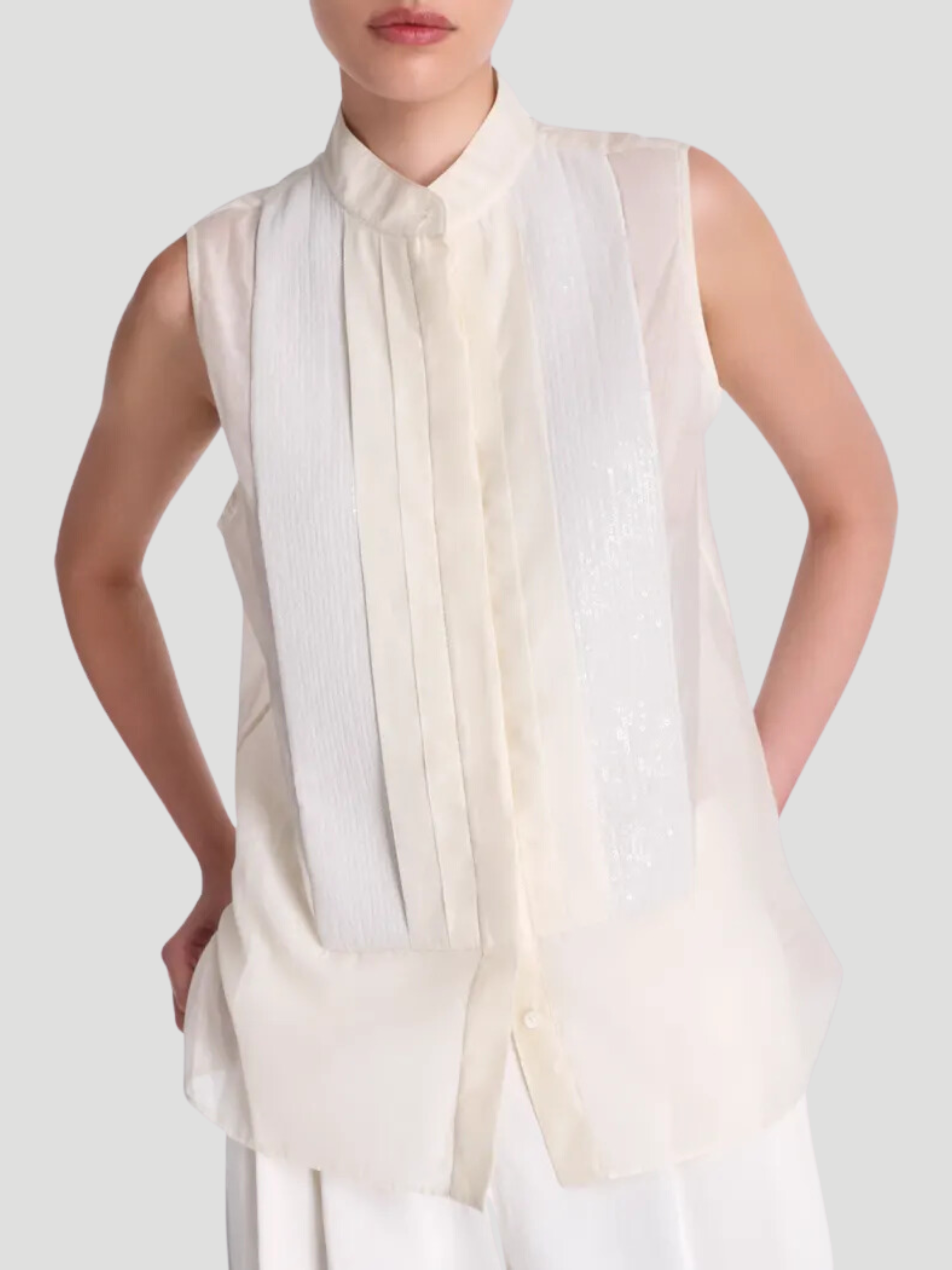 The "Adele" blouse from TWP features a unique semi-sheer design with a sequin-embellished bib, perfect for adding subtle sparkle to any outfit. With a high neckline and relaxed fit, this sleeveless blouse offers both comfort and style. Made with a blend of viscose and linen, it's breathable and has a button front closure. Dress it up or down, it's a versatile addition to any wardrobe.