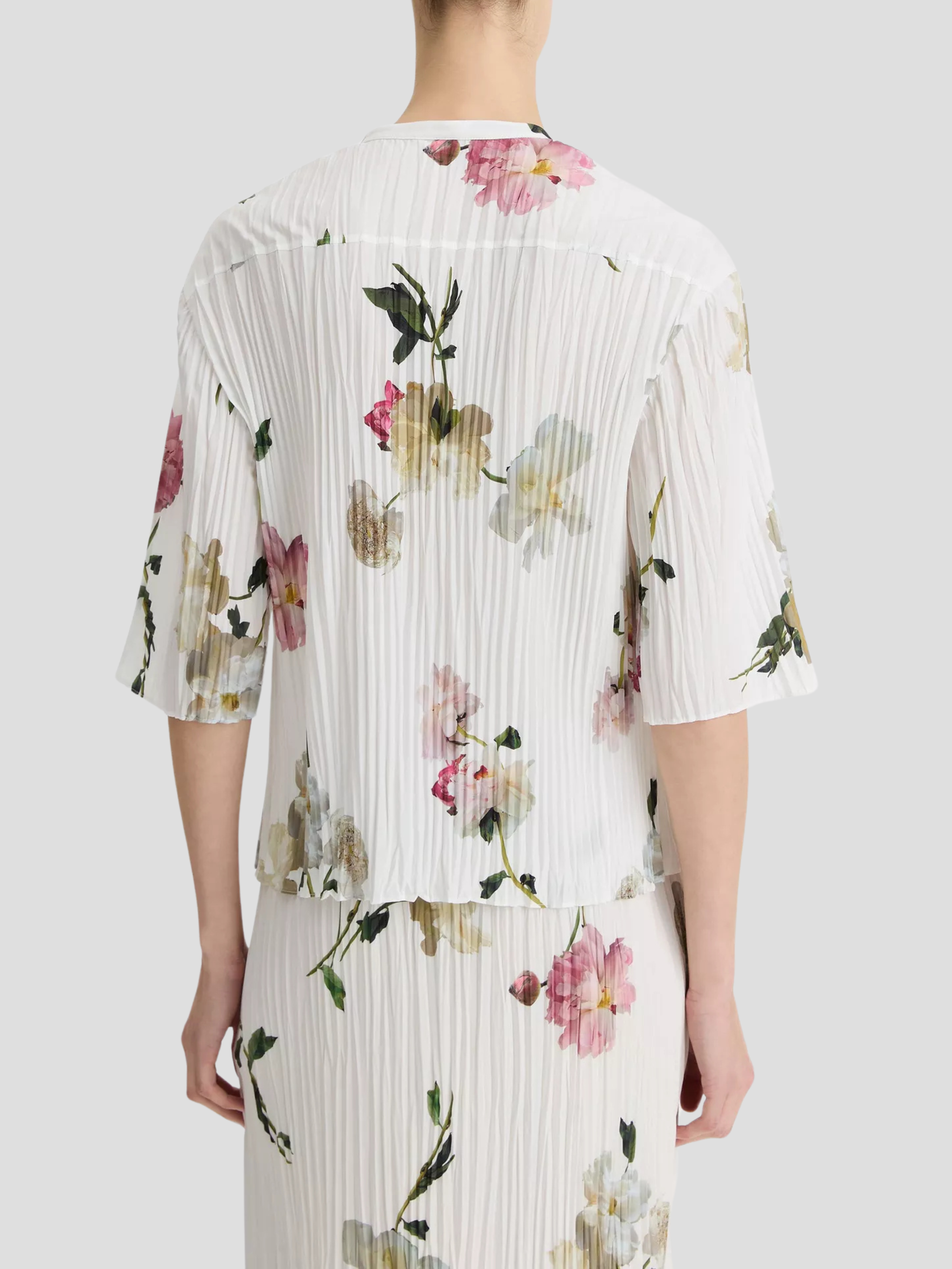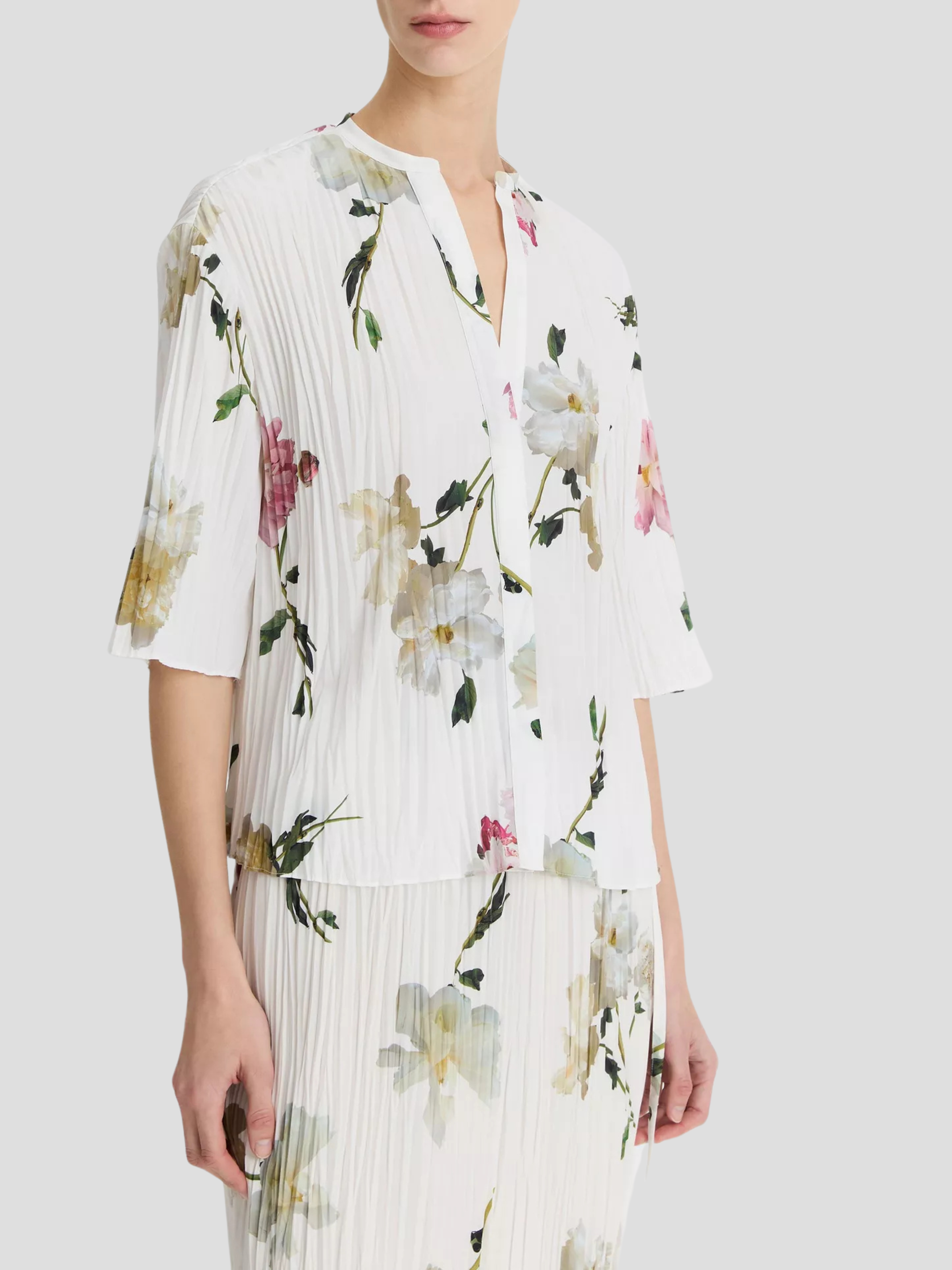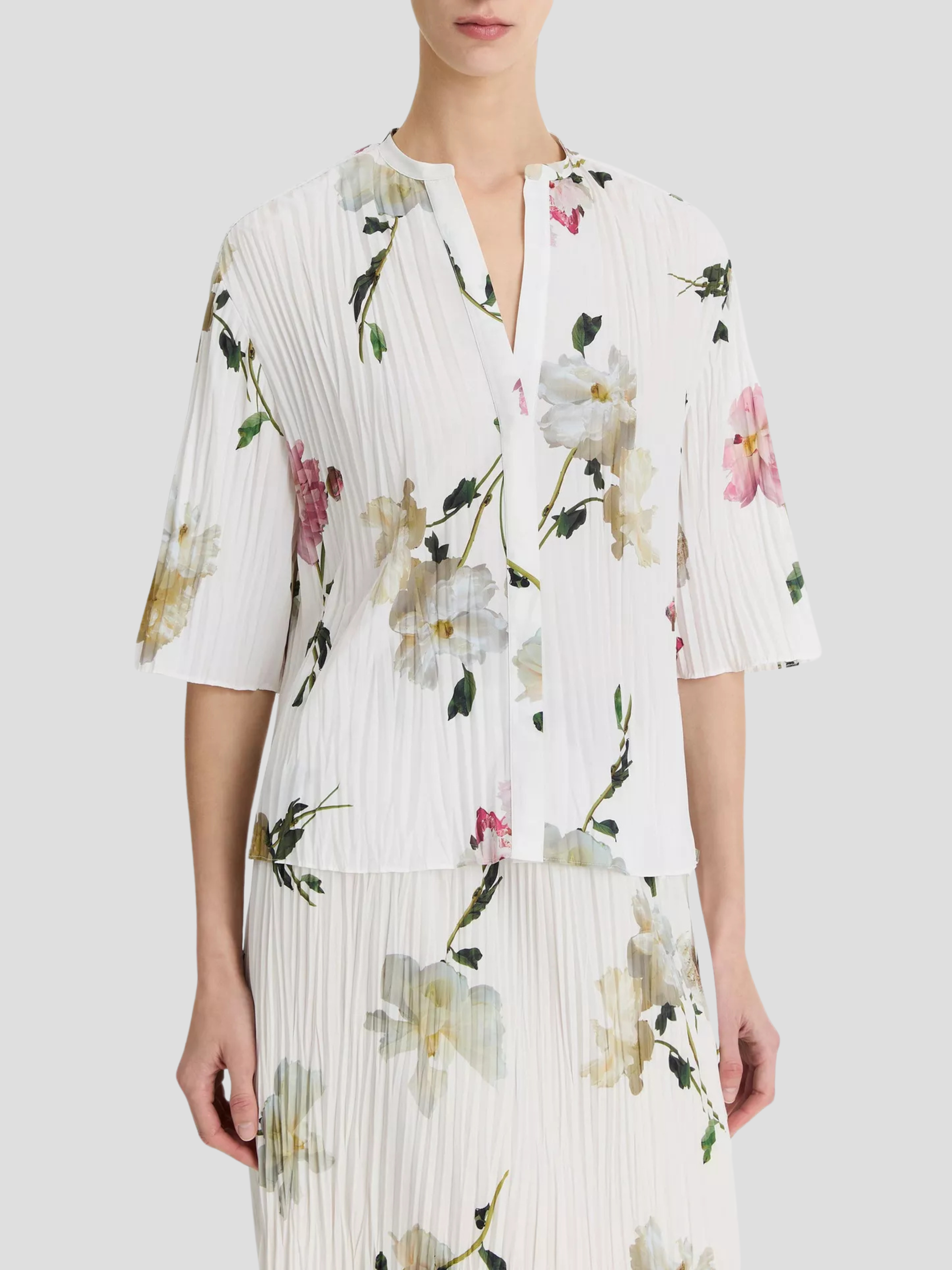 A bouquet in the studio planted the seeds for this band-collar blouse. Vince photographed the bunch and printed them atop lightweight crêpe de Chine, finished with a crushed texture for added dimension. Complete the set with the matching Wilted Peony Pleated Skirt