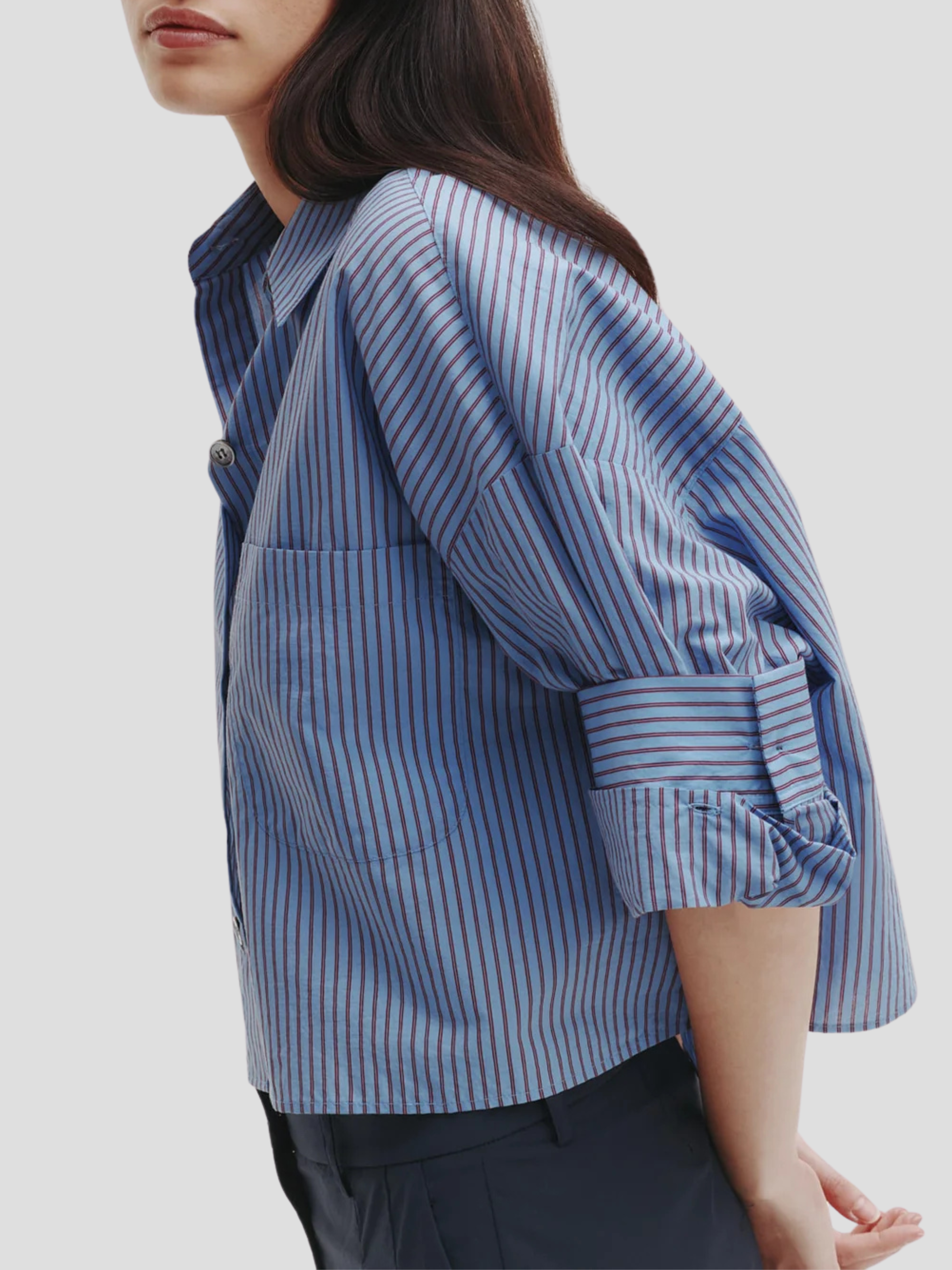 Cropped, short sleeved button down in striped Italian cotton shirting. The Next Ex is a cropped, boxy silhouette. Complete with a chest patch pocket, button up placket, spread collar, and our signature double roll button cuffs.