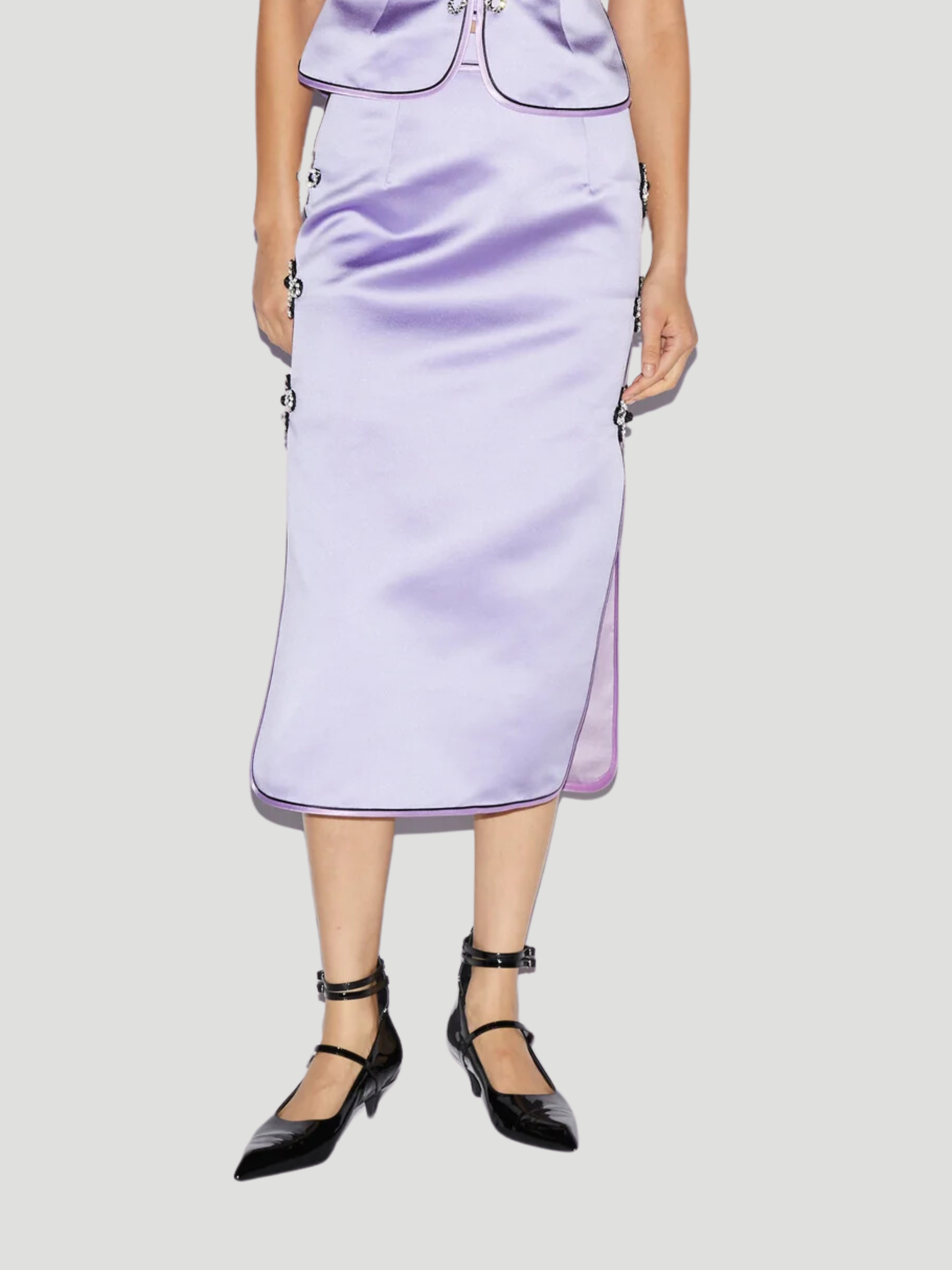 Elevate your wardrobe with the elegant Dario Crystal-Embellished Midi Skirt. Crafted from a shiny lilac satin, this mid length pencil skirt boasts a chic Cheongsam button detail and a stylish side split. The contrast black piping and crystal embellished qipao knot buttons add a touch of sophistication.