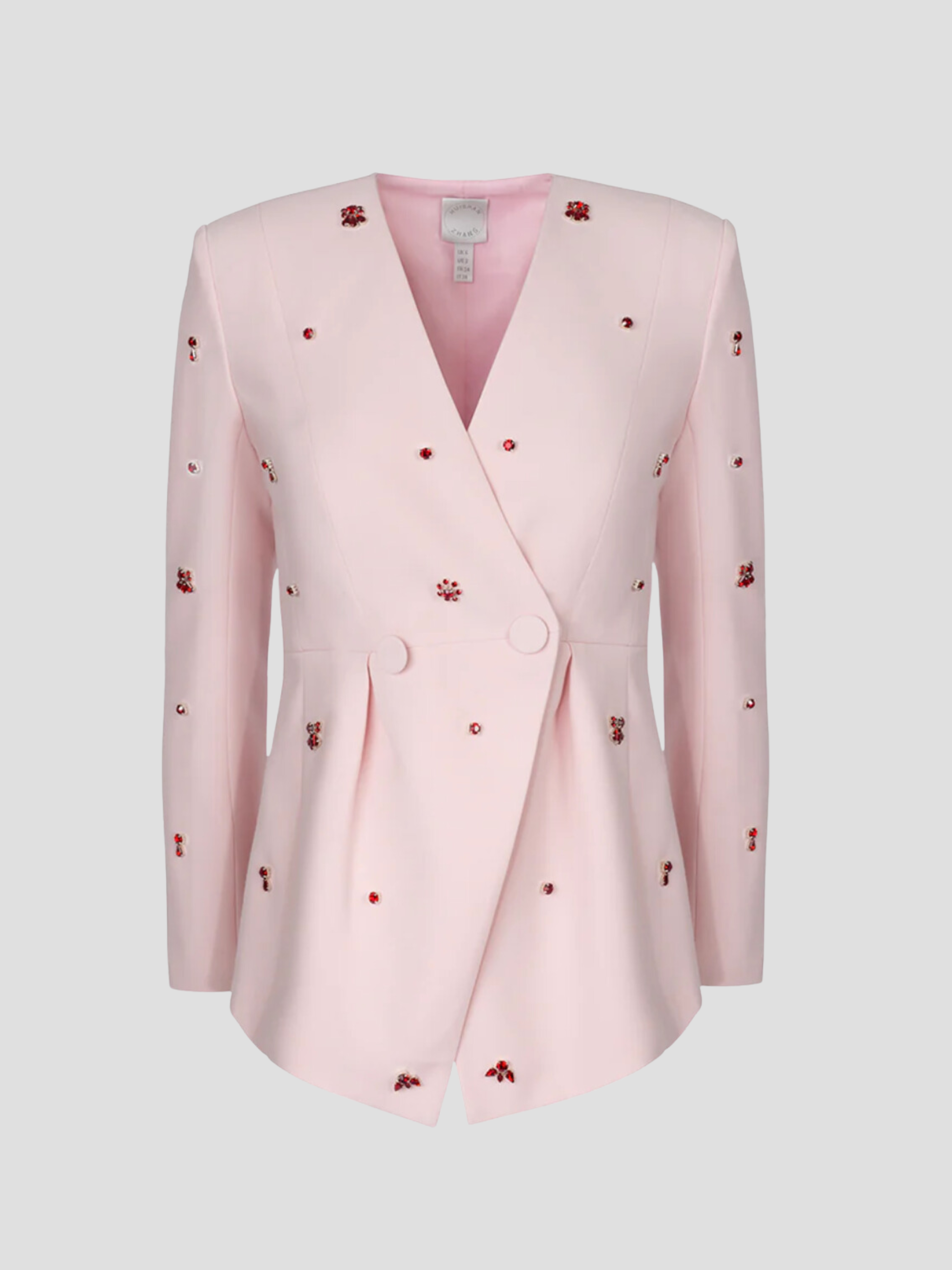 V-neck, padded shoulders, crystal embellishments, button-fastening cuffs, darted waist, pleated details, button embellishments at front, fully lined