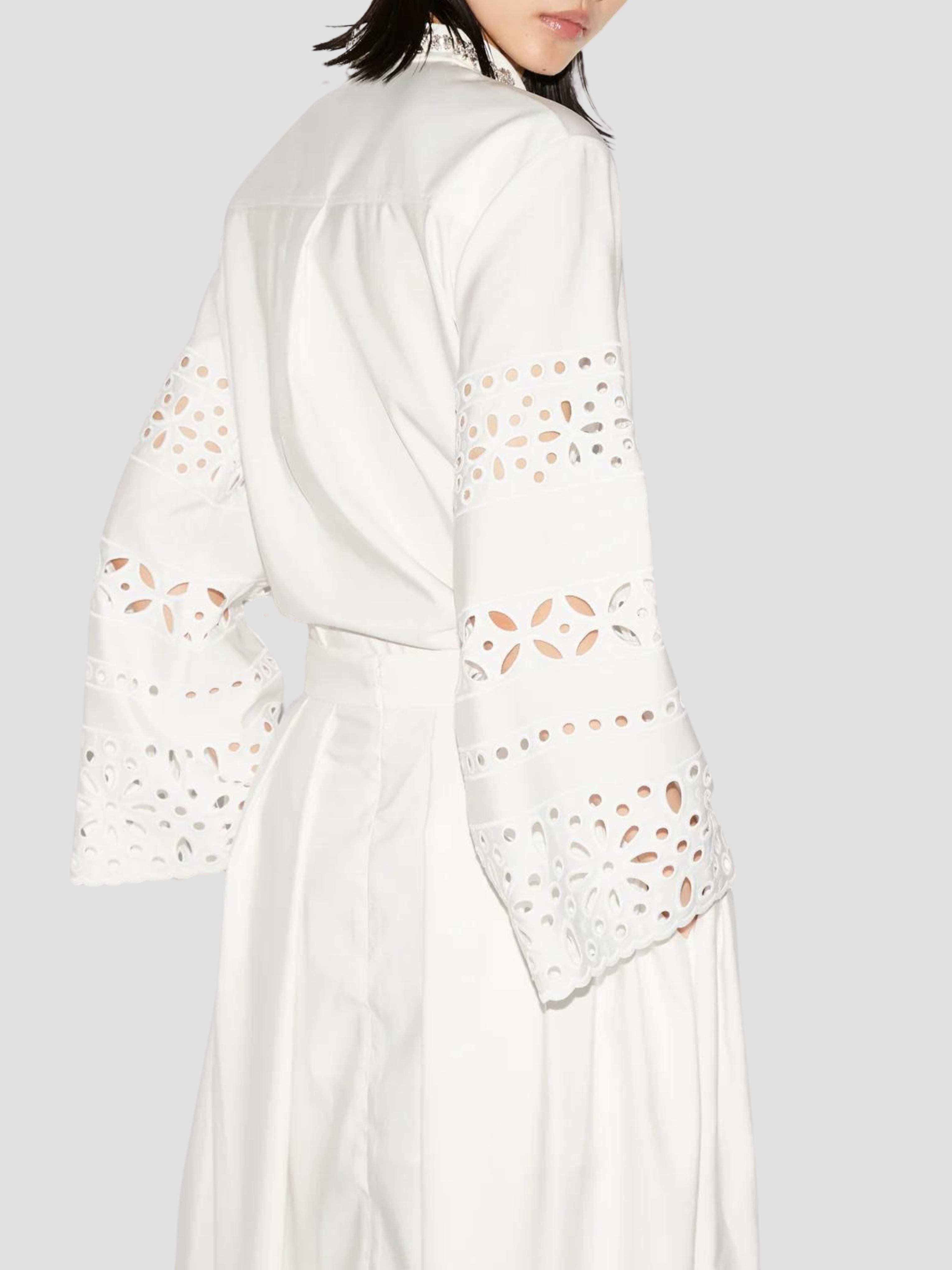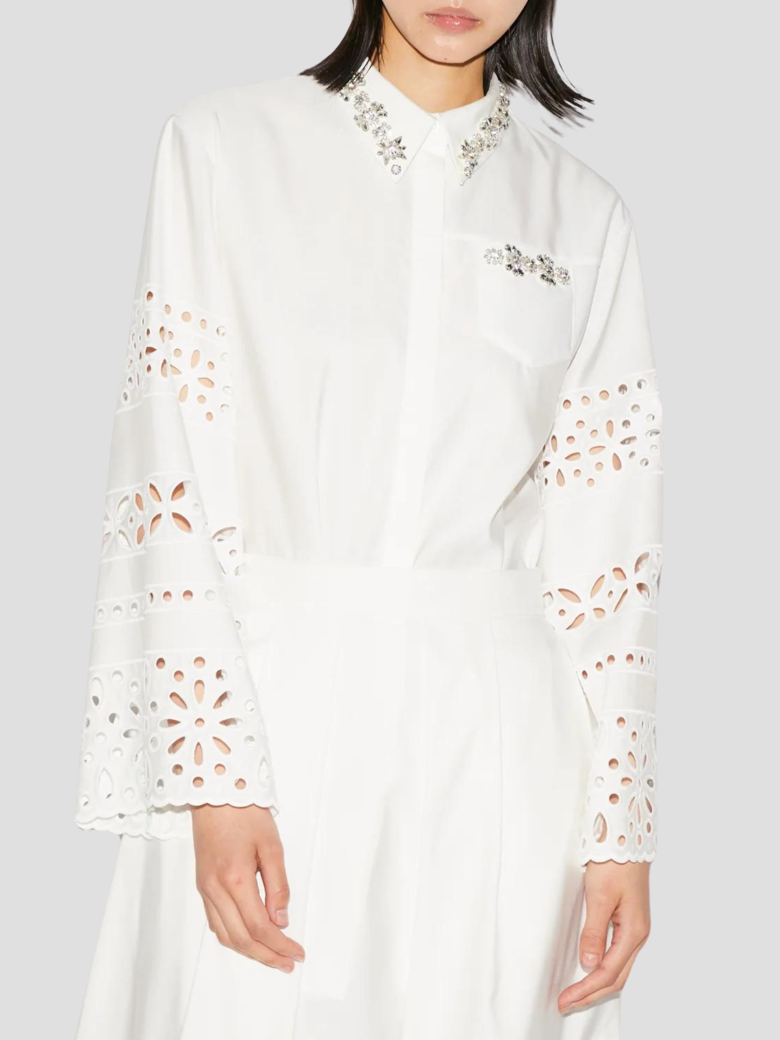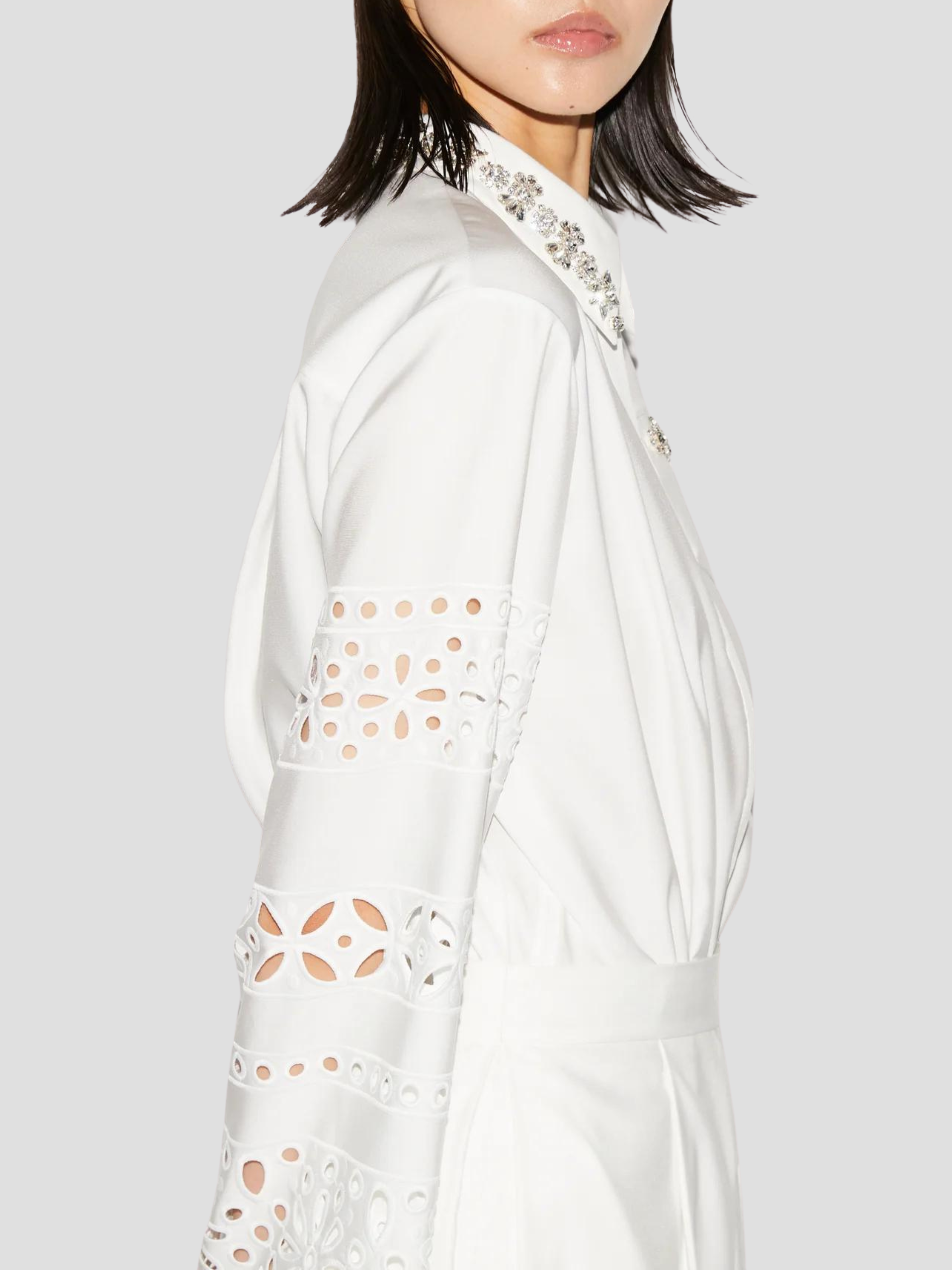 The Logan Broderie-Anglaise Longsleeve Shirt by Huishan Zhang exudes glamour with its intricate broderie anglaise detailing on the sleeves and delicate crystal embellishments. Made from white faille, this shirt offers a casual elegance that can be dressed up or down. Designed to be worn as a set with the coordinating skirt.