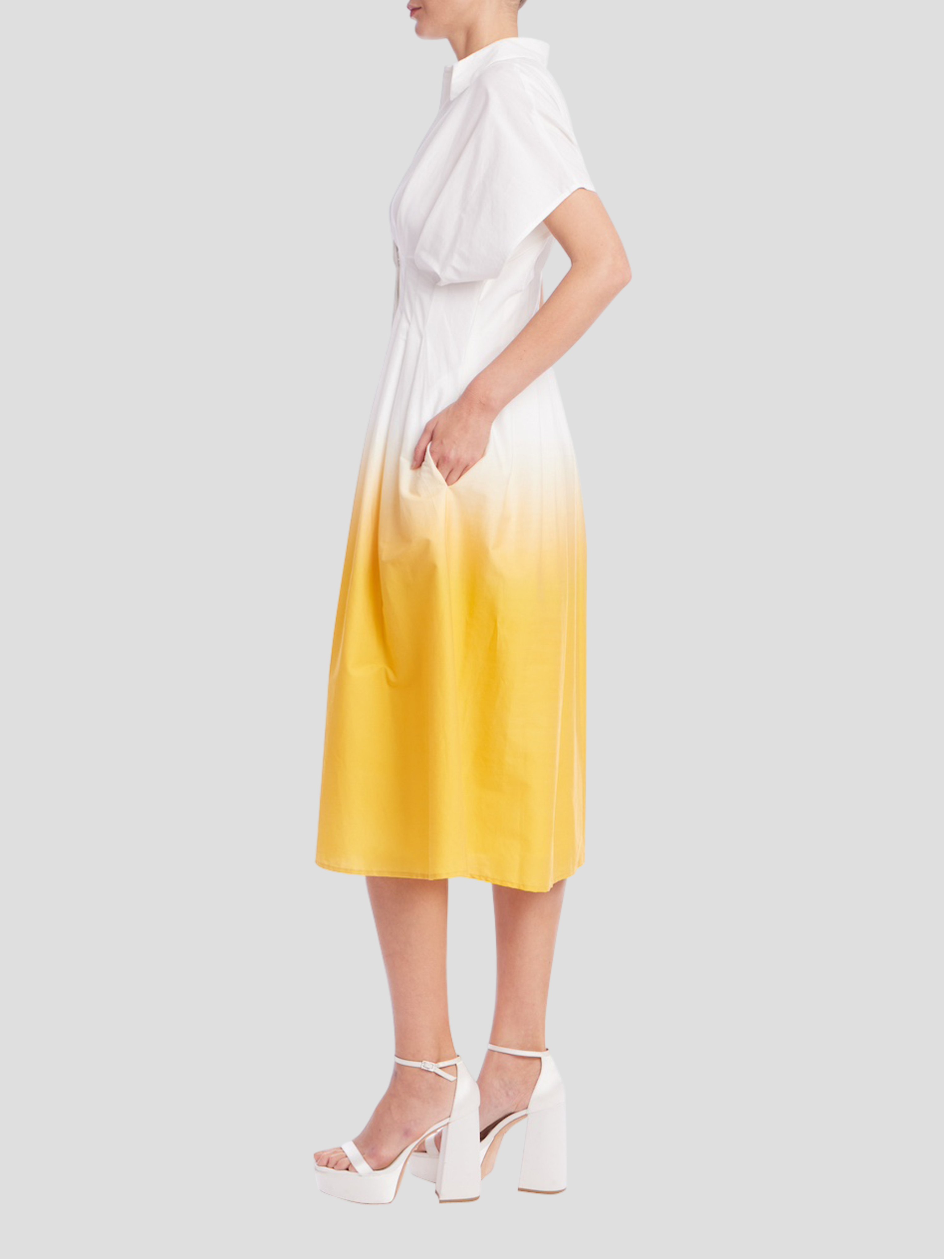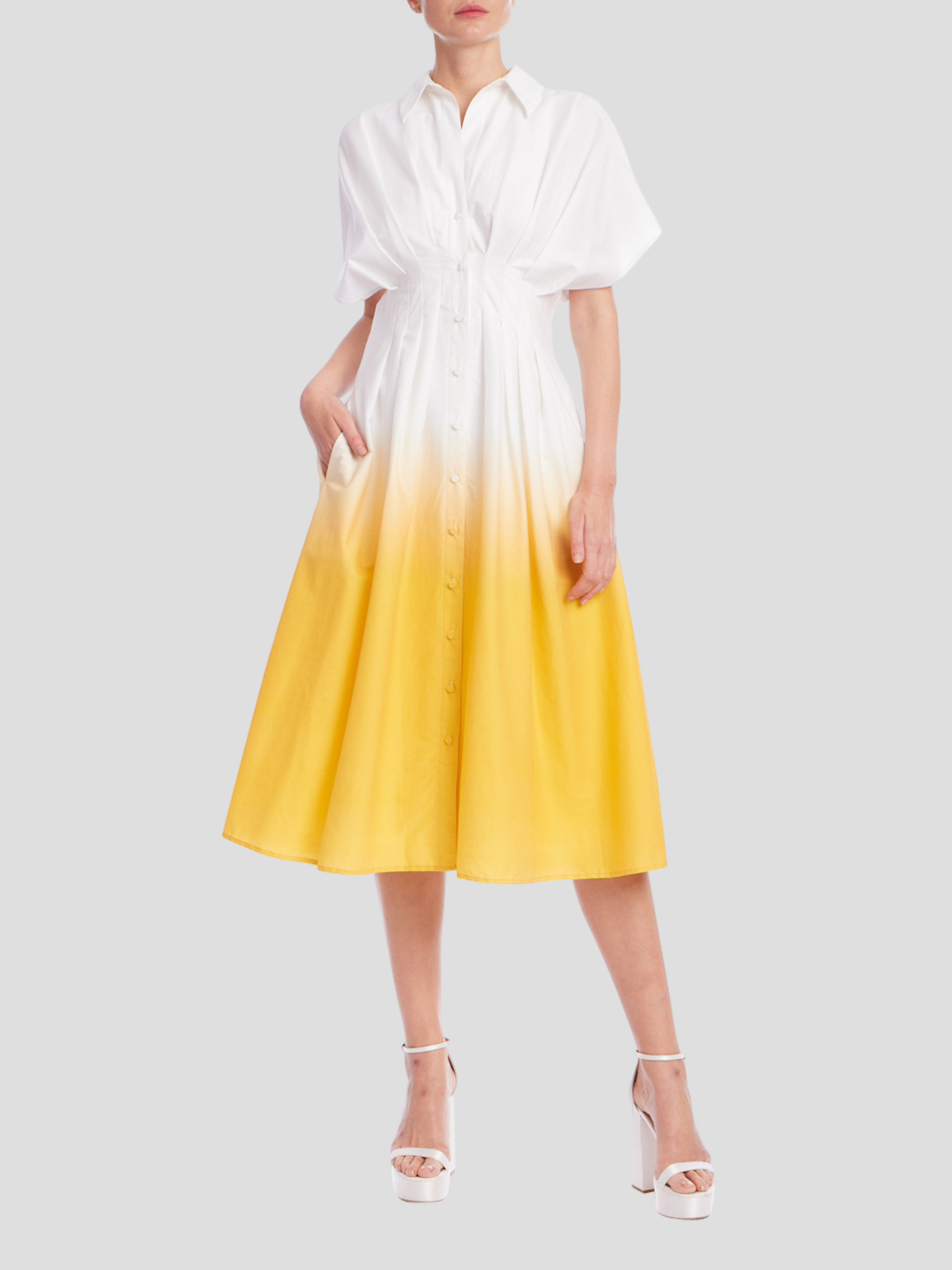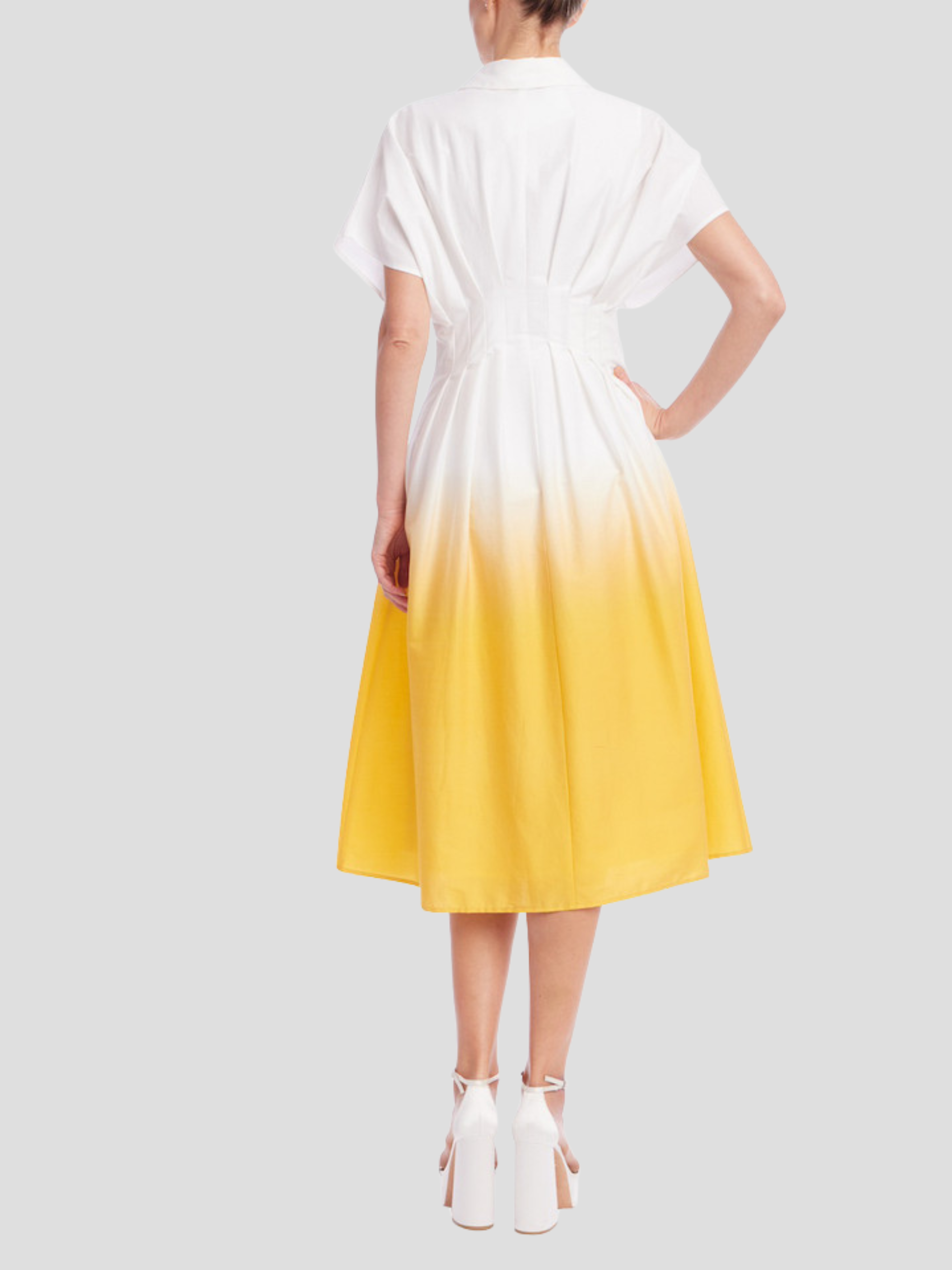 Brighten up your wardrobe with the Dip Dye Ombre Shirt Dress, a stunning midi piece that blends classic tailoring with modern color play. Featuring a structured collared neckline, short dolman sleeves, and a button-down front, this dress offers effortless sophistication. The standout ombré effect transitions from crisp white at the top to a radiant sunflower yellow at the hem, evoking the beauty of a golden sunset. With a flattering flared silhouette, soft pleating, and practical side pockets, it’s perfect for daytime events, vacations, or sunny strolls through the city.