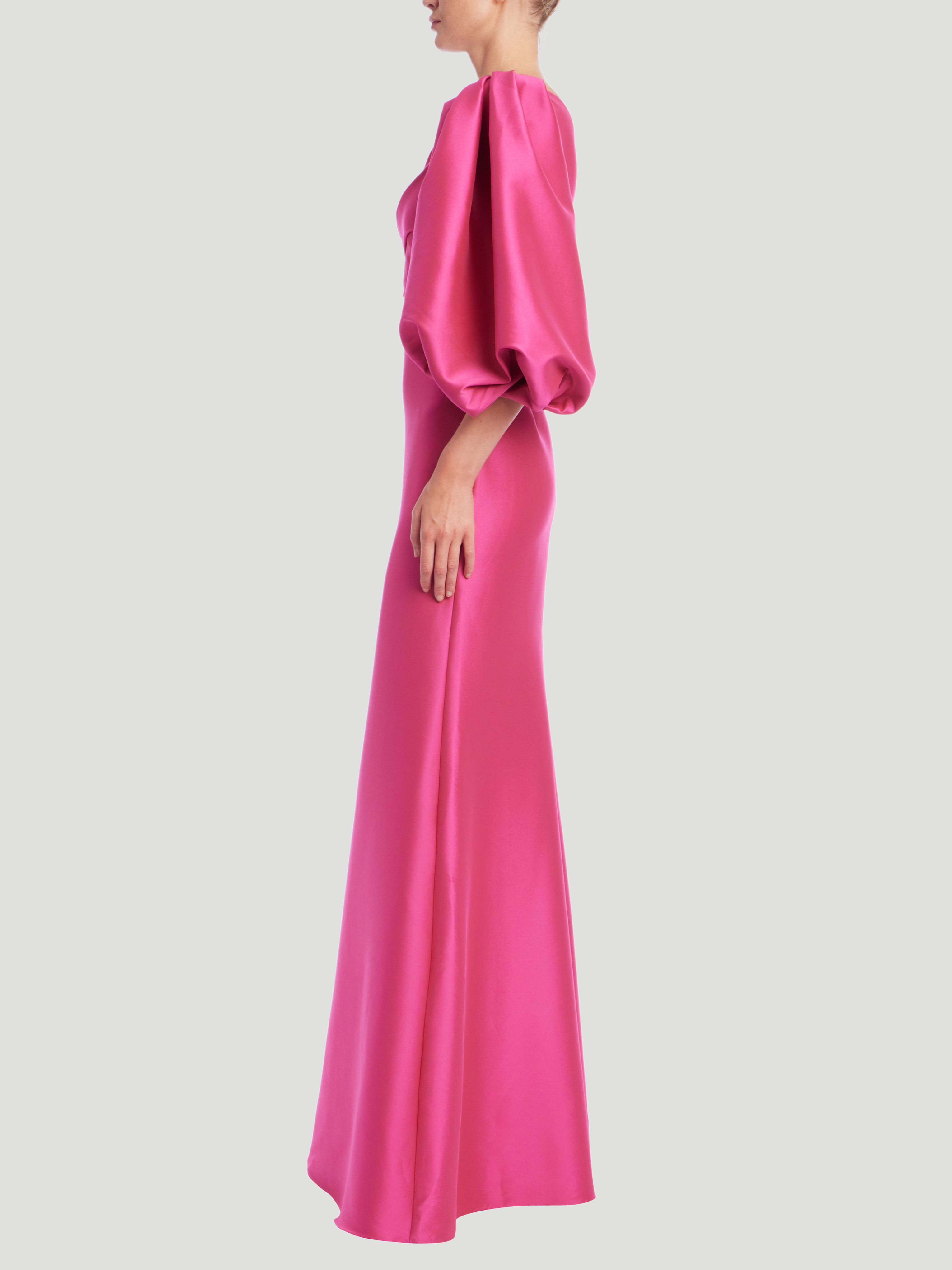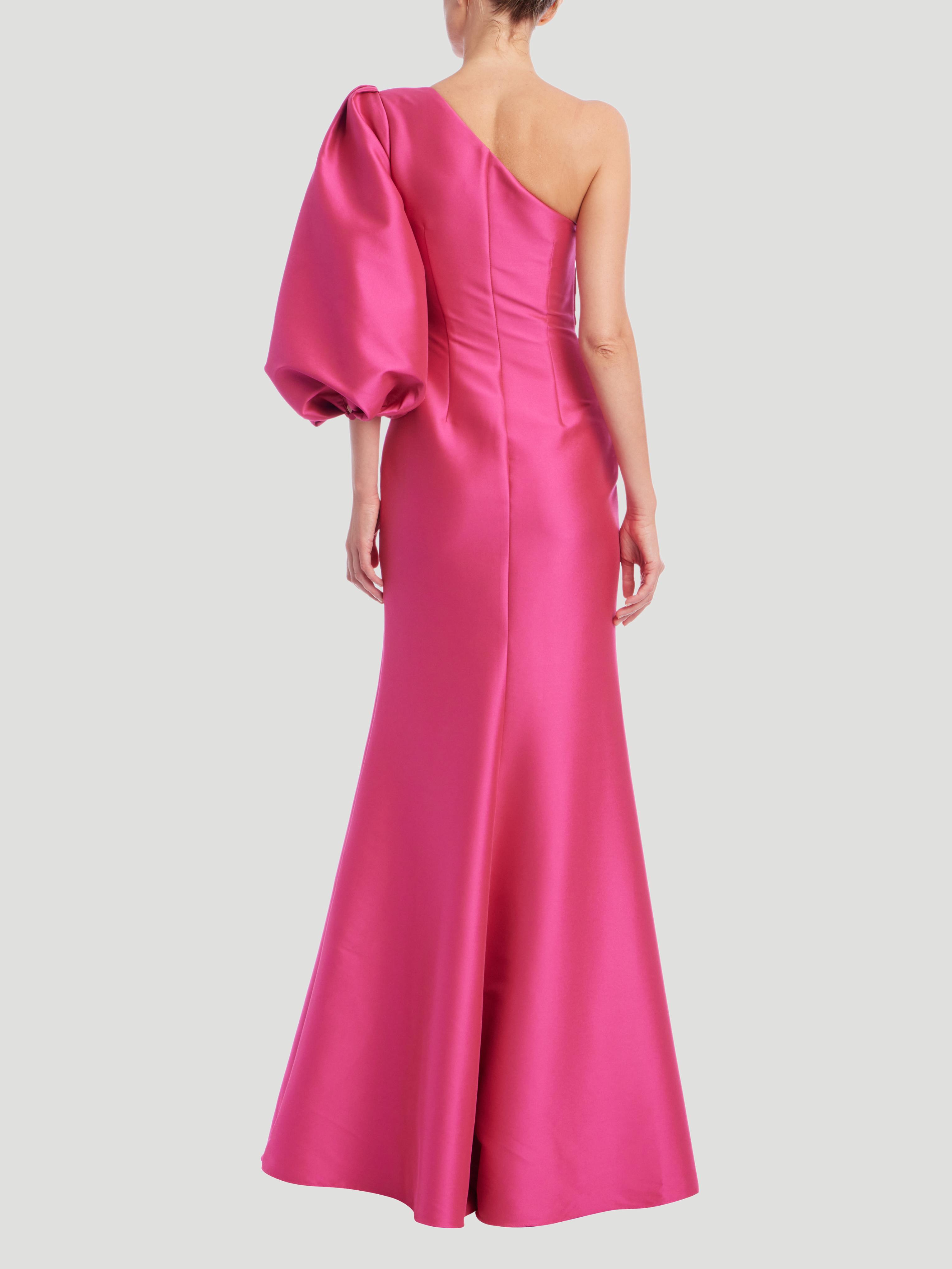 Indulge your inner starlet with our One Shoulder Balloon Sleeve Gown from Badgley Mischka. The striking one-shoulder design and decadent puff sleeve create an eye-catching silhouette, while the pleated bodice and mermaid skirt exude elegance in every step. Made of stretch Mikado with a lustrous finish for a flawless fit and an aura of luxury.