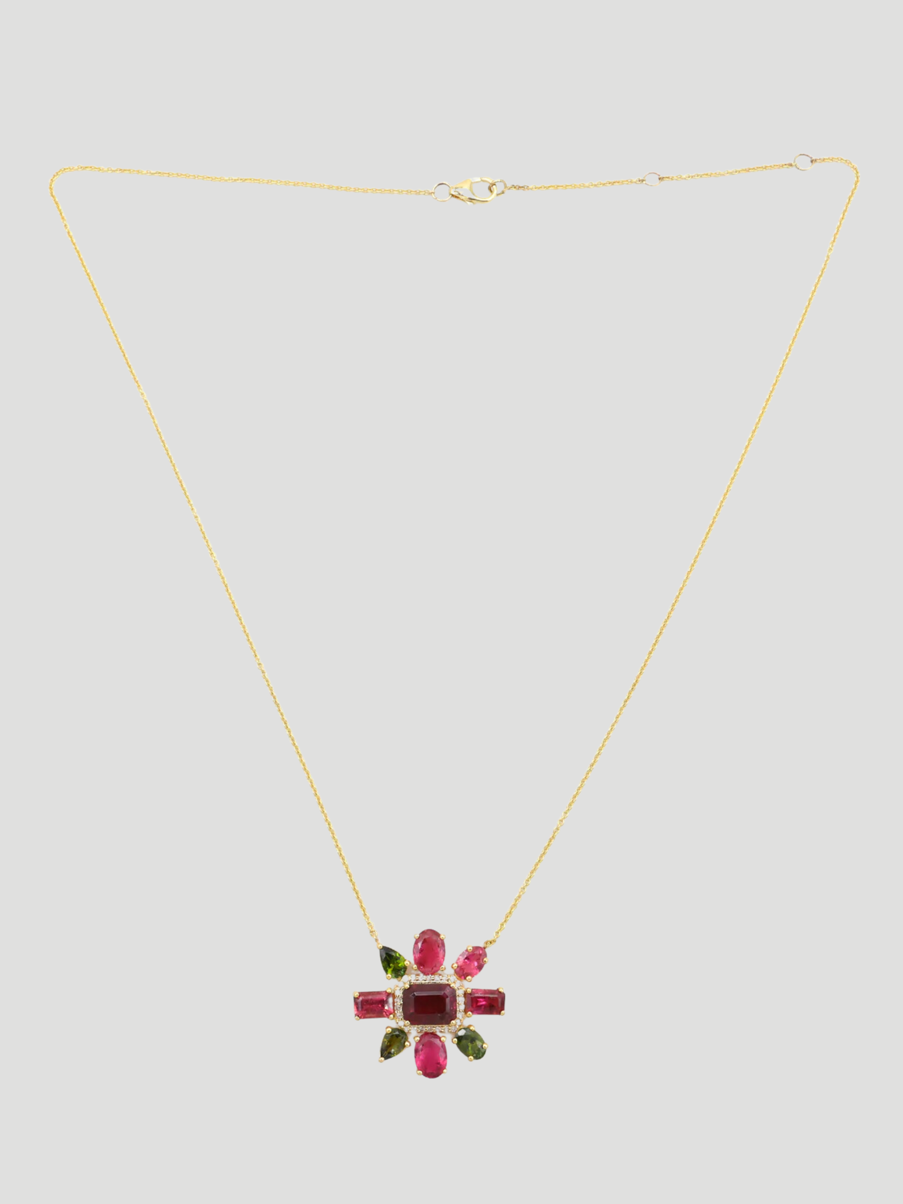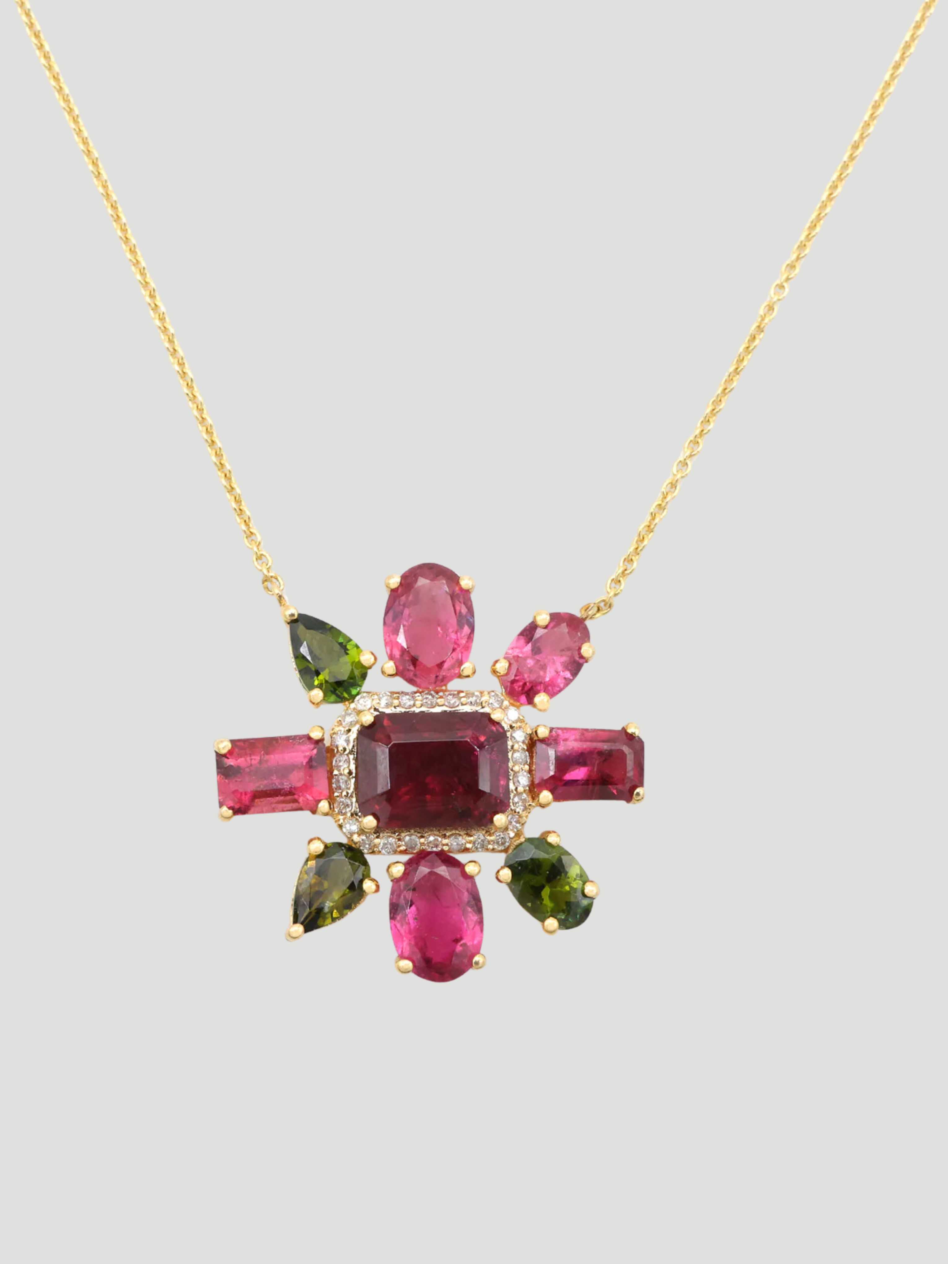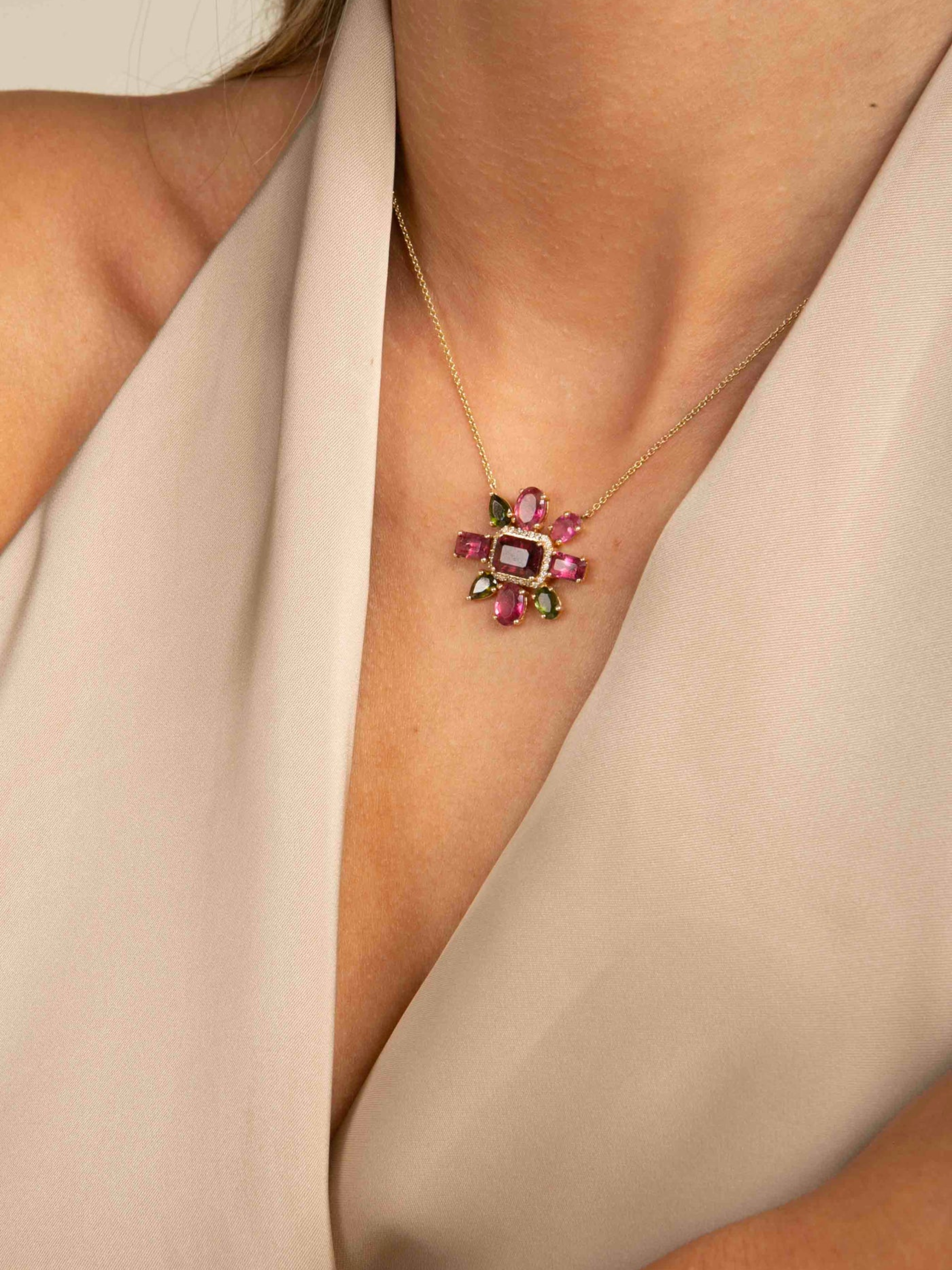 Experience the vibrant beauty and protective properties of our Jaipur Petal Necklace. Crafted with multi-color tourmaline, this necklace exudes stunning artistry and complements our Jaipur Petal Earrings perfectly. Let the rich colors and captivating allure of this necklace from La Muse elevate your style.