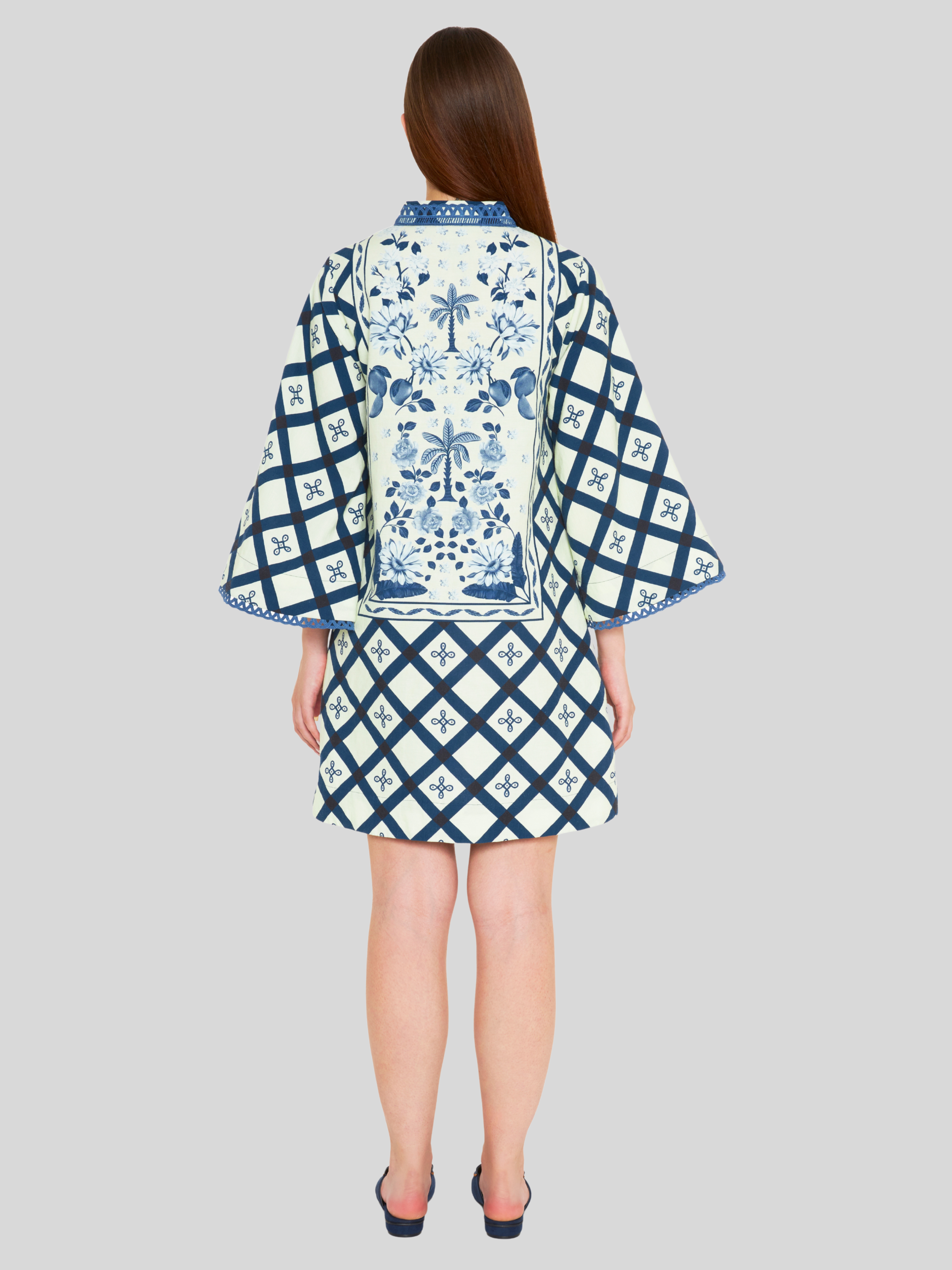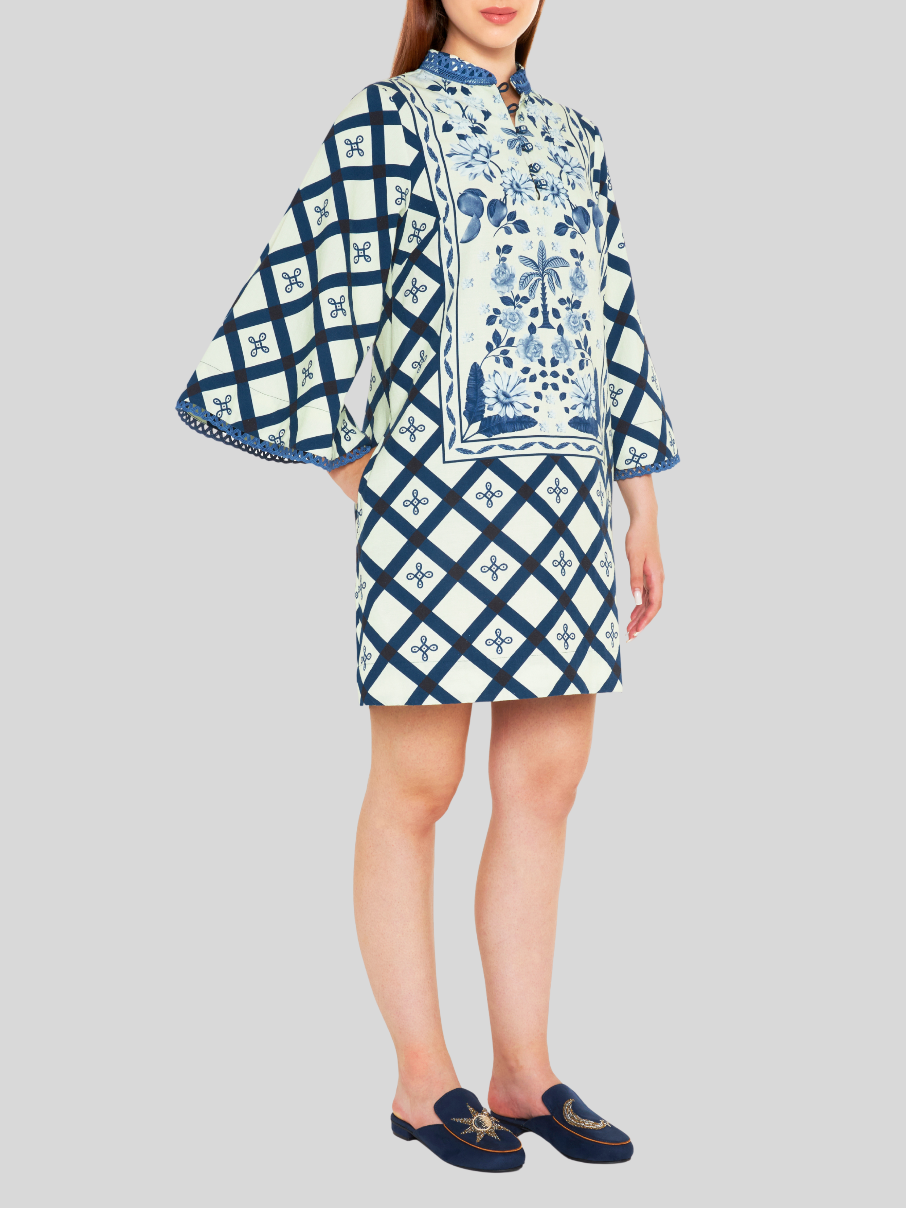 This mini kaftan dress, featuring ivory multi-motif panels, is a signature Verandah style and one of our best-selling silhouettes. With its bell sleeves, mandarin collar, and playful print, it’s the perfect blend of relaxed and refined. Ideal for brunches, beachside strolls, or casual evenings, it captures the essence of easy dressing.