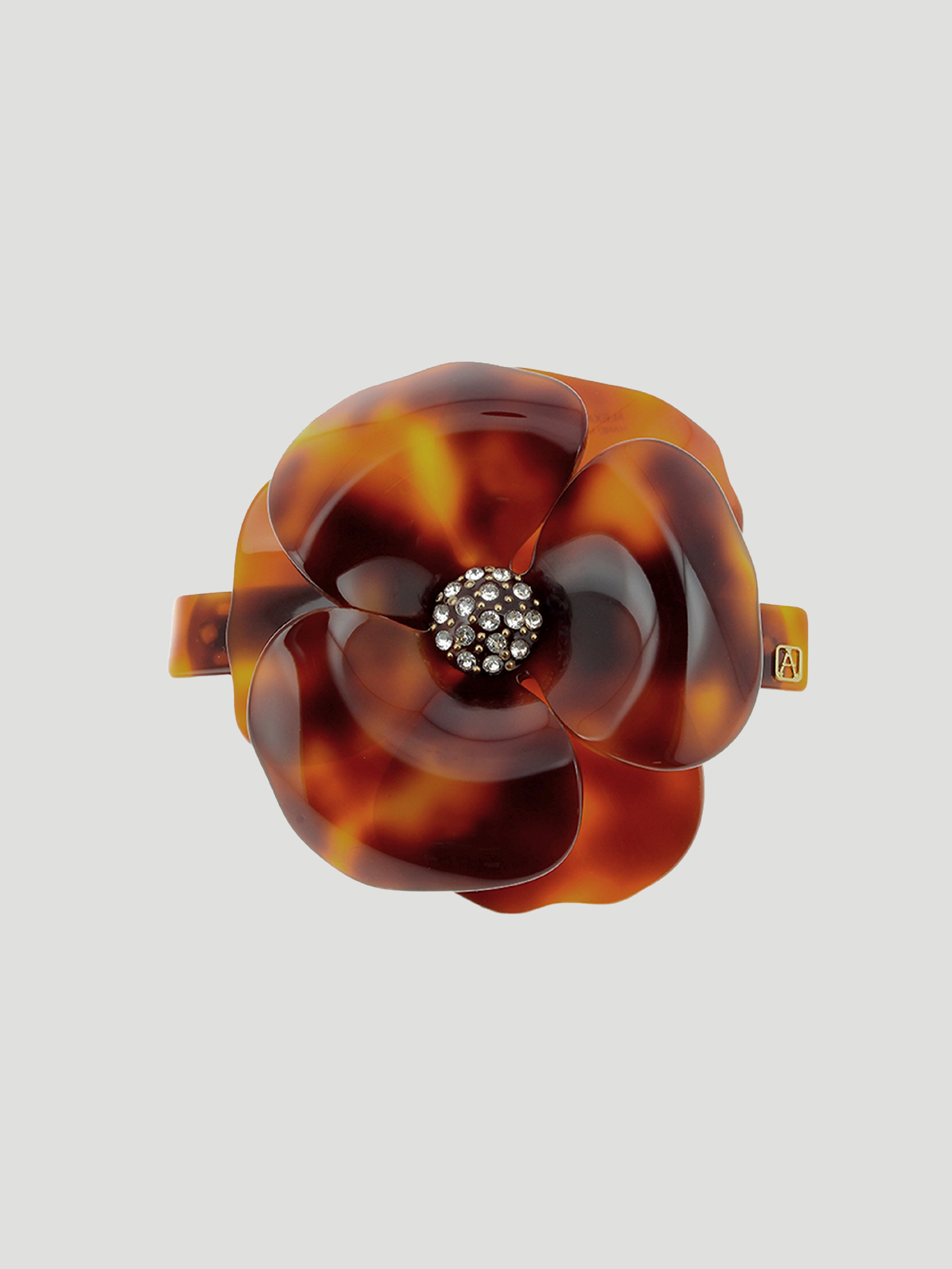Elevate your everyday look with Alexandre de Paris' Camélia Flower Barrette. Handcrafted in France with Italian acetate, this iconic pattern exudes sensuality and lightness. Its crystal-embellished petals add a touch of luxury, while the polished finish highlights its natural shine. Indulge in the ultimate accessory for effortless elegance.