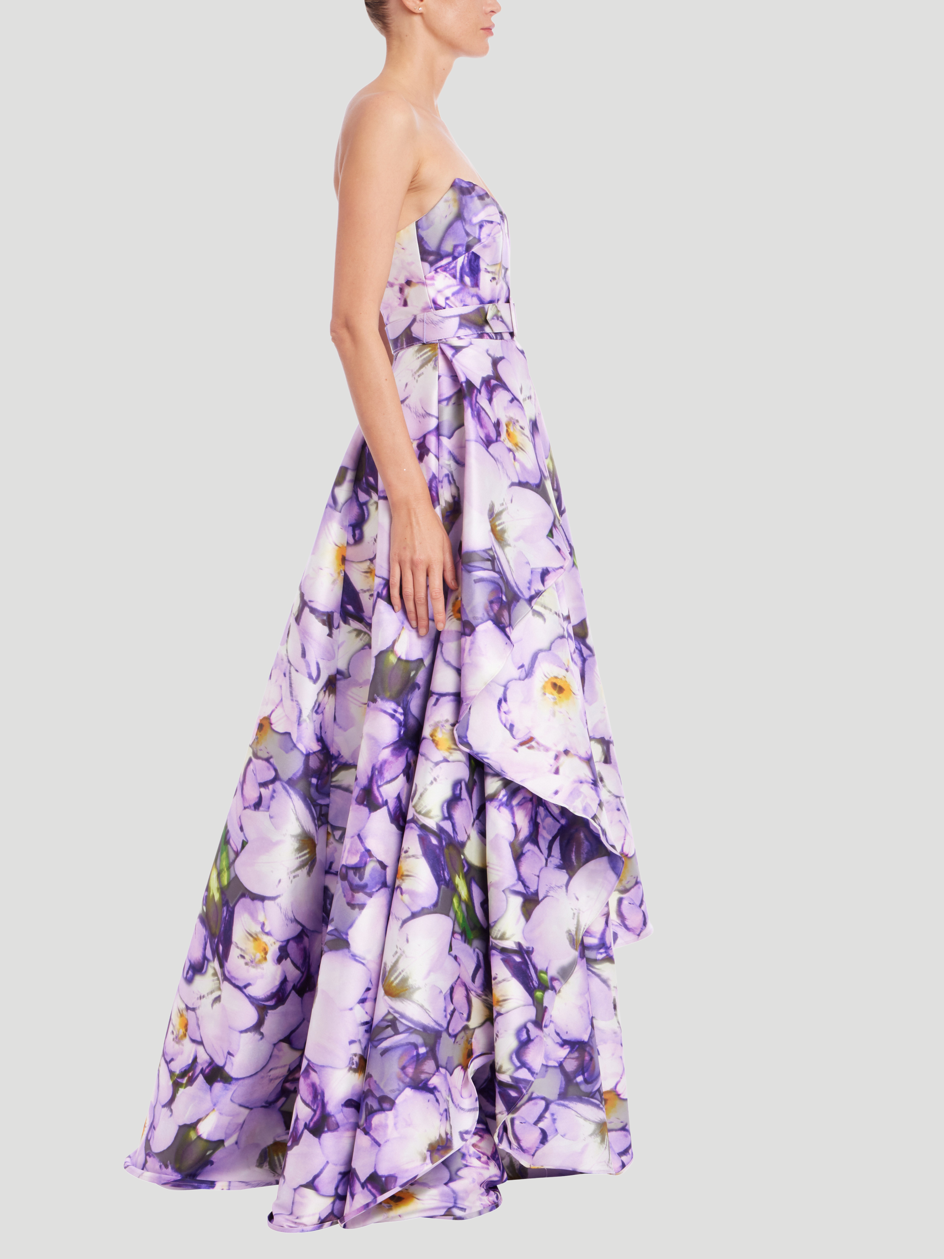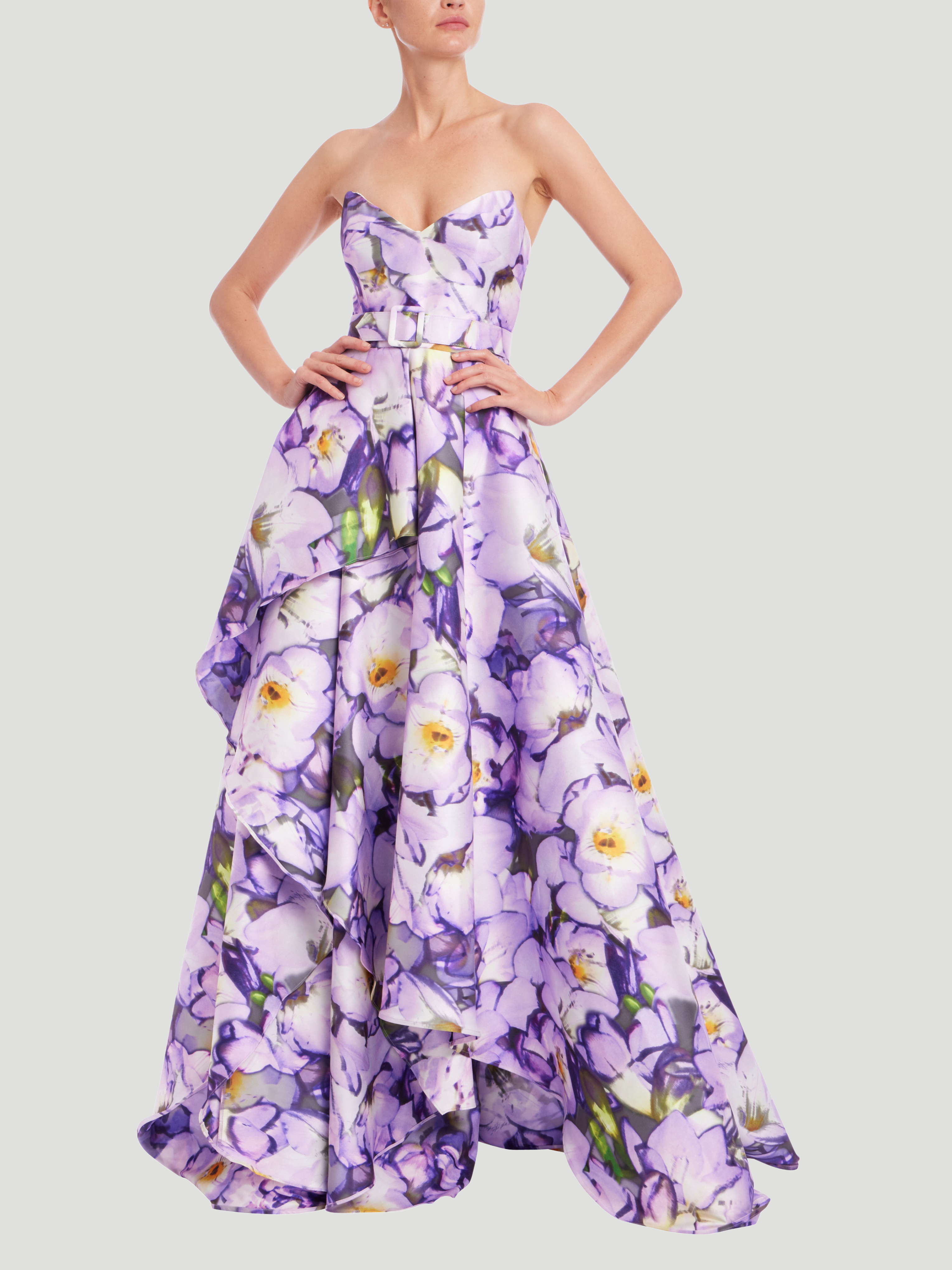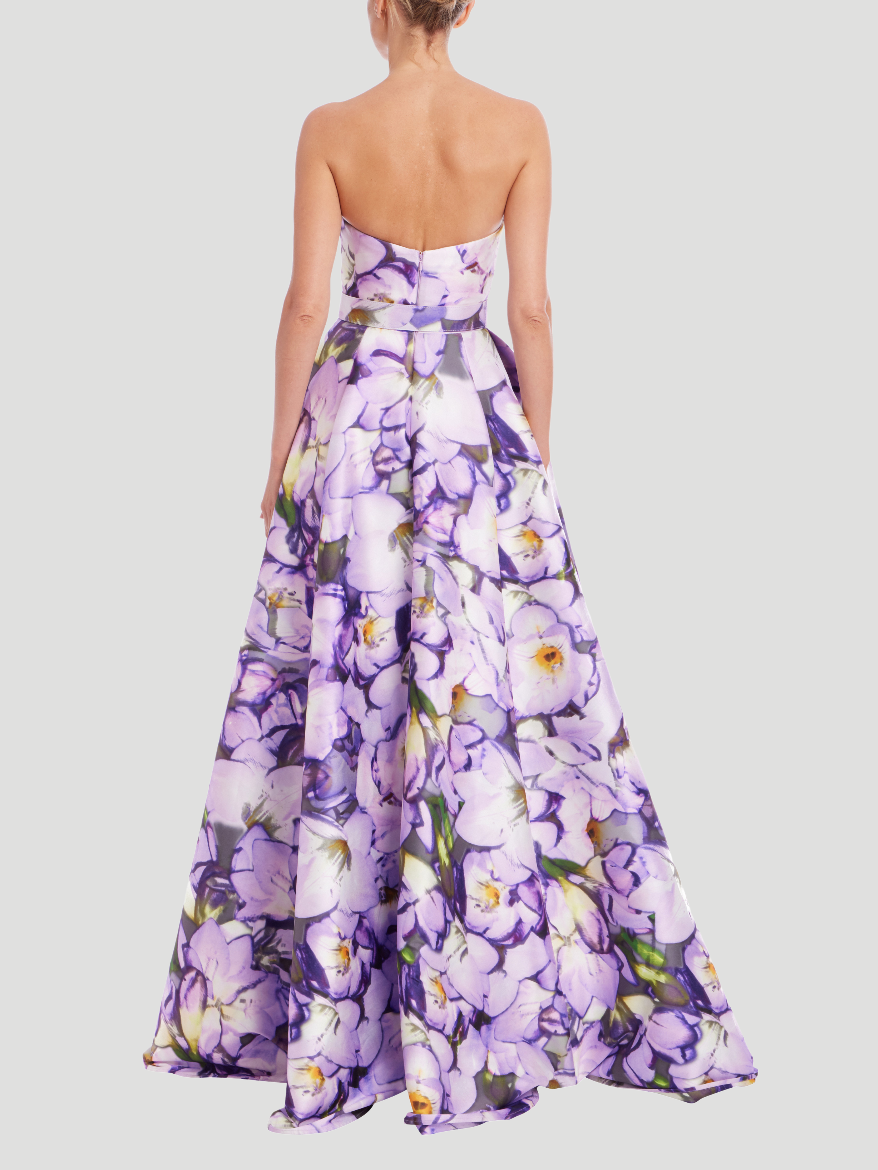 The Fold Skirt Ballgown in Lilac from Badgley Mischka is a floral masterpiece that exudes a burst of personality. Made from luxurious Mikado fabric, this strapless sweetheart gown holds its shape while delivering a sculpted feel. The bold lavender-and-white floral print adds fresh, garden-inspired energy to the design. The cinched belt and layered, fold-over skirt add definition and movement, making it the perfect choice for a romantic ballroom event.