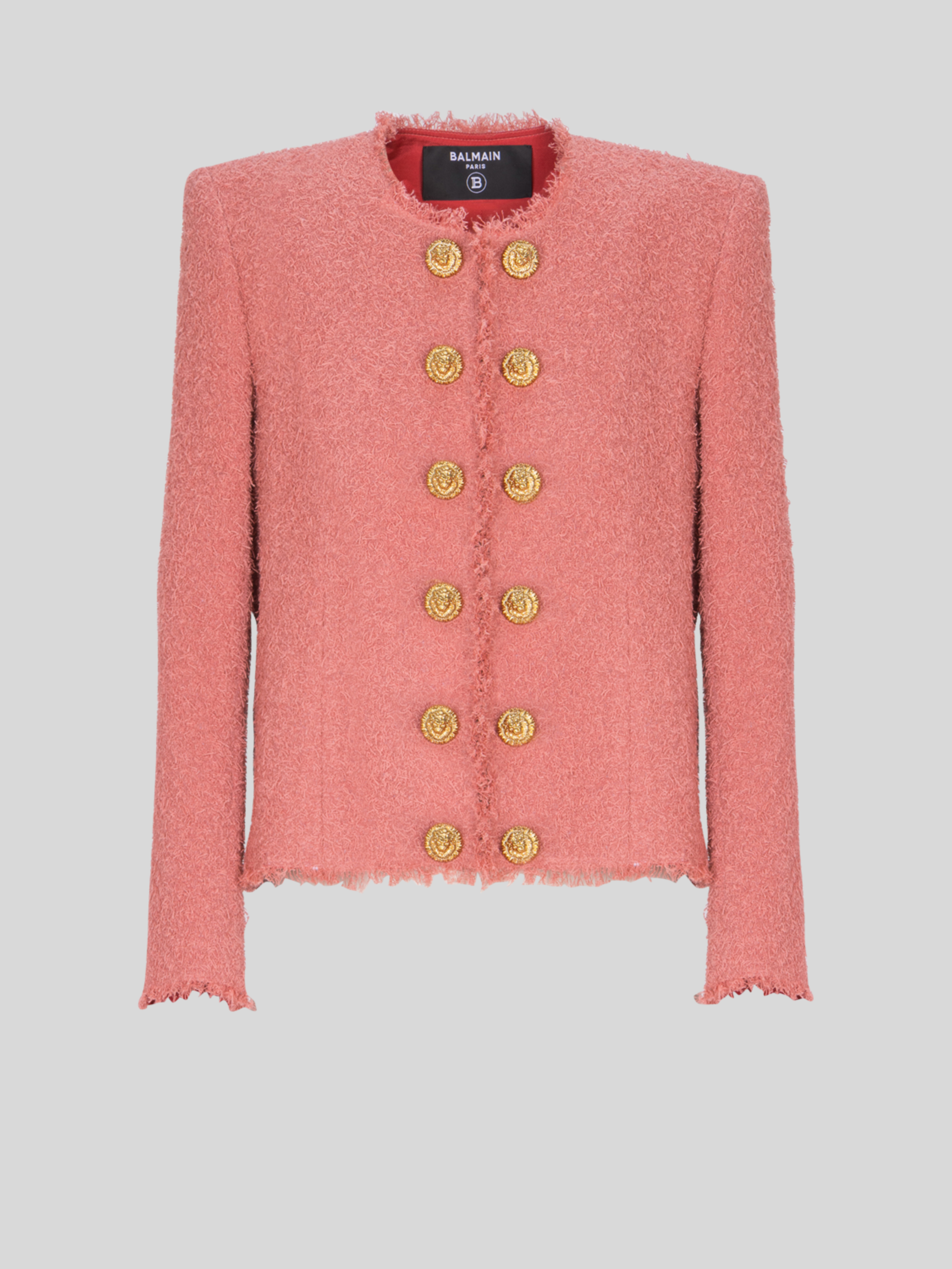 Elevate your wardrobe with this sophisticated tweed spencer jacket in a soft rose hue. Crafted from quality tweed fabric, this tailored piece features a classic silhouette that transitions seamlessly from office to weekend wear. The structured fit and refined details make it an essential layering piece for building versatile, polished outfits. Perfect for adding texture and warmth to any ensemble.
