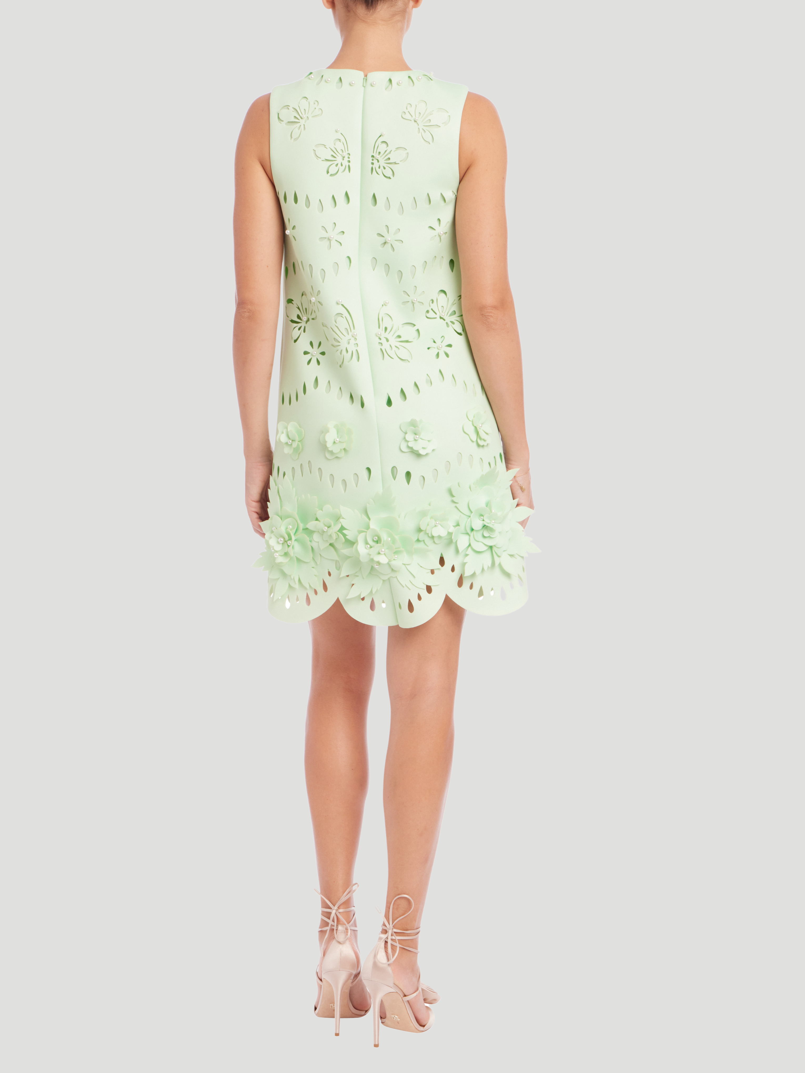 Indulge in the playful elegance of the Day Dress Cutout with Pearls. Its A-line silhouette and delicate details, such as floral cutouts and 3D pearl appliqués, create a carefree and nature-inspired look. The mint-green scuba fabric adds a breezy touch, making this dress a refreshing addition to your wardrobe.