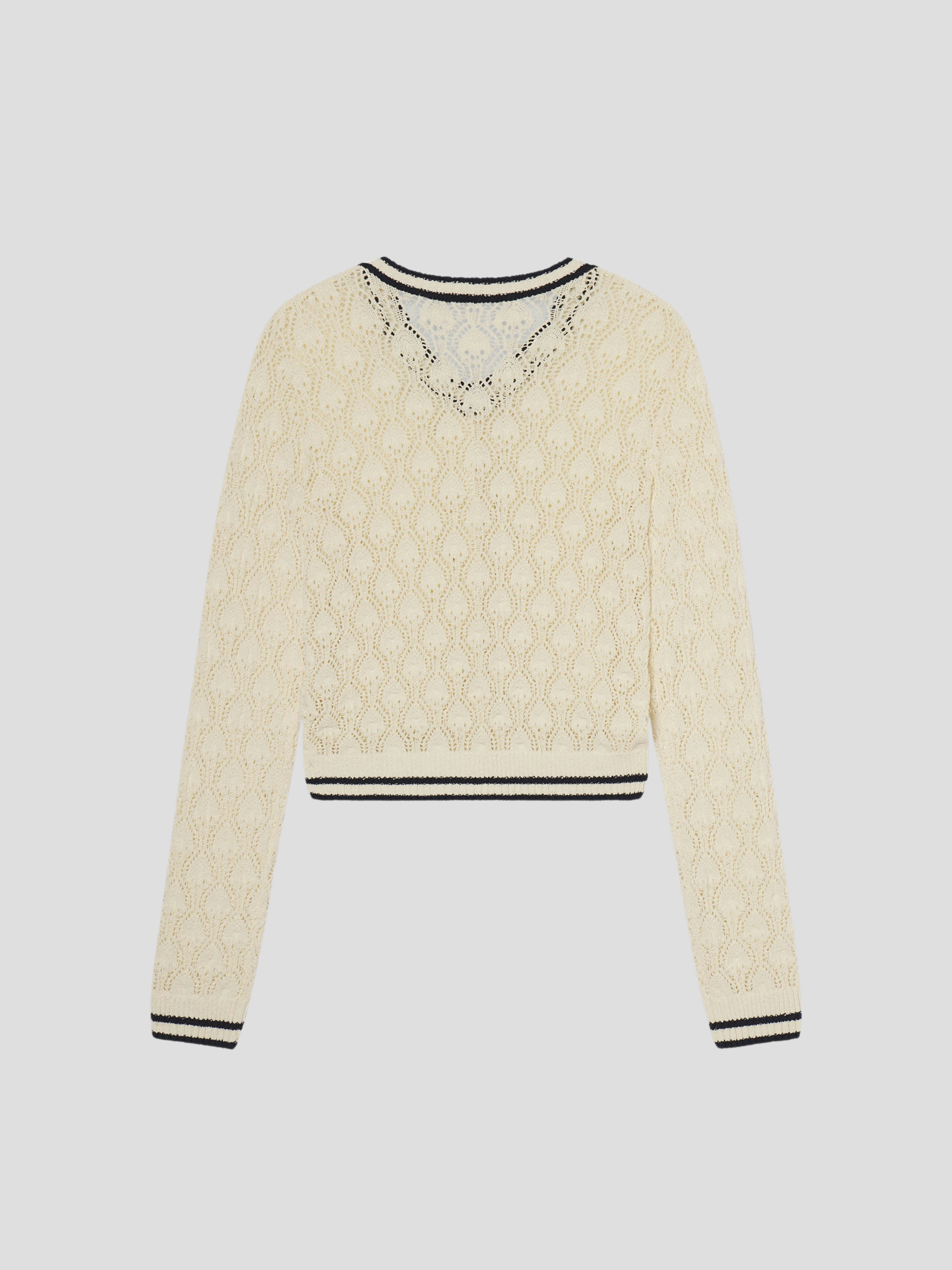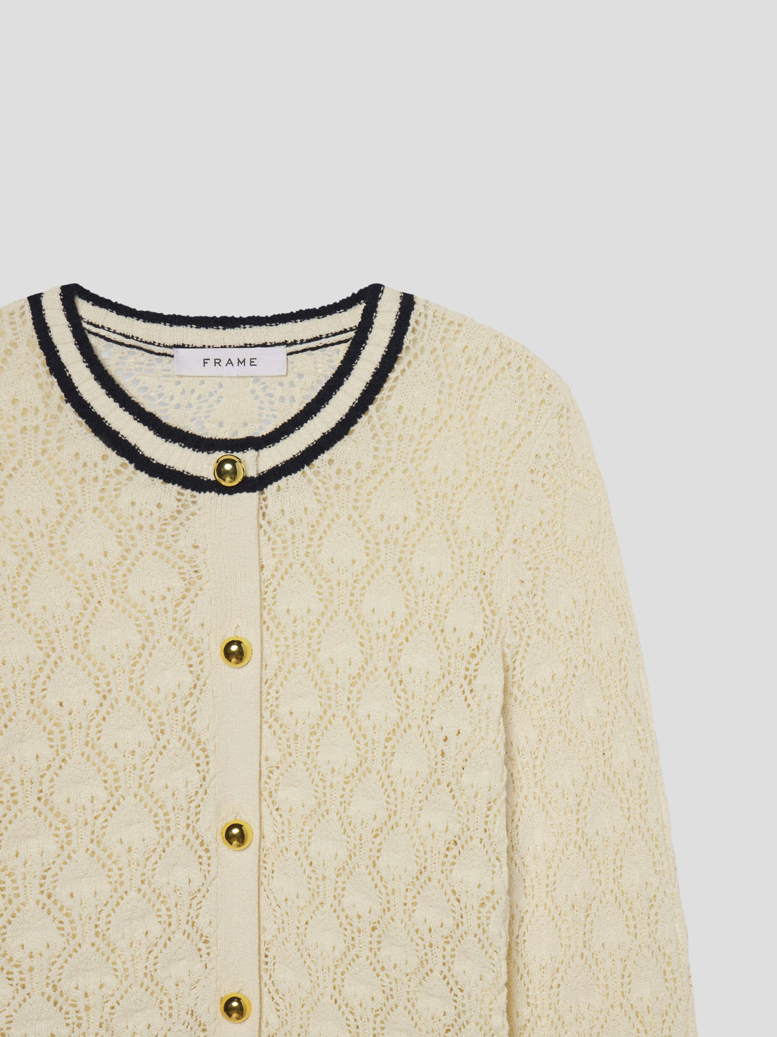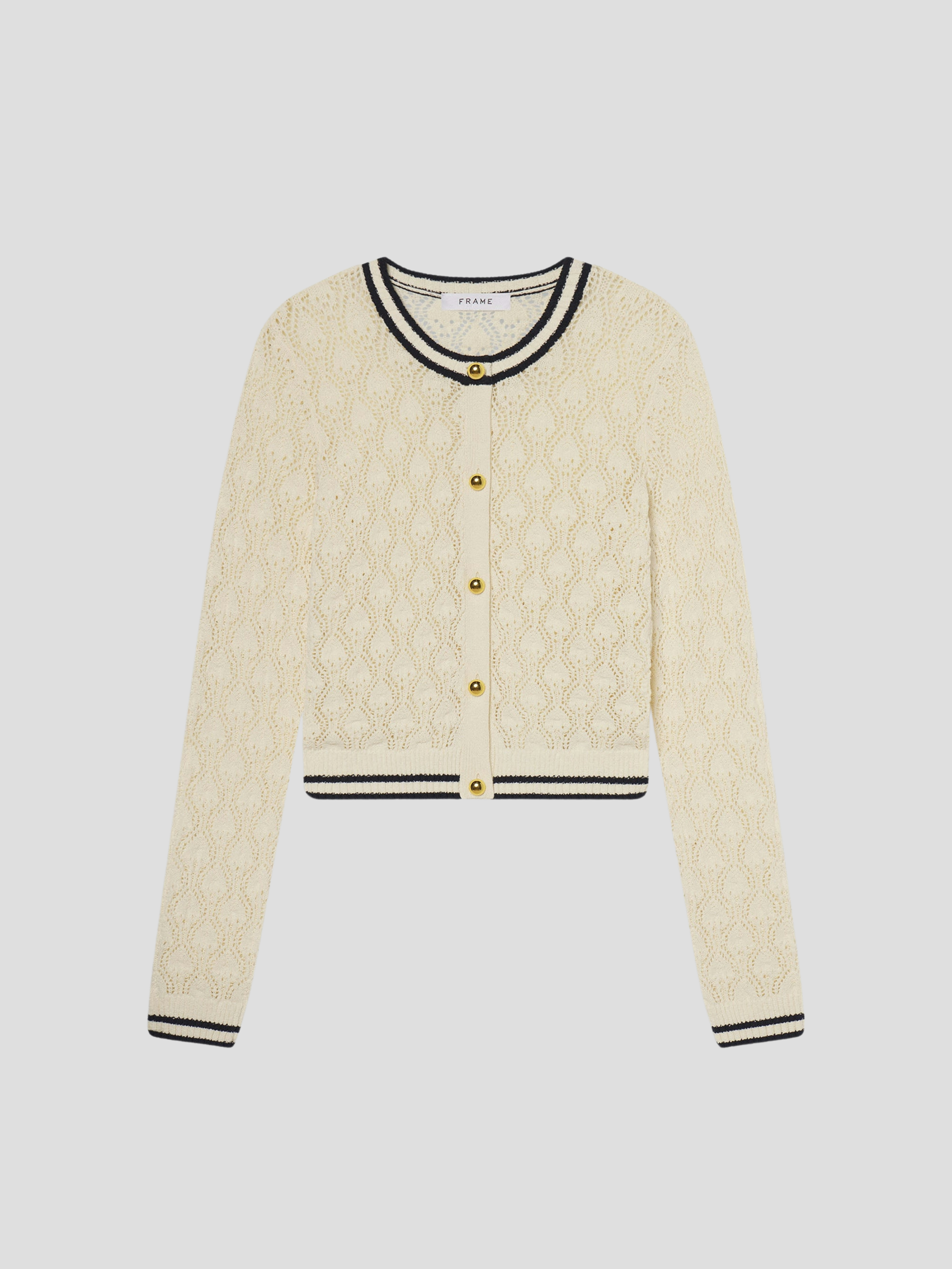 Not your first cardigan, but maybe your favorite. The Rookie is a lightweight knit with openwork texture, striped trim, and gold buttons. Slightly sheer and easy to style, it’s polished with just enough play. Make it a set with The Rookie Short.