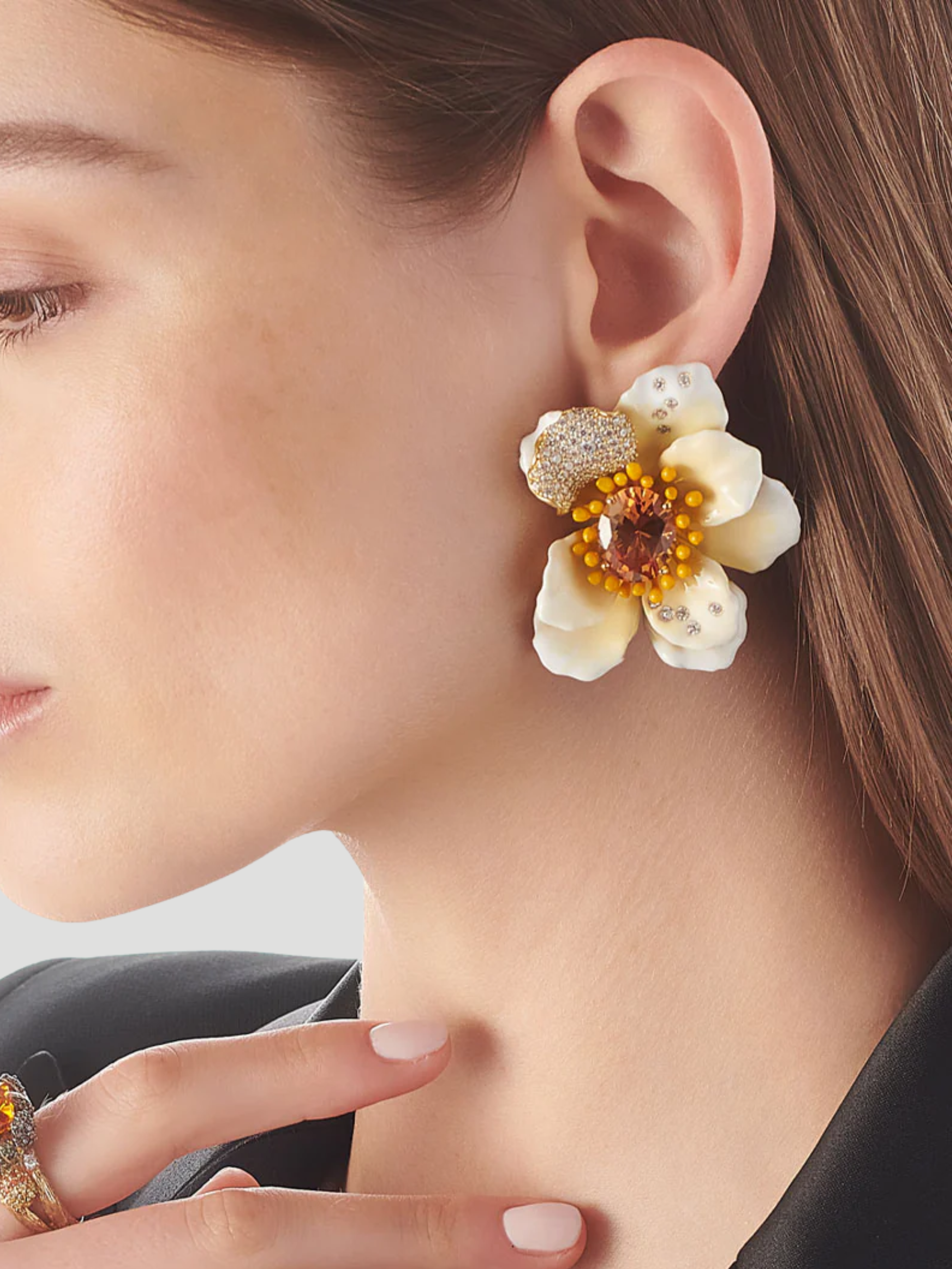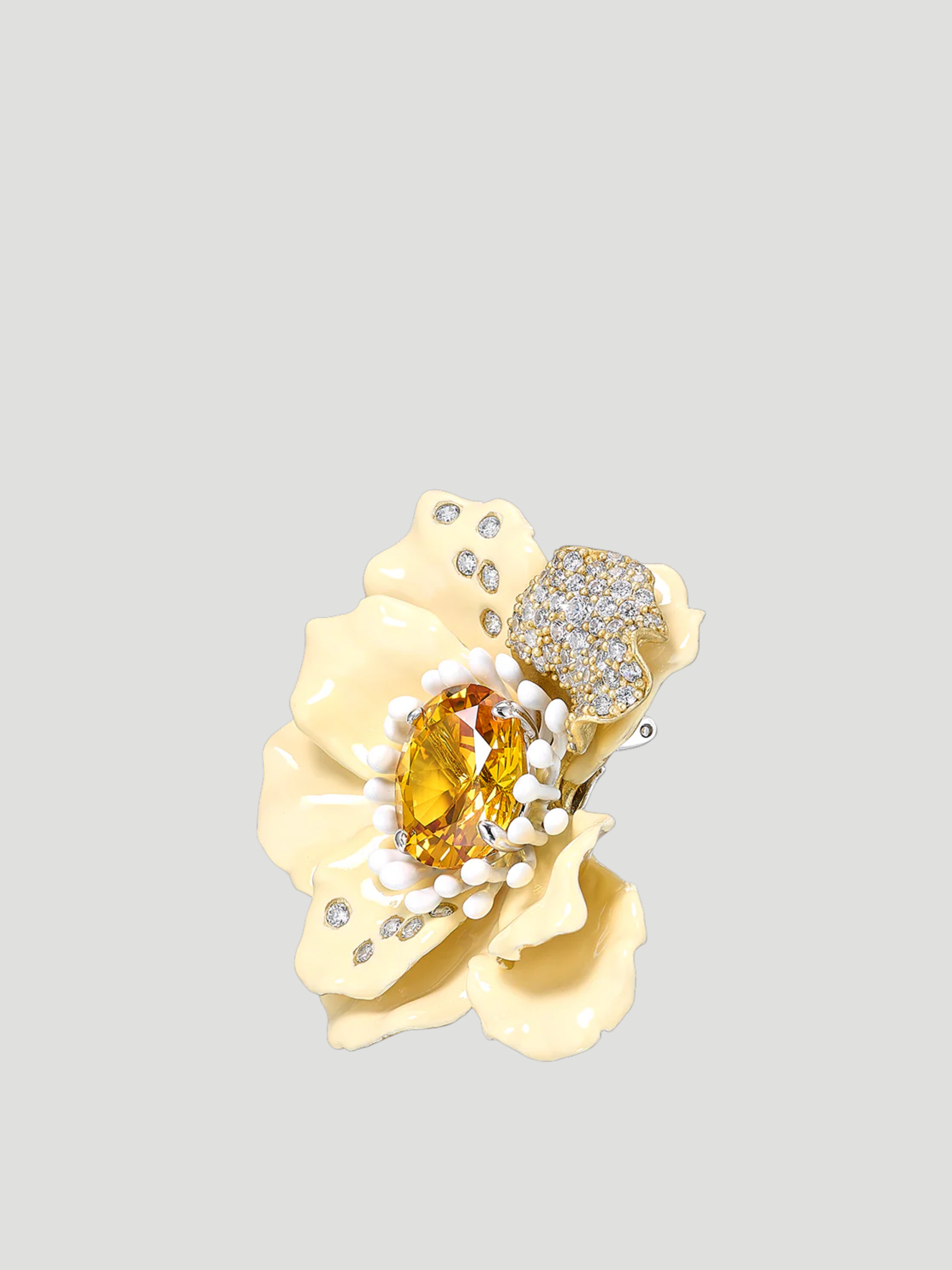 Add a touch of elegance with Anabela Chan's Ivory Poppy Earrings. These feather-light earrings feature omega backs for a comfortable fit. Hand-crafted in the UK from recycled aluminium and 18k white gold vermeil, they are hand-painted with intricate enamel detailing and adorned with laboratory-grown and created gemstones. The 10.1 carat yellow sapphires and 7.1 carat simulated diamonds add a luxurious touch to any outfit.