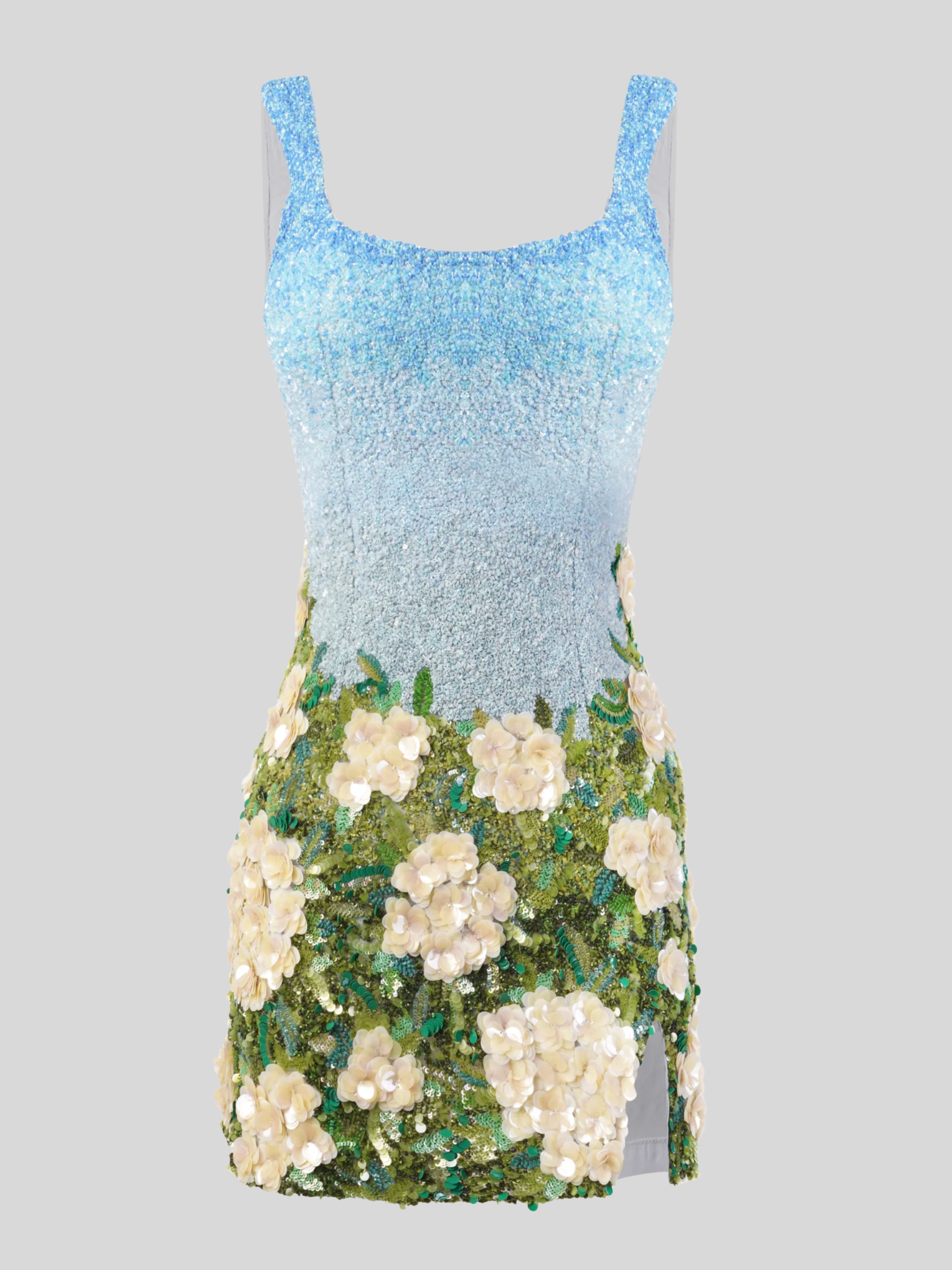 This dress is a dazzling statement of style where shimmering embroidery and oversized sequin hydrangeas bloom in breathtaking harmony. Designed to captivate, this show-stopping mini dress brings effortless glamour to every occasion, ensuring all eyes are on you.