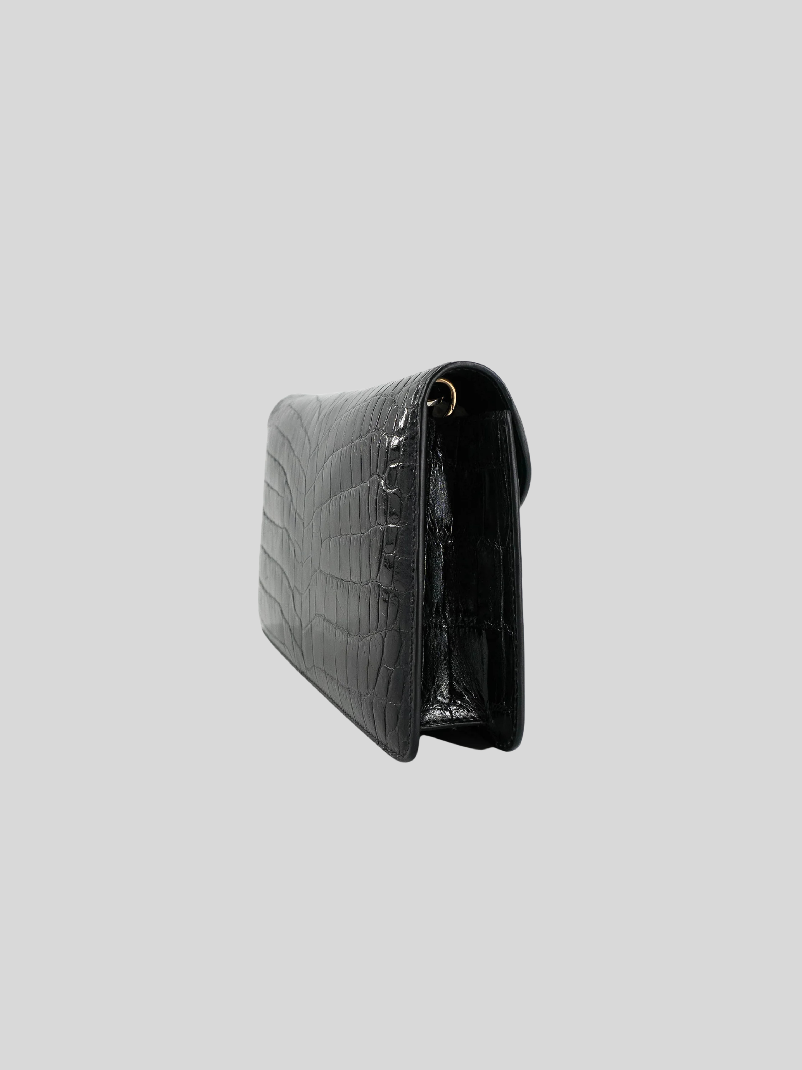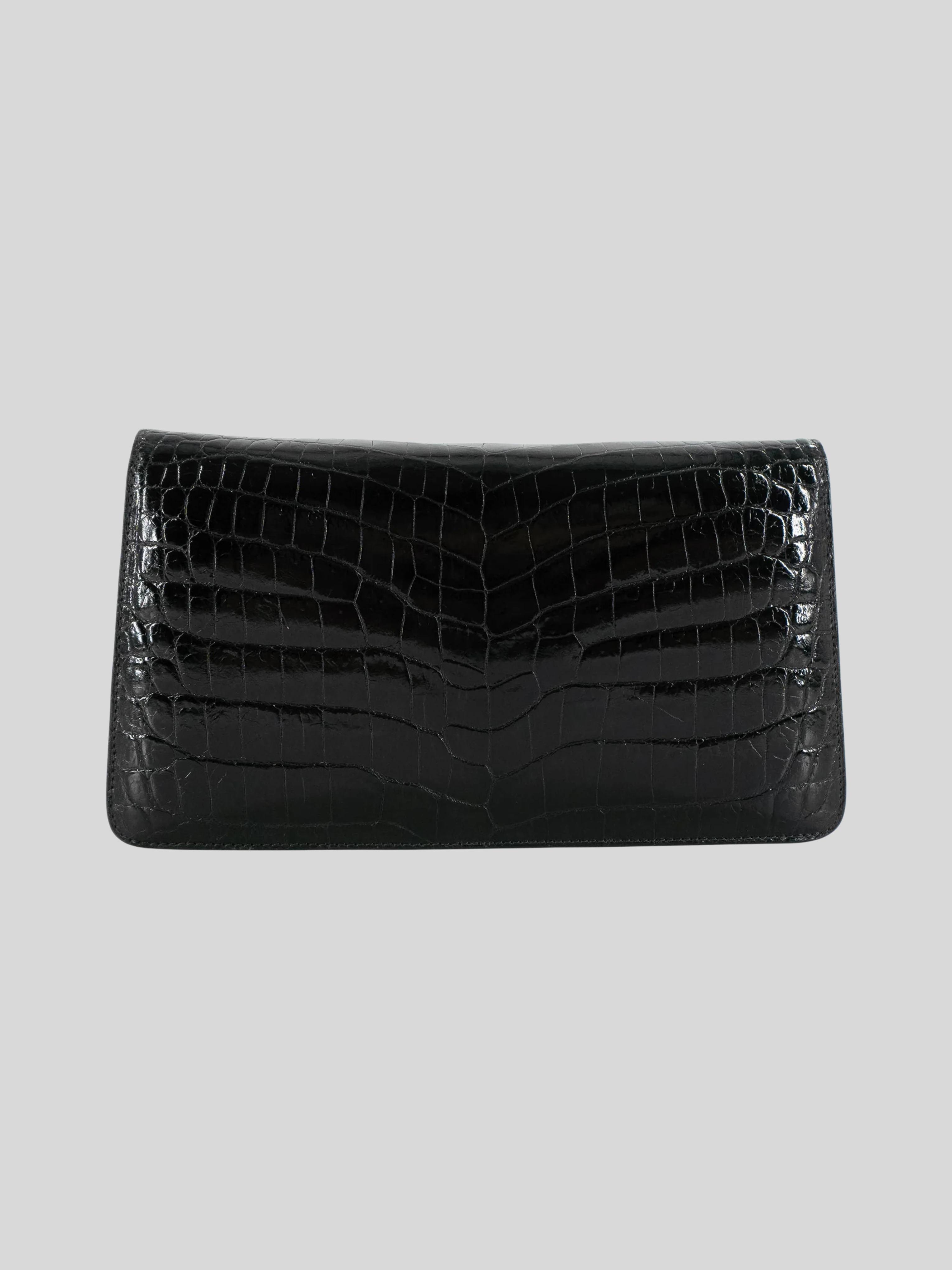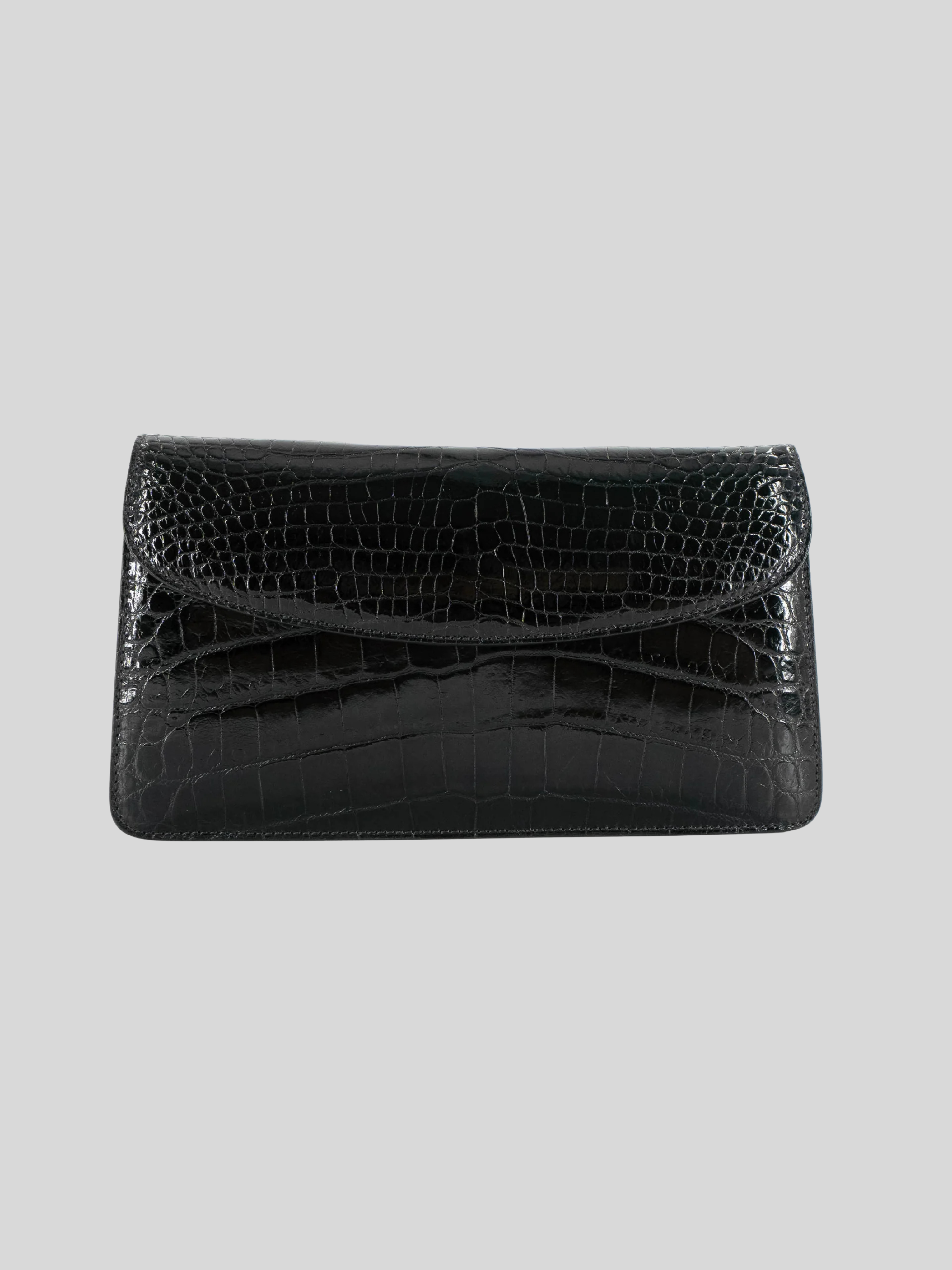 The Half Moon Standing Clutch in shiny black crocodile belly skin is a beautiful statement piece.