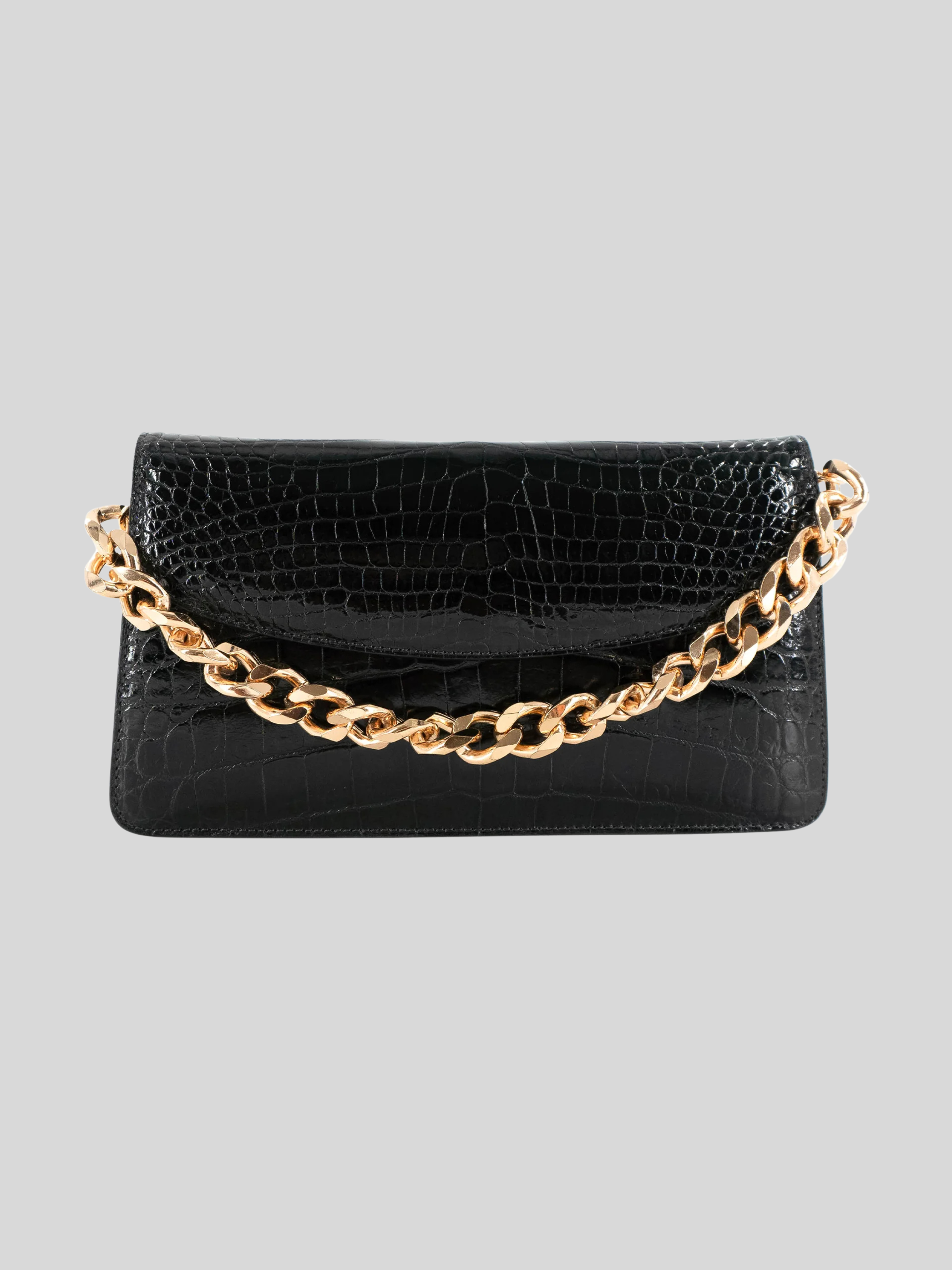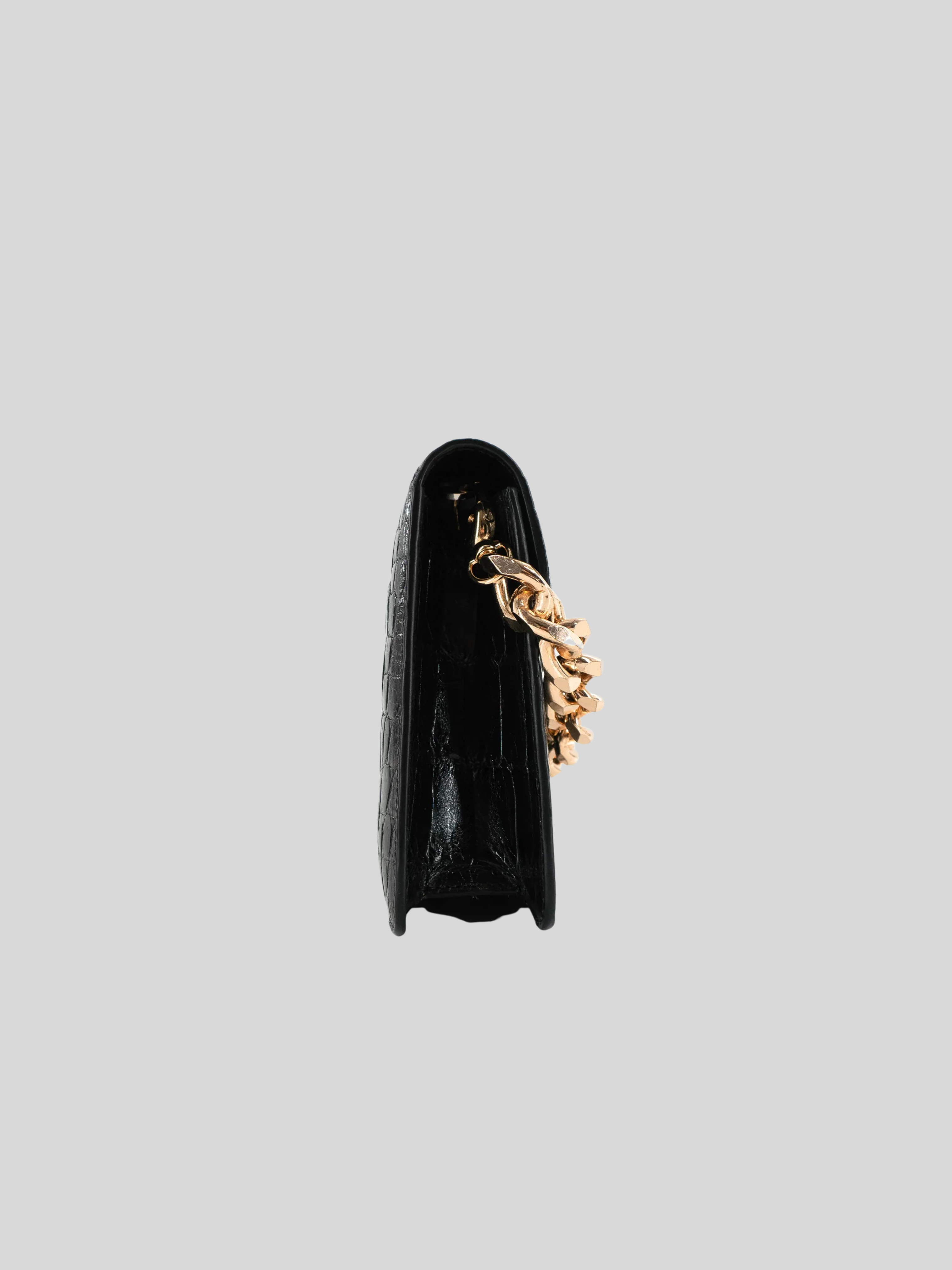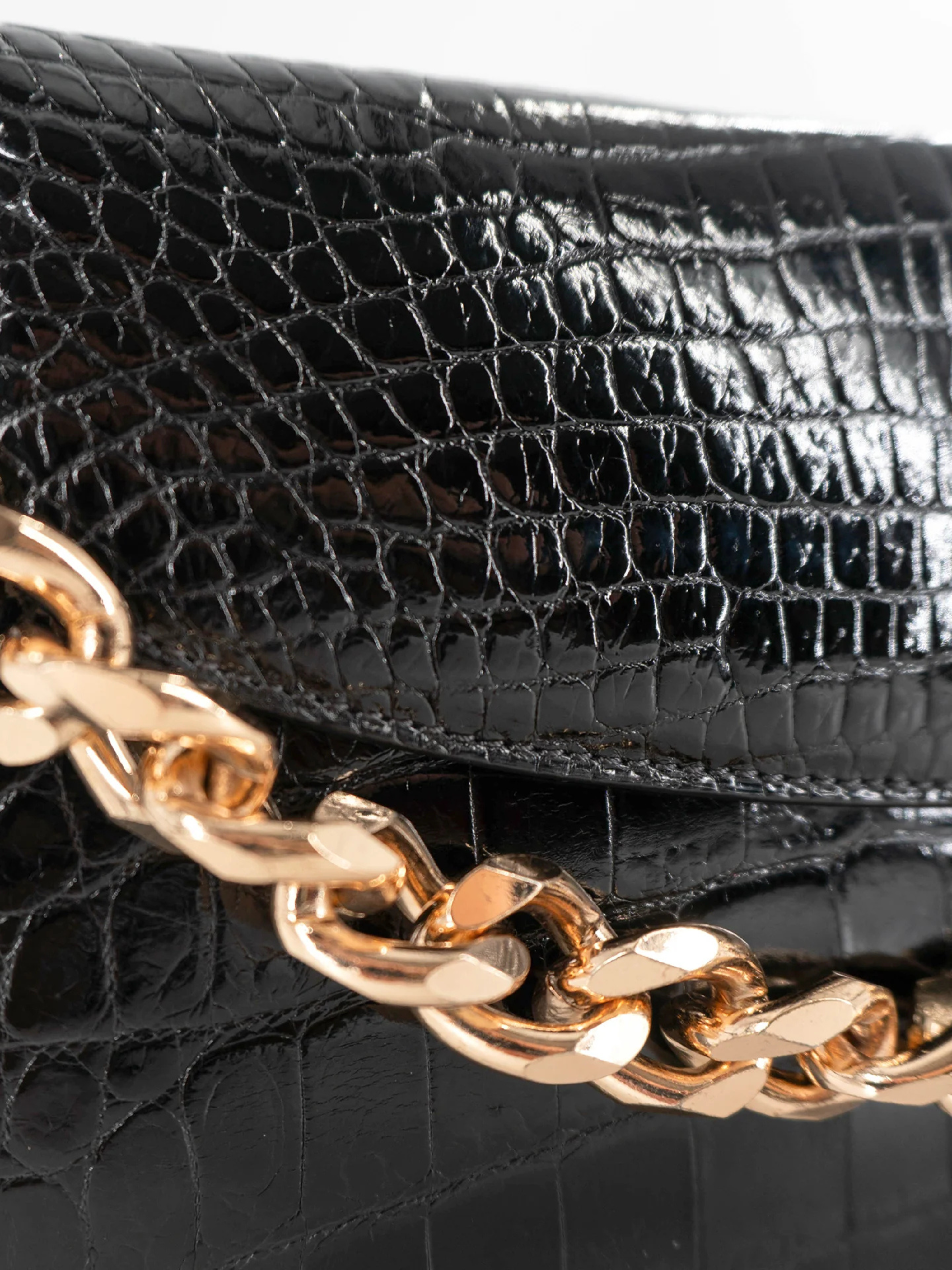 The Half Moon Standing Clutch in shiny black crocodile belly skin is a beautiful statement piece.