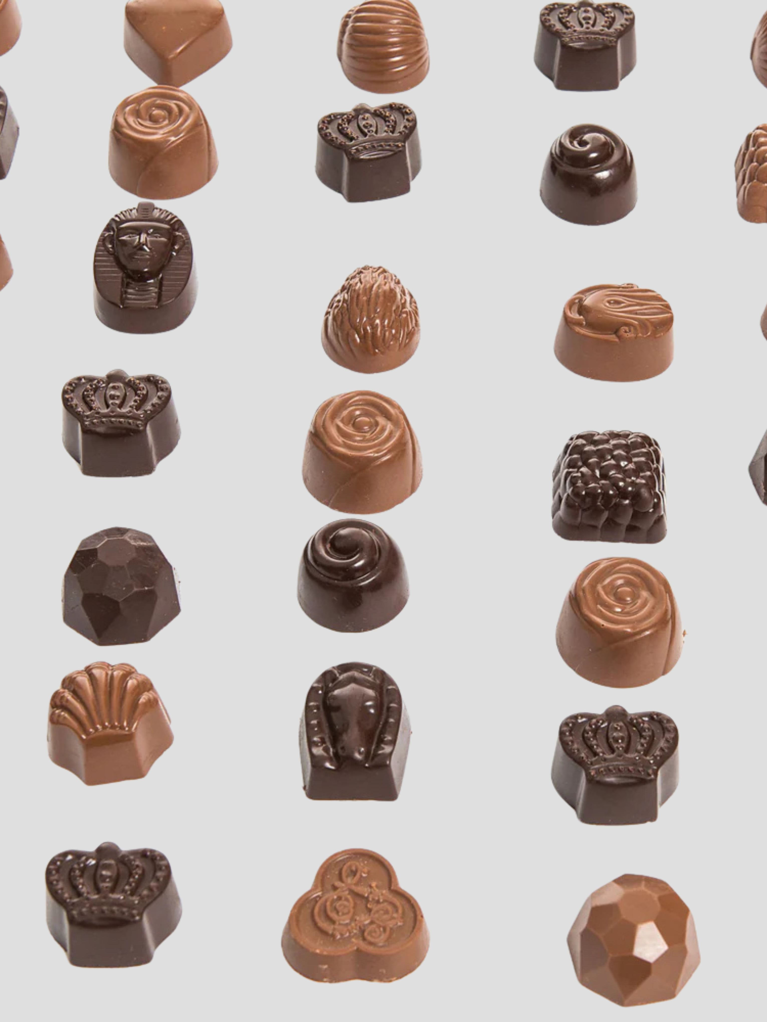 12 piece assorted chocolates: Strawberry Romanoff, Madagascar Vanilla, Pomegranate Meyer Lemon, Turkish Coffee, Pistachio di Bronte, Sicilian Orange, Coconut Almond, Passion Fruit Kumquat, Sea Salt Caramel, Flor de Cana, Rum, Piedmont Hazelnut, Black Raspberry