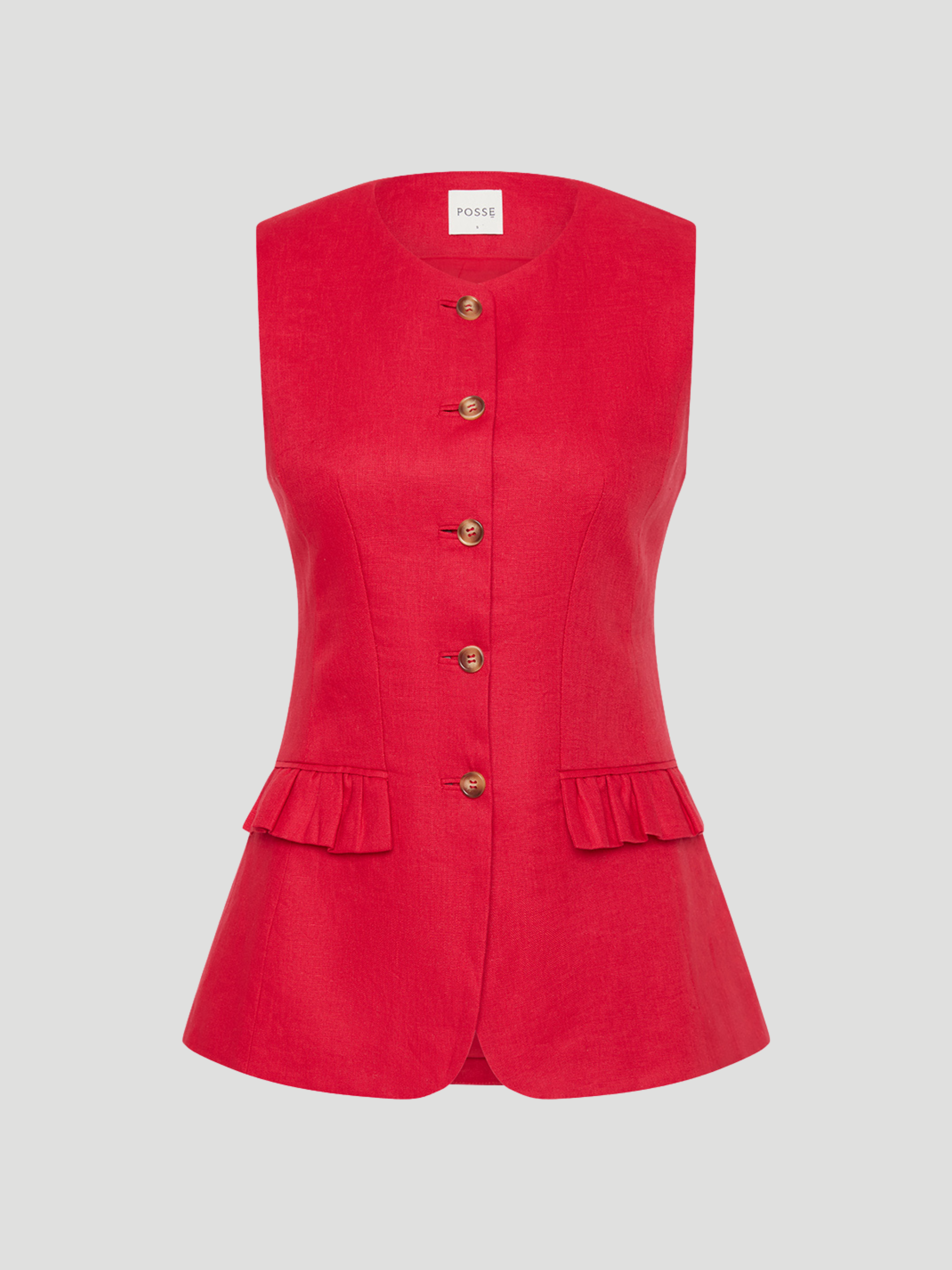 Expertly crafted from 100% linen in a bold red hue, the Matilda Gilet is a statement piece. With a jewel neckline and a flattering flared peplum hem, it can be adjusted at the back with a buckle for a personalized fit. The delicate ruffle pocket flap adds a touch of flair while also being concealable.