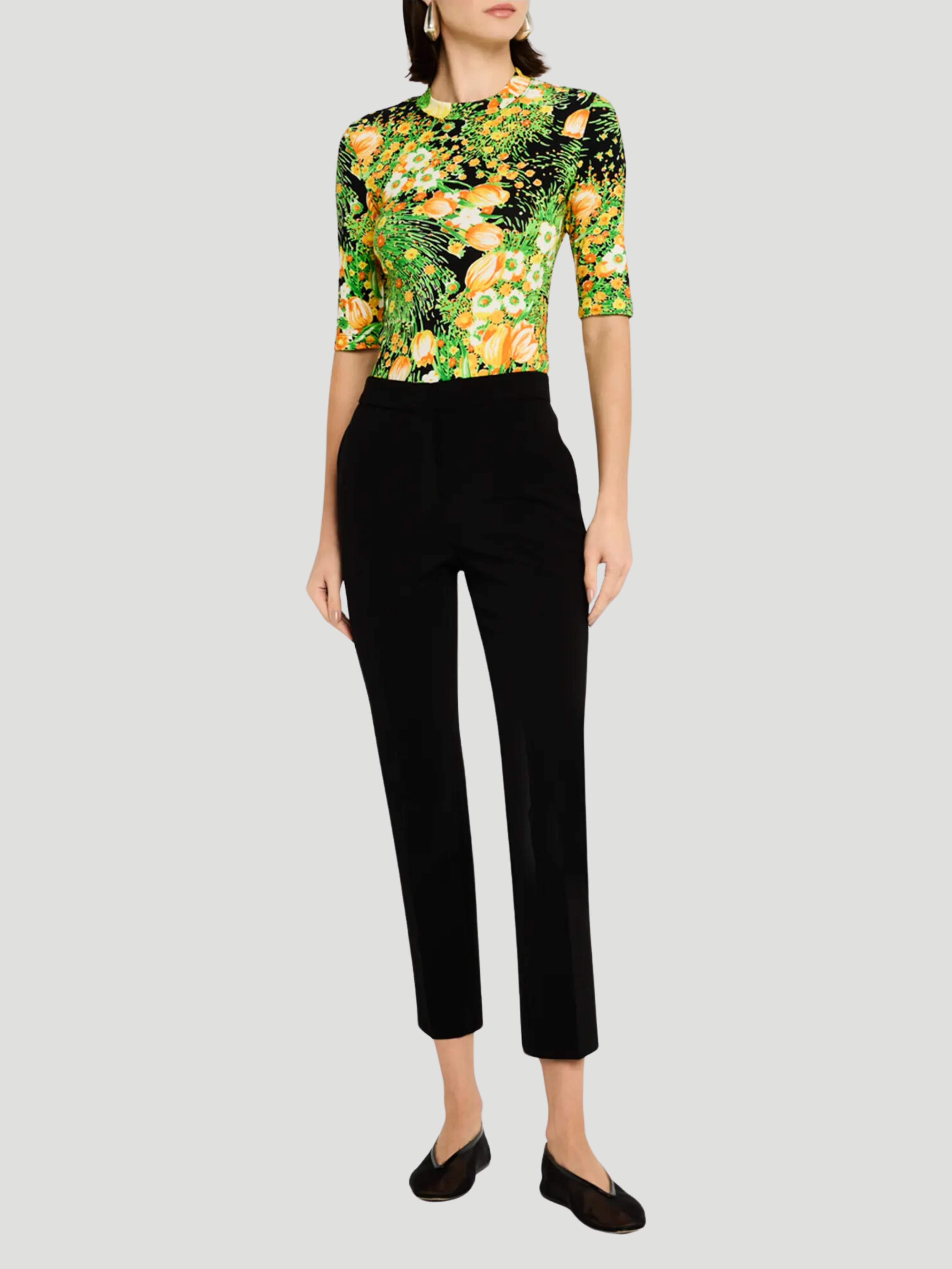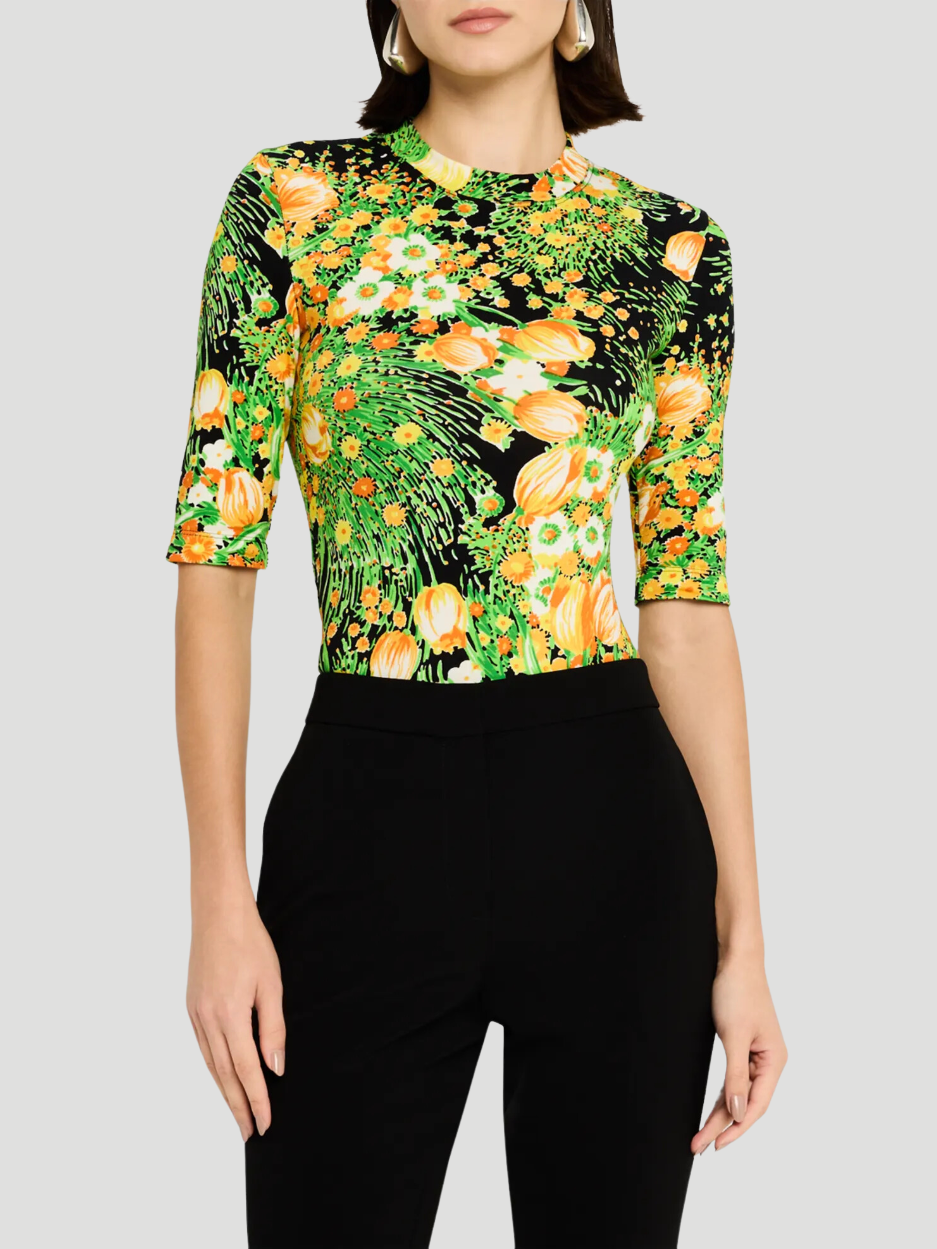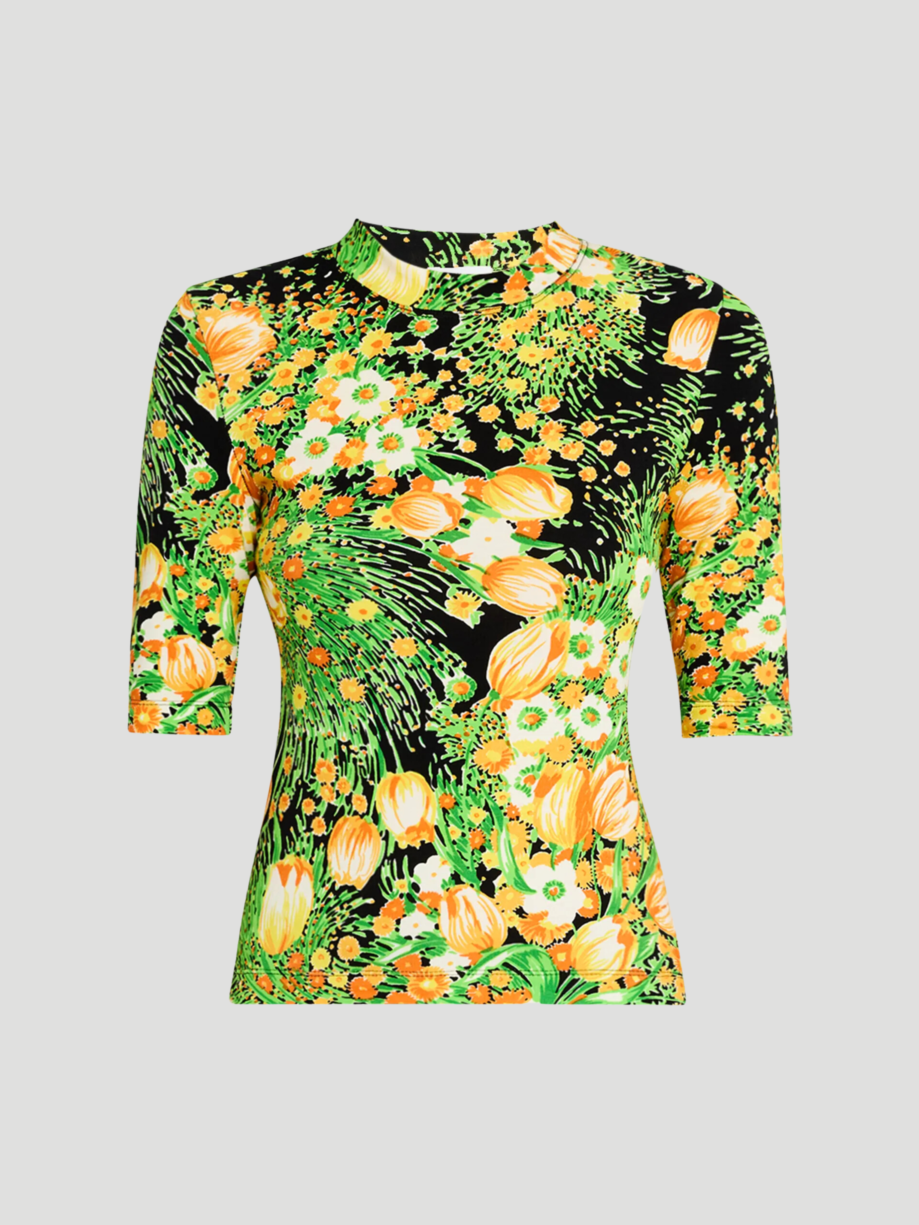 Expertly designed by Rosetta Getty, this floral-printed t-shirt brings a touch of nature to your wardrobe. The cropped sleeves and fitted style create a flattering look, while the crew neckline adds a classic touch. Perfect for adding a pop of color and style to any outfit.