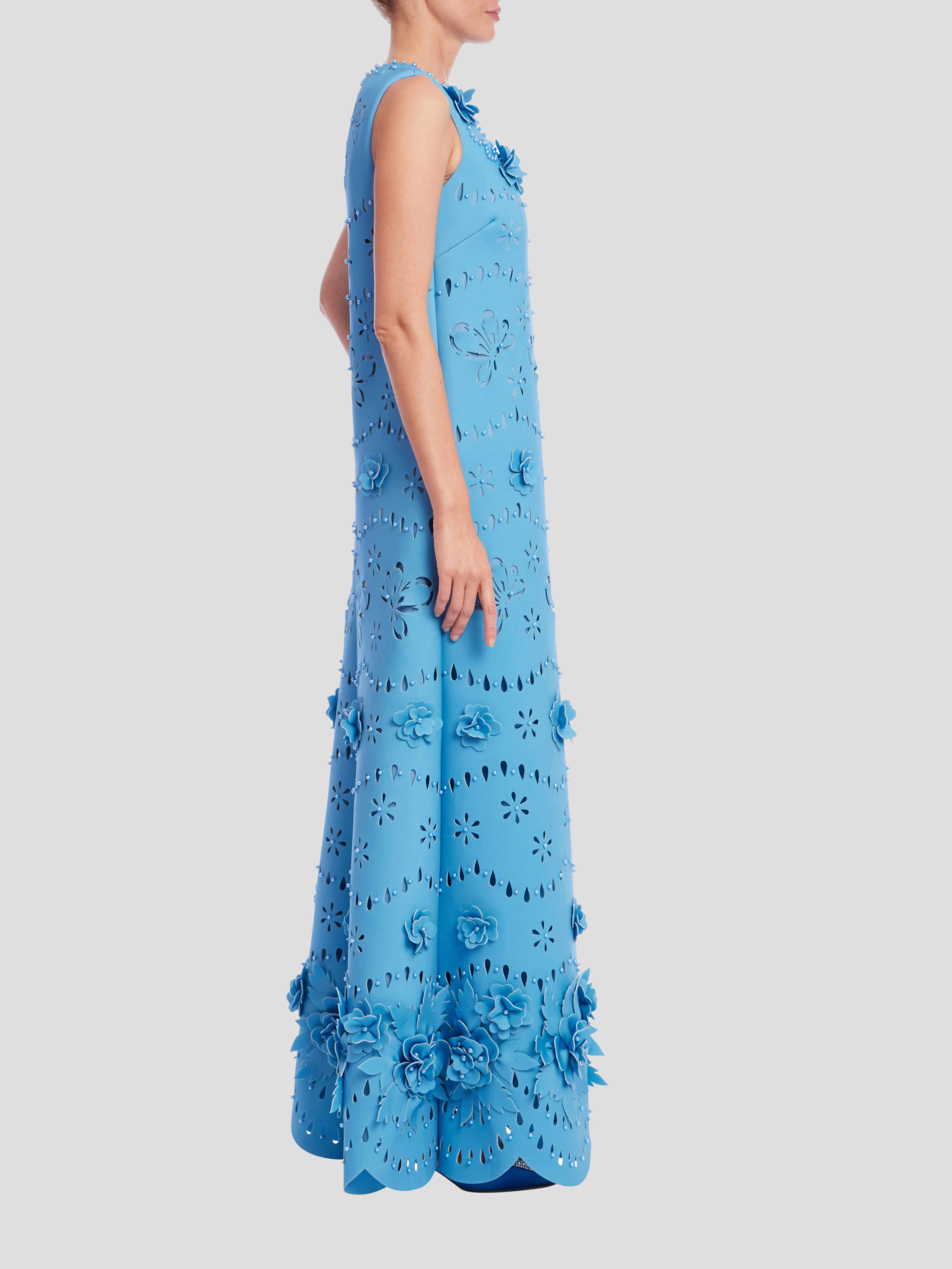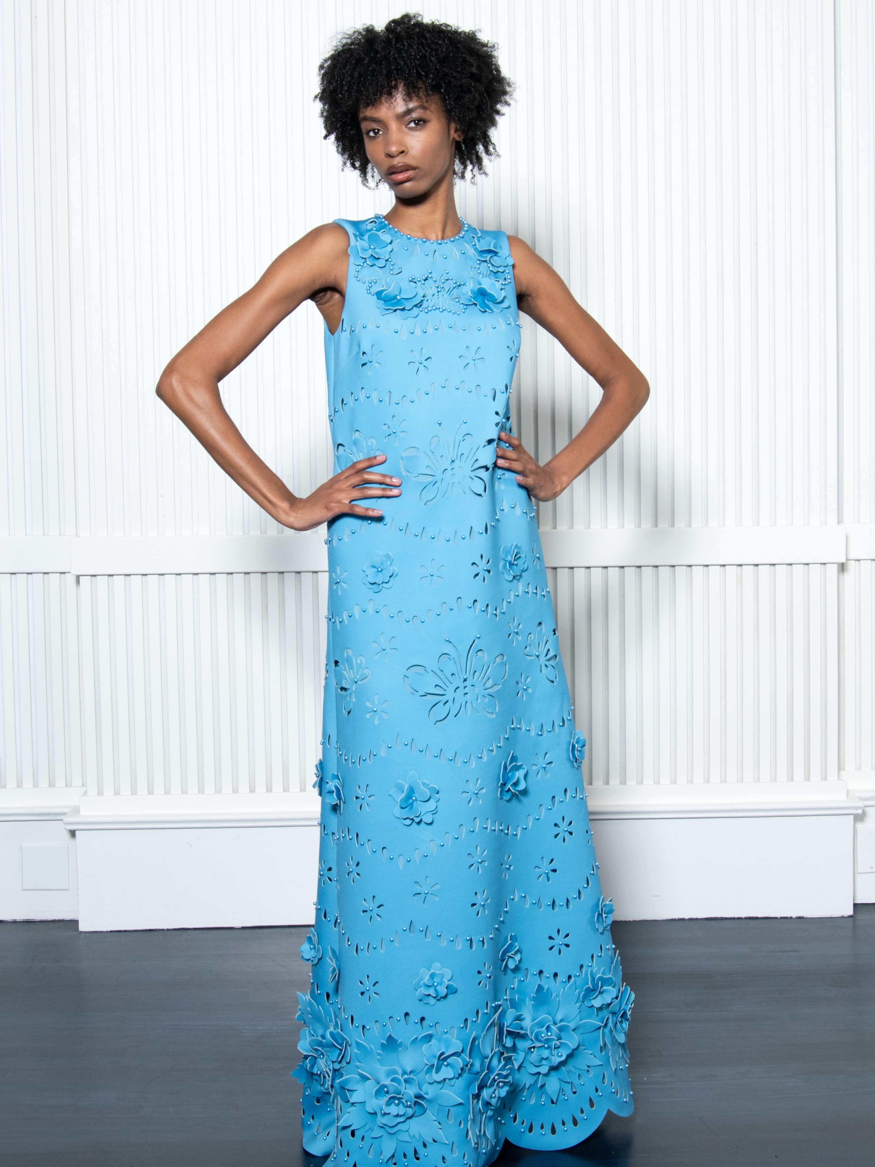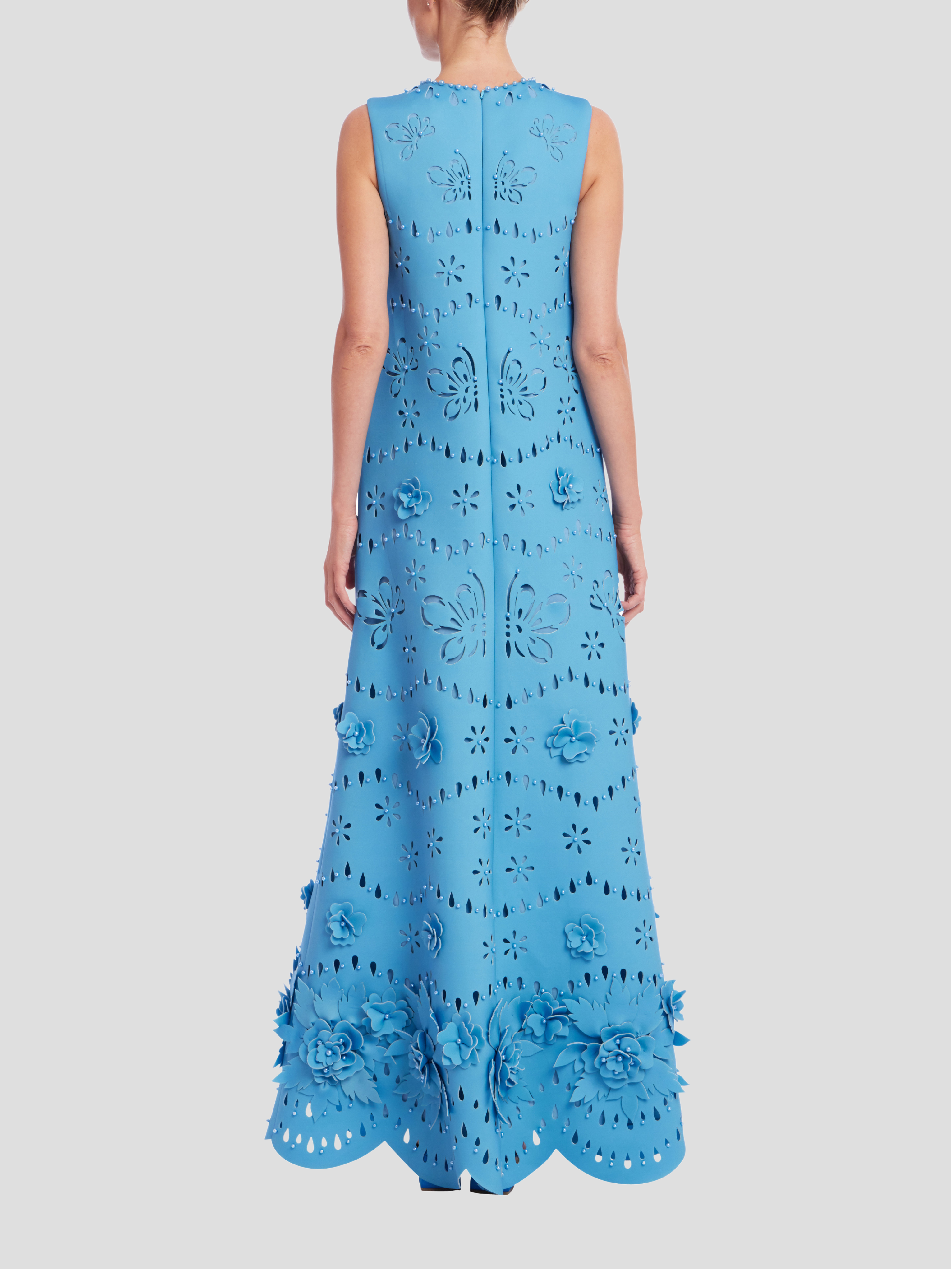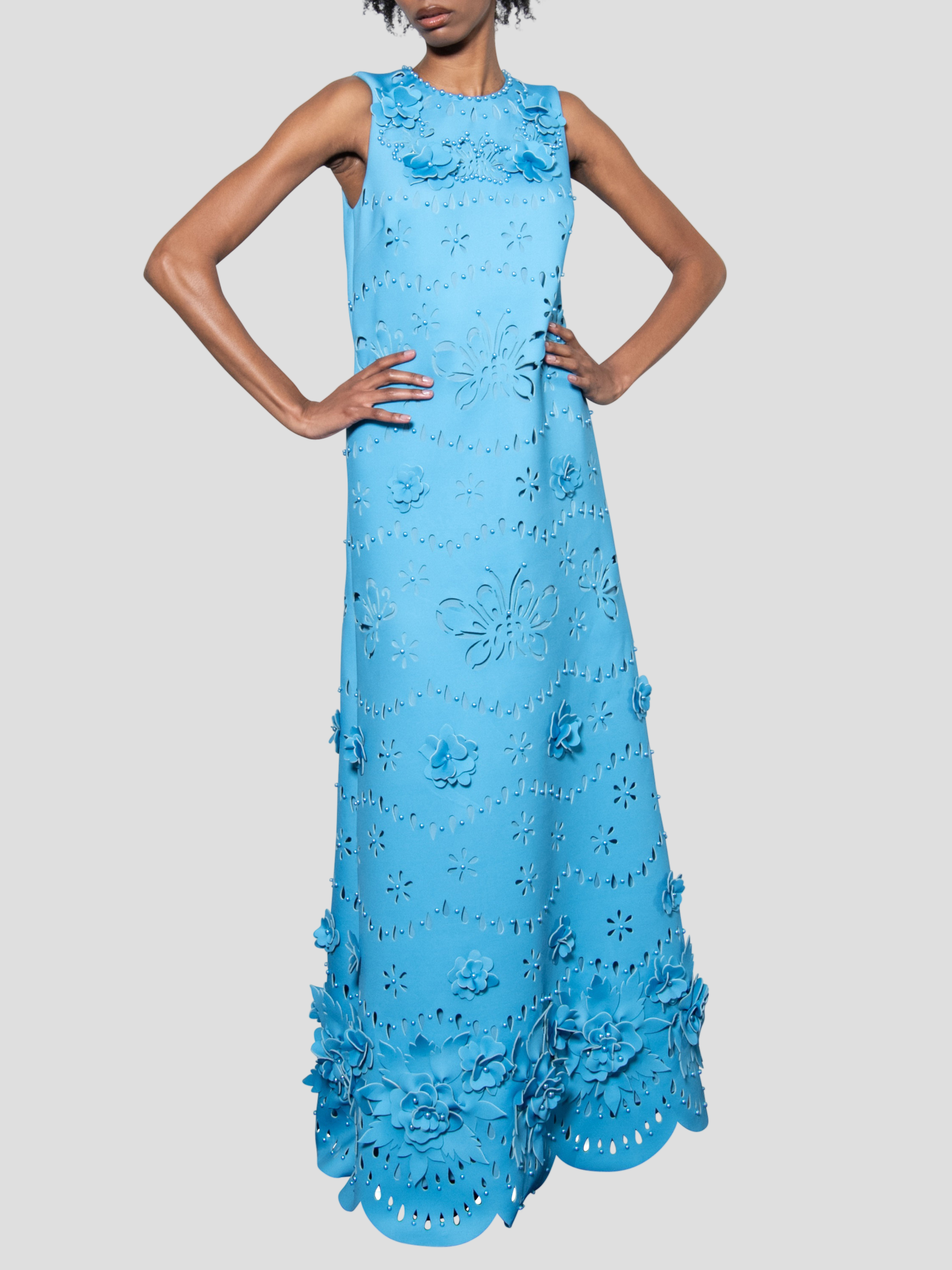 The high neckline and sleeveless cut keep things sharp and polished, while the relaxed trapeze silhouette drapes beautifully for that just-thrown-on grace. Laser-cut floral detailing gives the dress an airy, almost cutout effect, with scattered 3D appliqué blooms adding touchable texture and depth. The fluid scuba fabric finally concludes in a scalloped, petal-like hemline that adds just the right touch of sculptural romance.