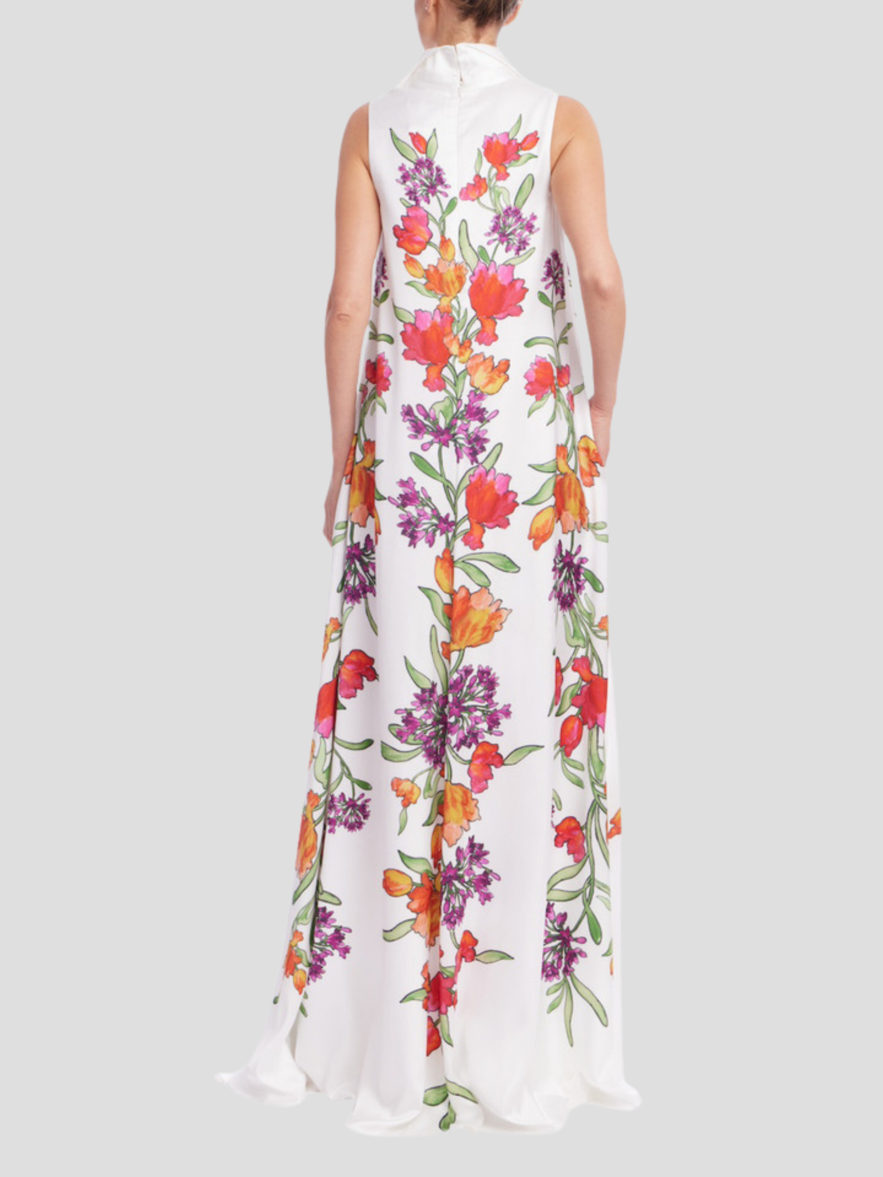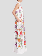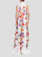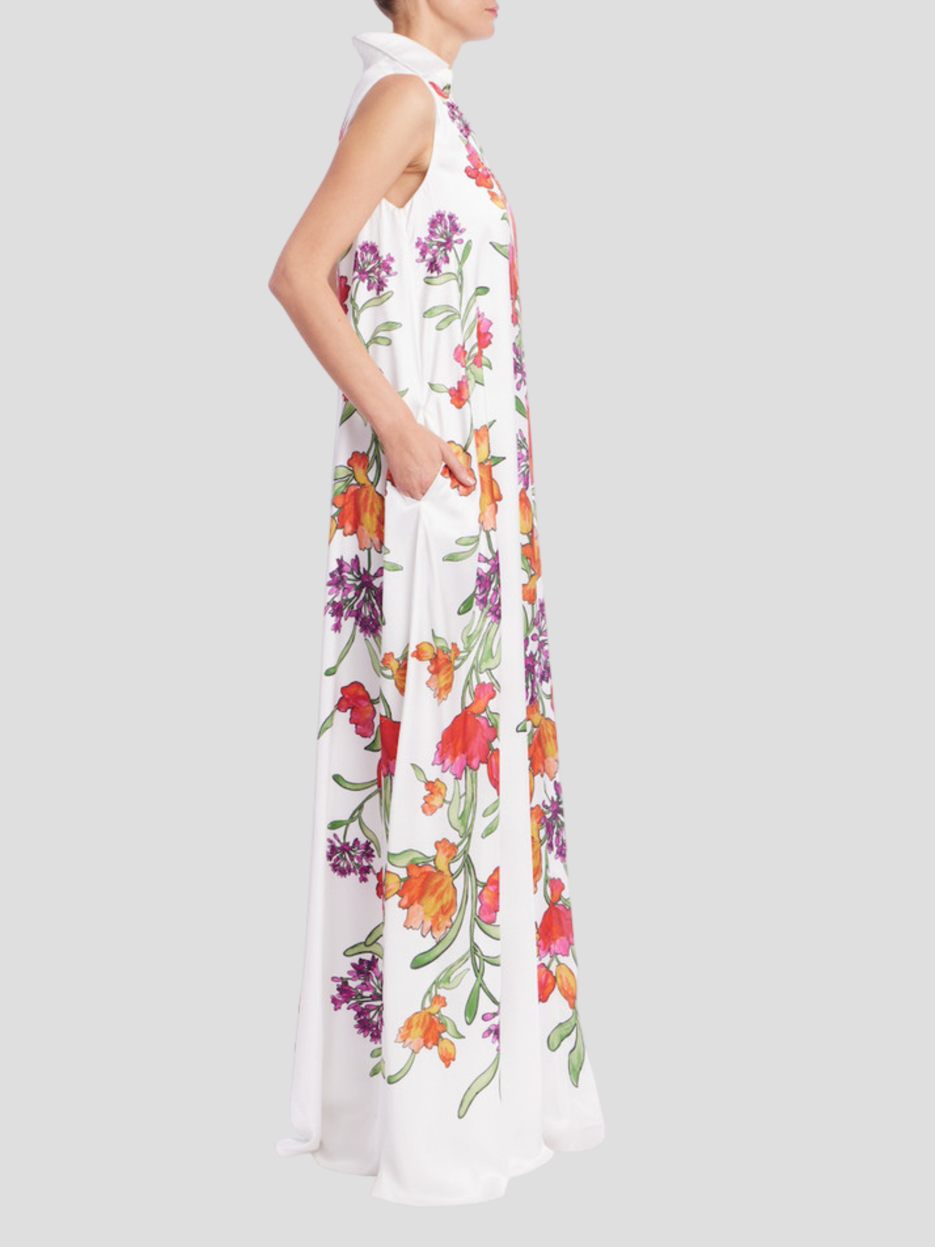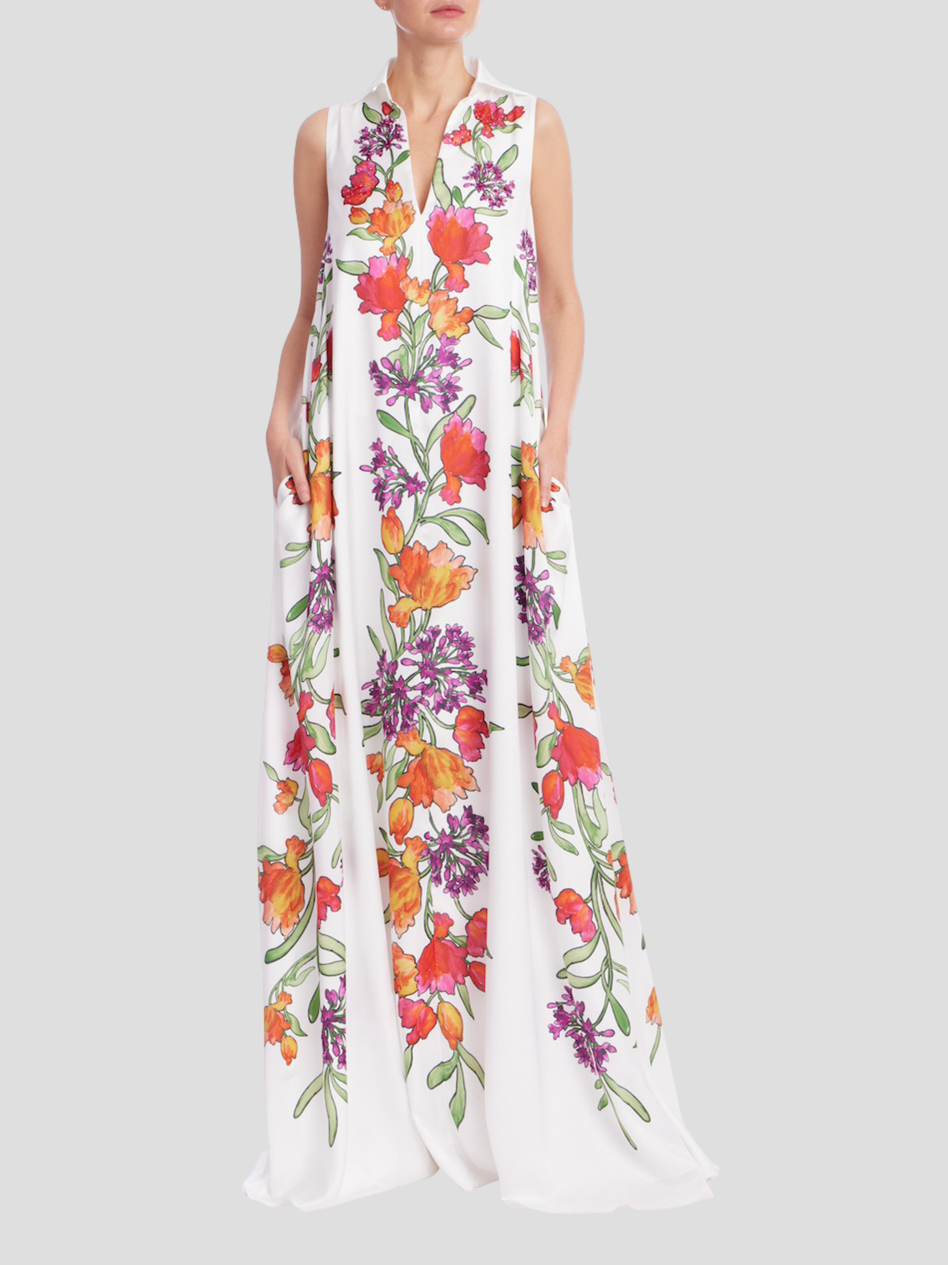 Bring bold beauty to your wardrobe with the Botanical Garden Sleeveless Maxi Dress. Featuring a striking floral print in vivid shades of orange, fuchsia, and violet, this flowing silhouette is both vibrant and effortlessly elegant. The deep V-notch neckline with a crisp stand collar adds a touch of structure, while the relaxed A-line shape and discreet side pockets enhance comfort and functionality. Made for garden parties, resort escapes, or breezy summer days, this dress is a stunning celebration of color and movement.