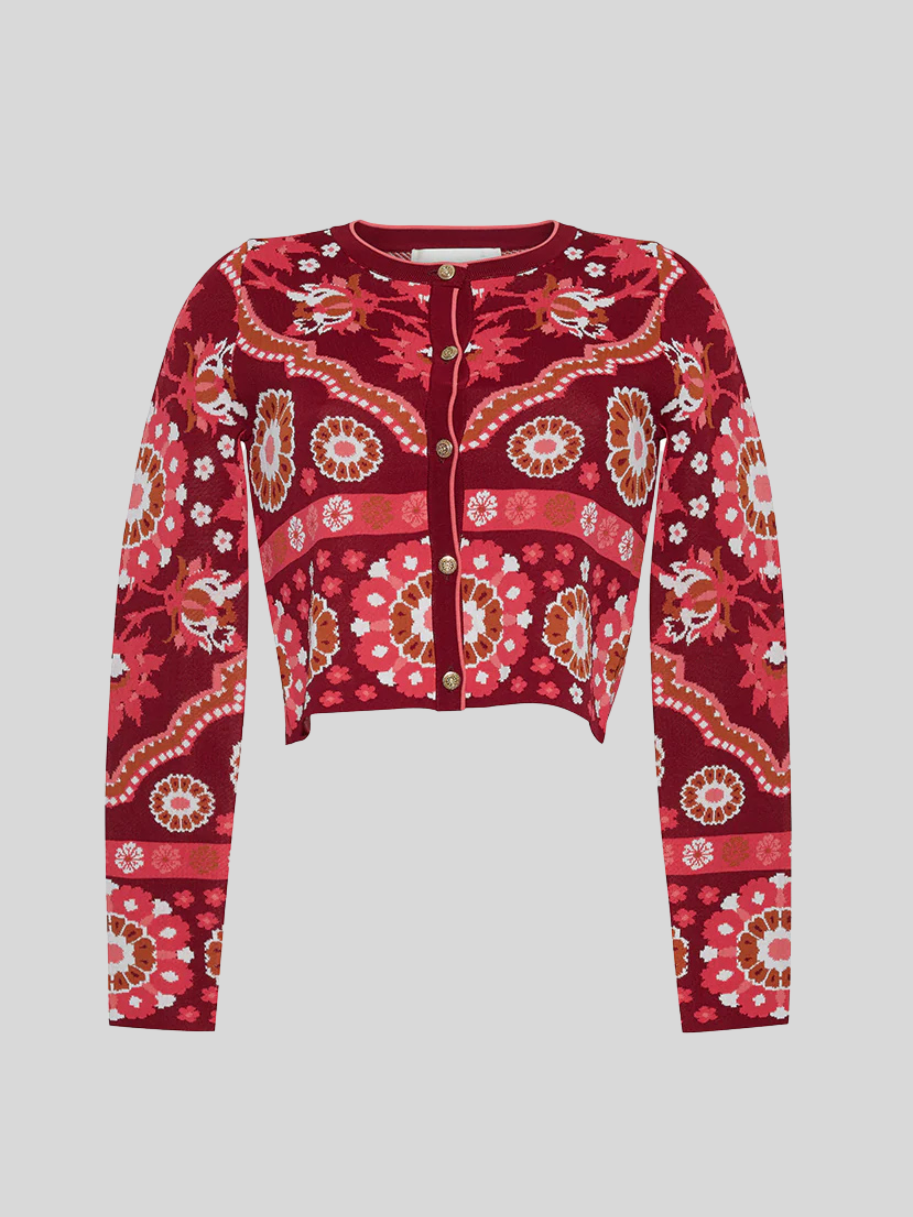 • Long sleeve fitted crew neck cardigan with jacquard pattern