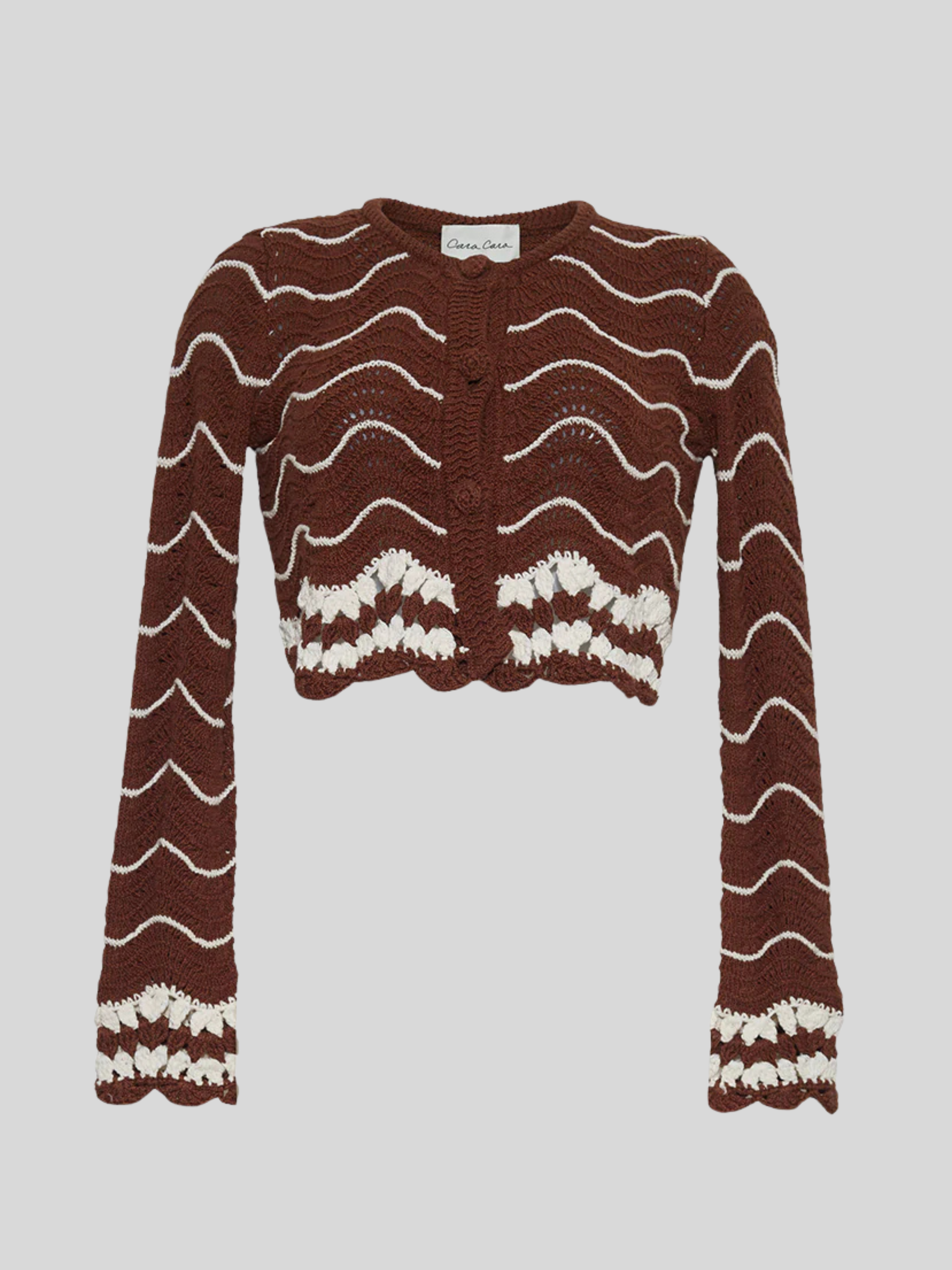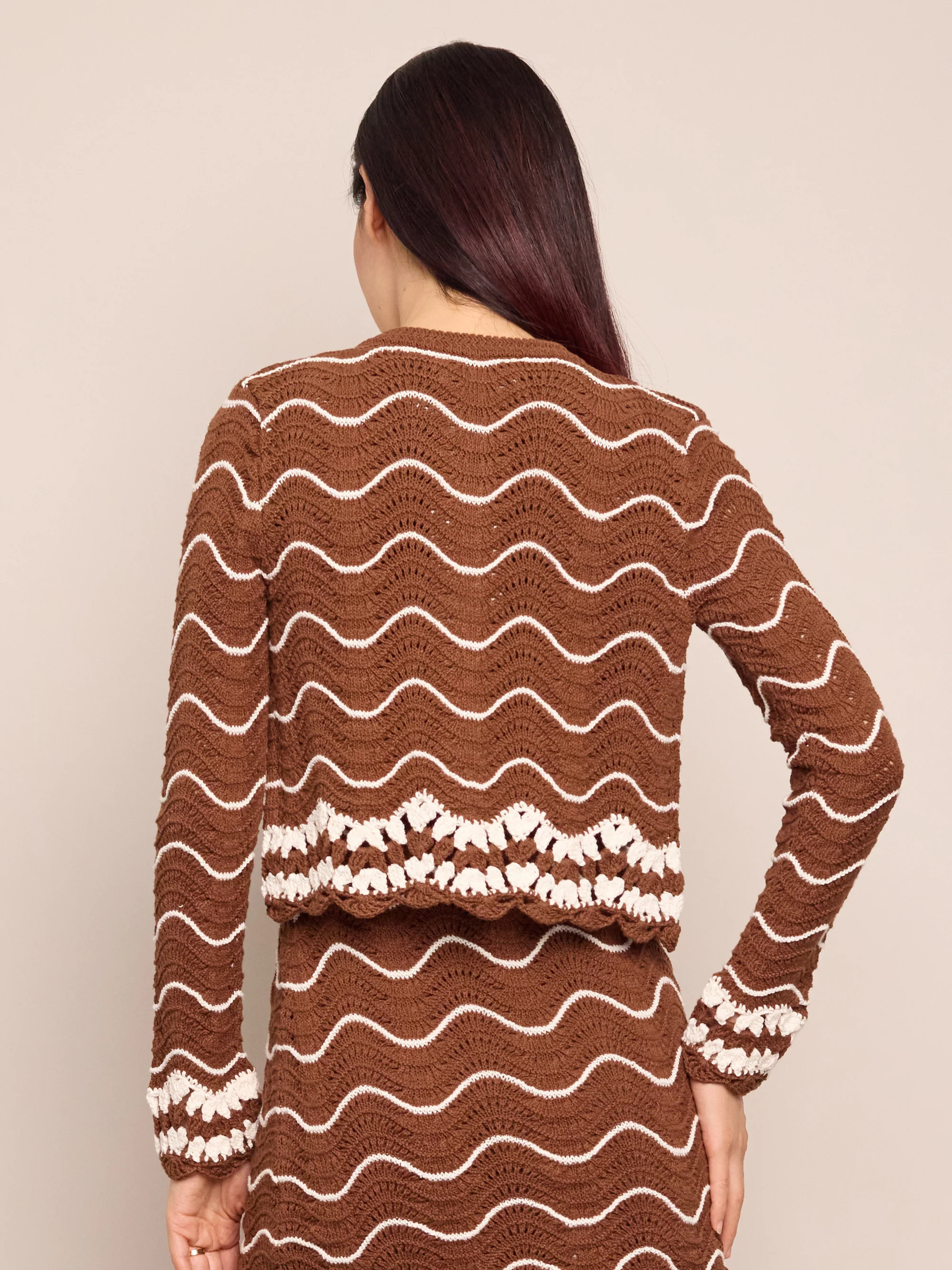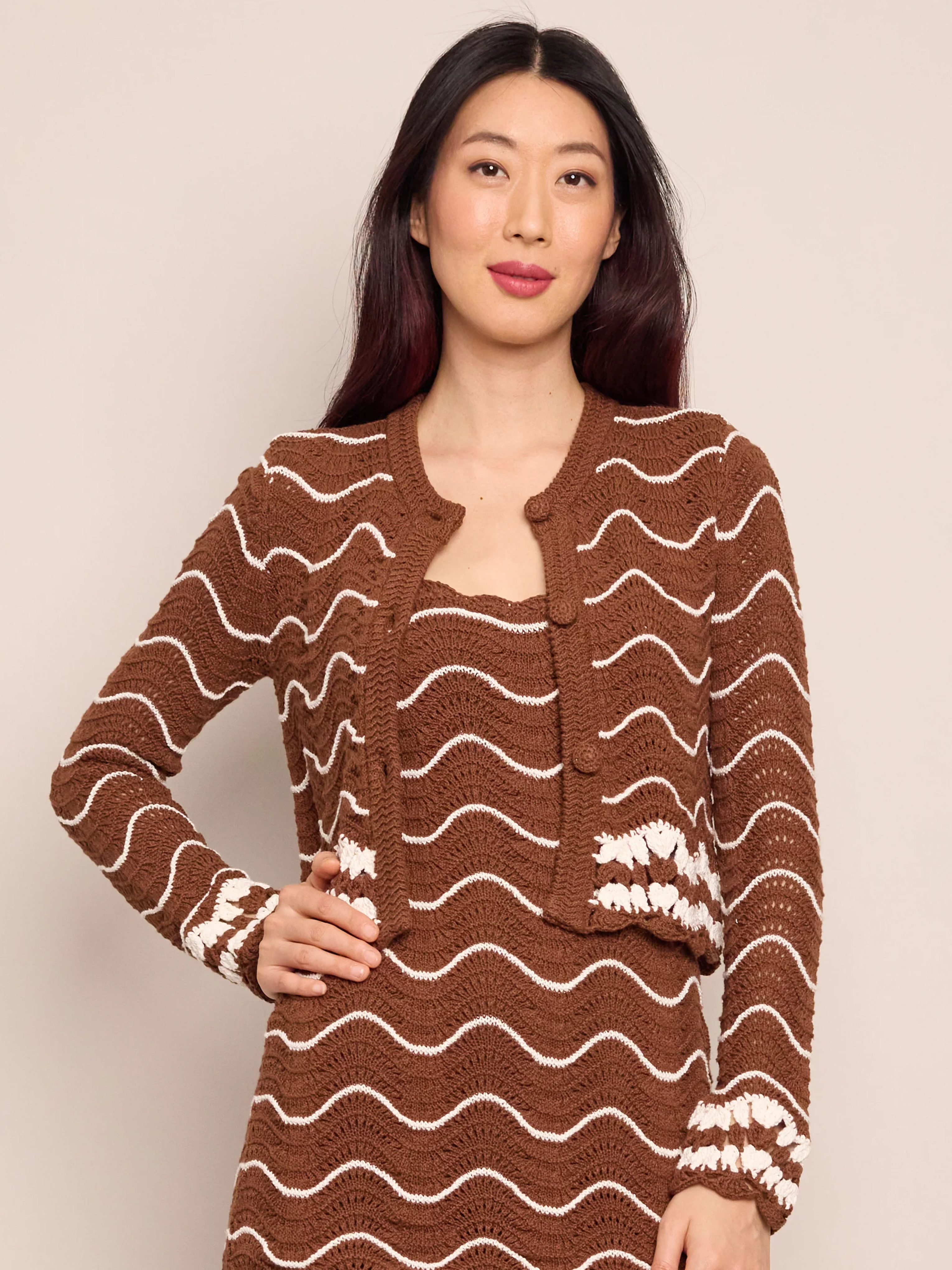 • Cotton crochet striped crewneck longsleeve cardigan with hand crochet trims