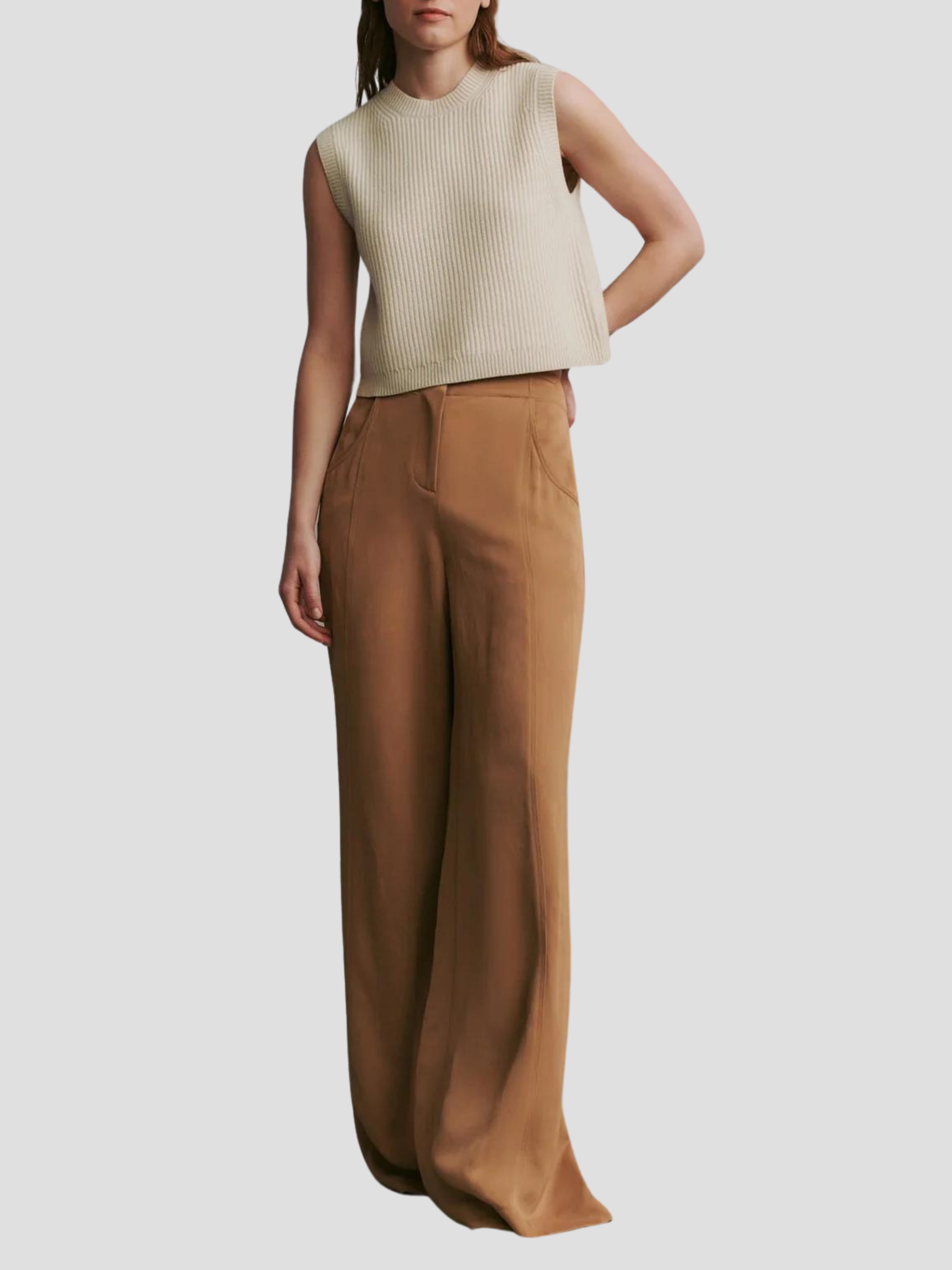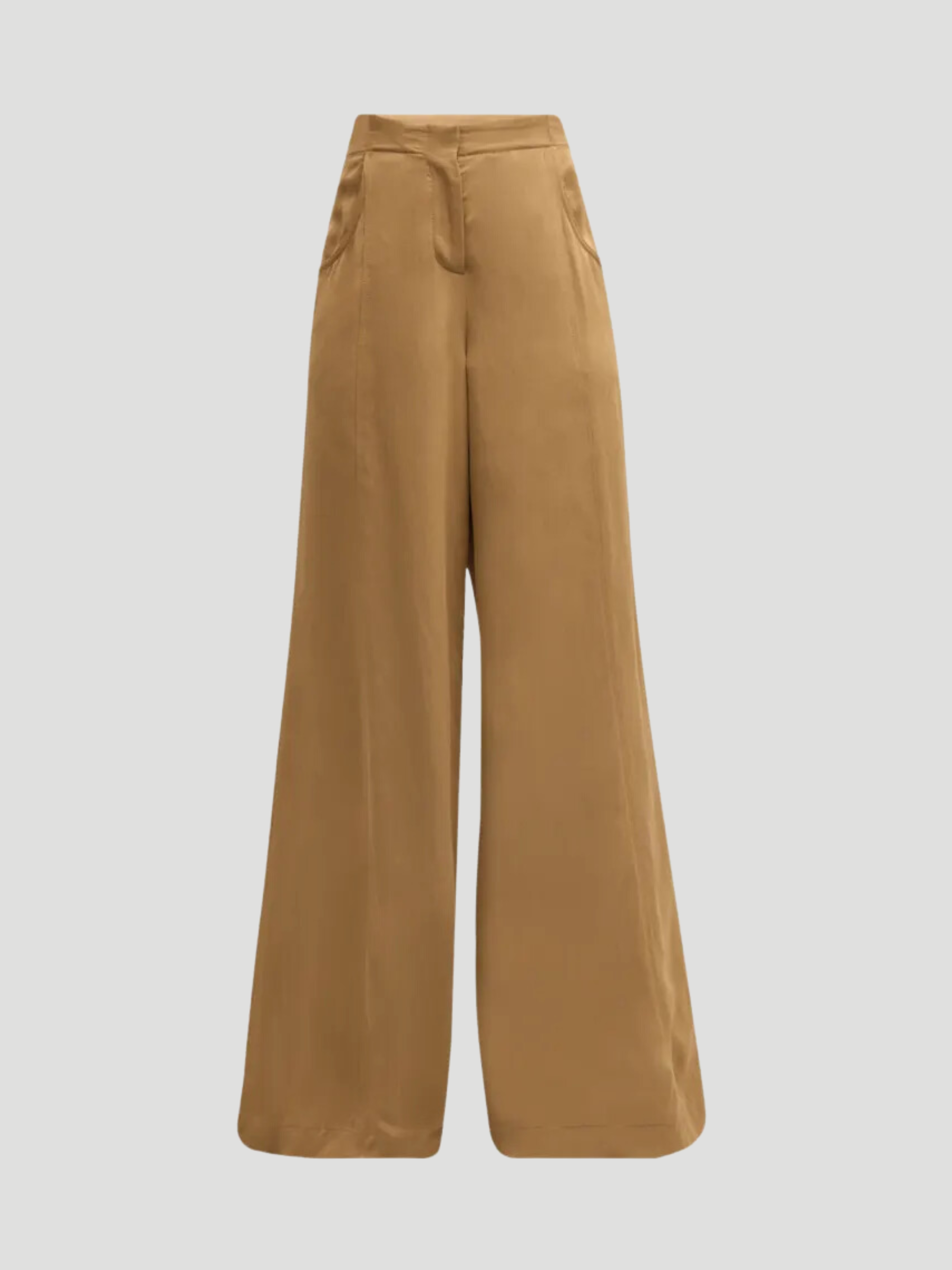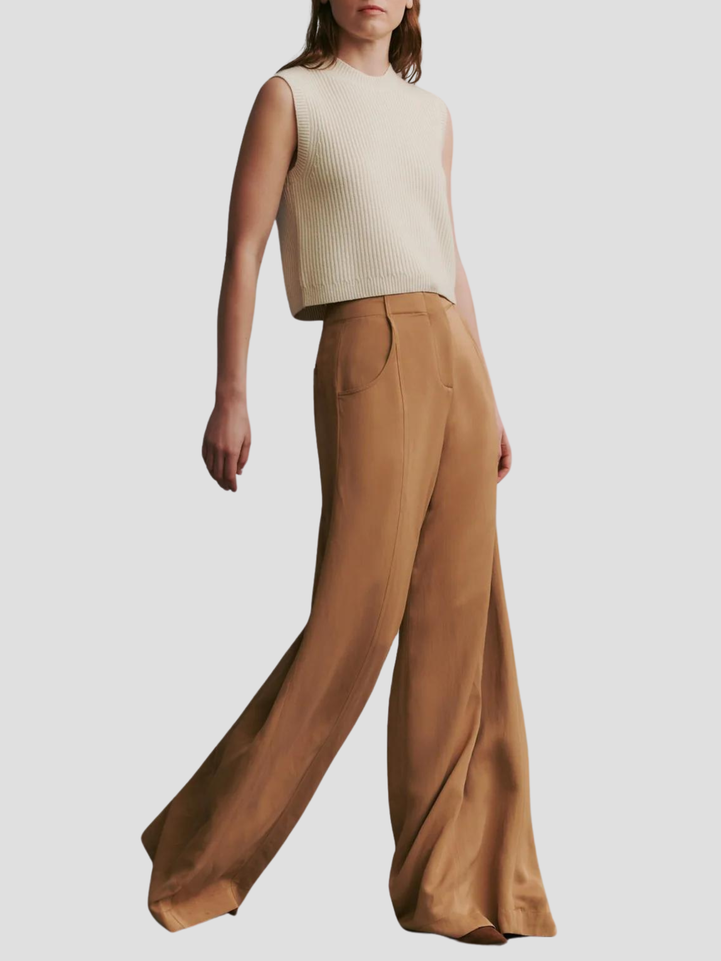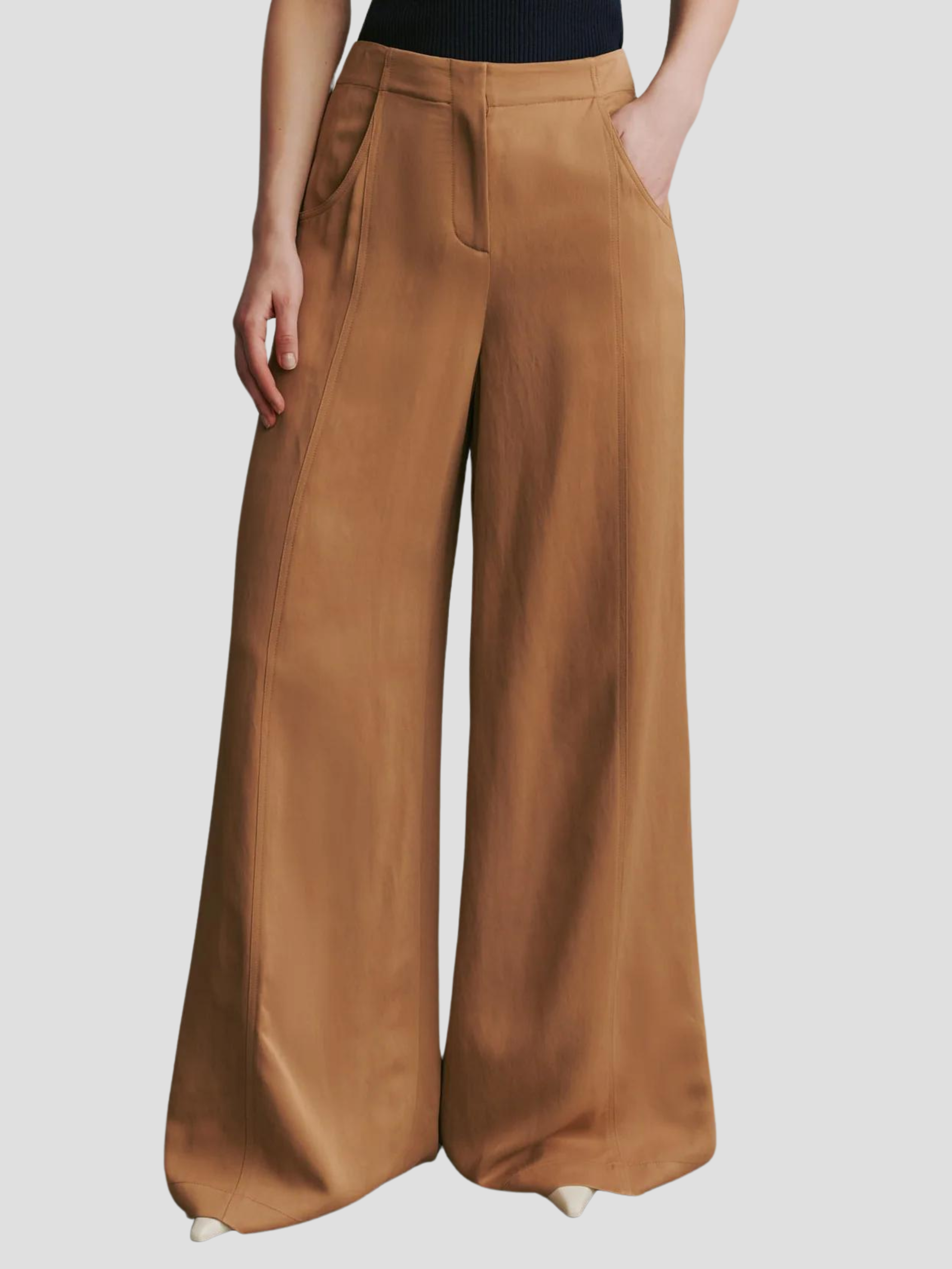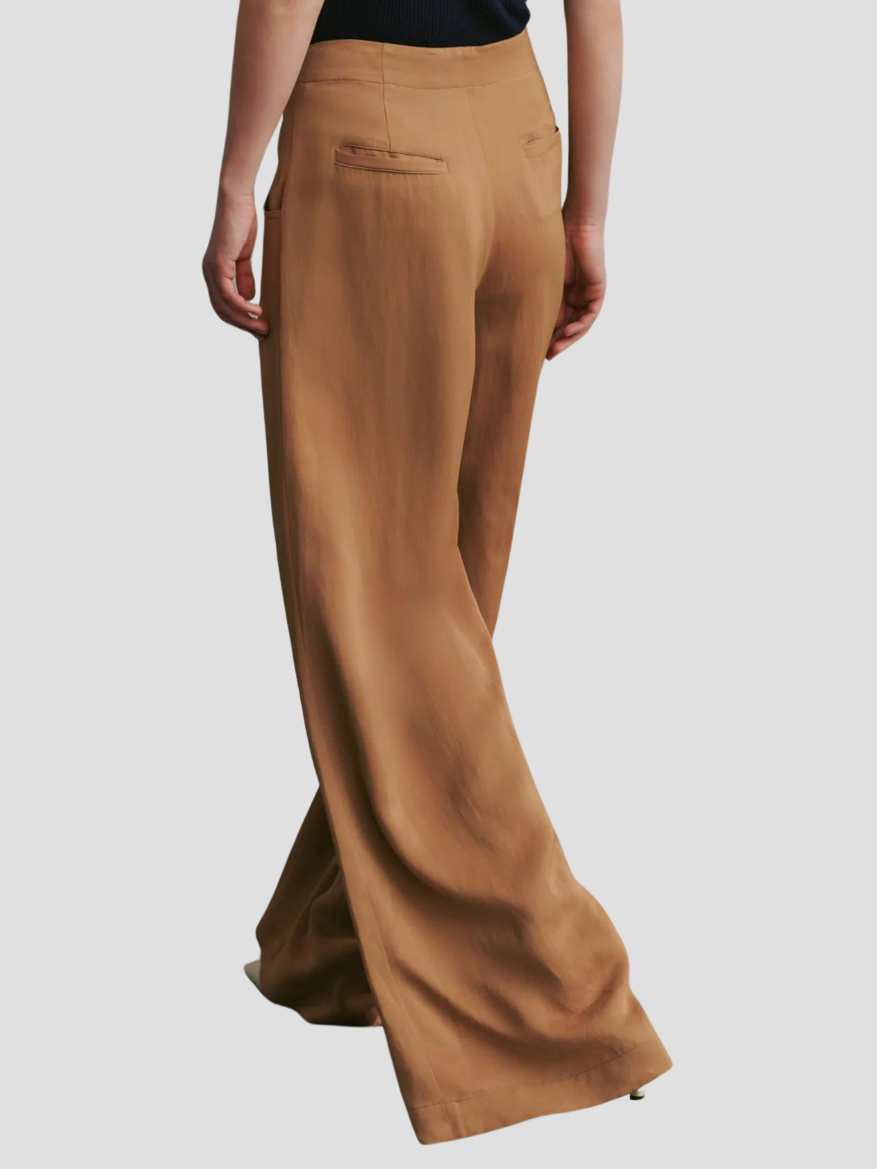 Expertly crafted in polished viscose linen, the Demie Linen Wide-Leg Pant in Tan exudes sophistication. With a signature high-rise, fitted hip, and dramatic flared leg, this pant elongates and flatters the silhouette. The zip-fly, hook and eye fastening and deep side pockets add functionality. Elevate your wardrobe with TWP's must-have piece.