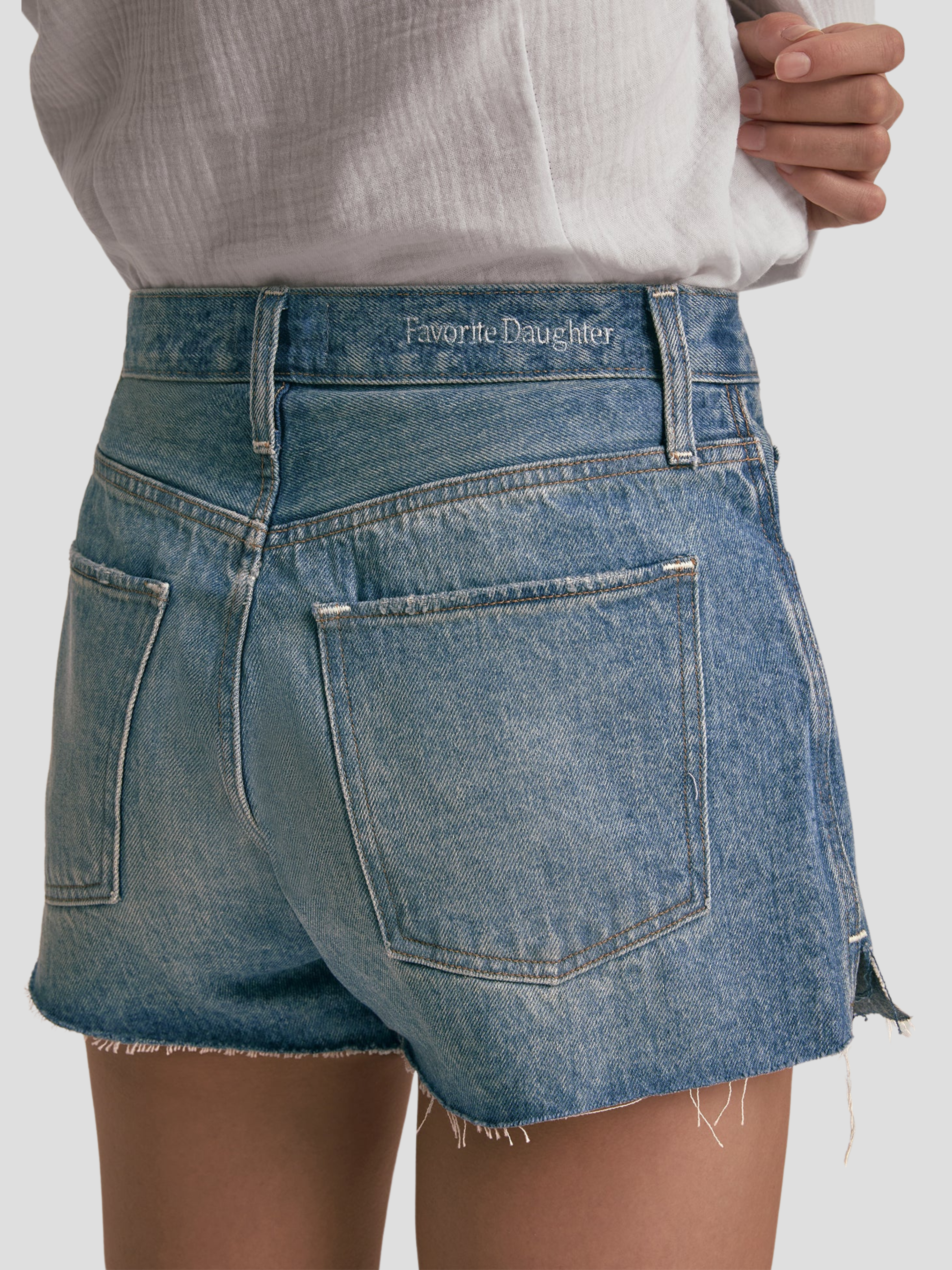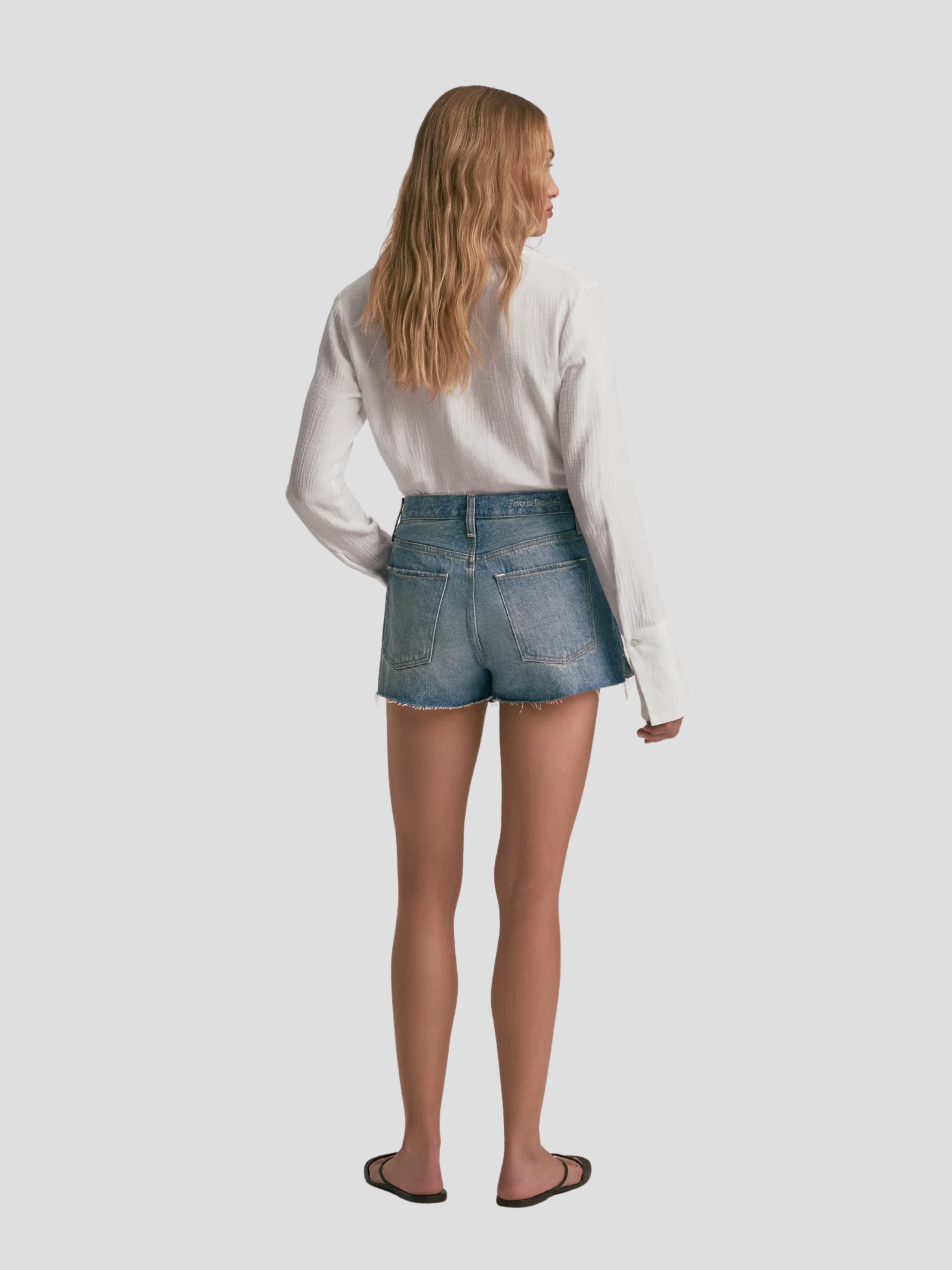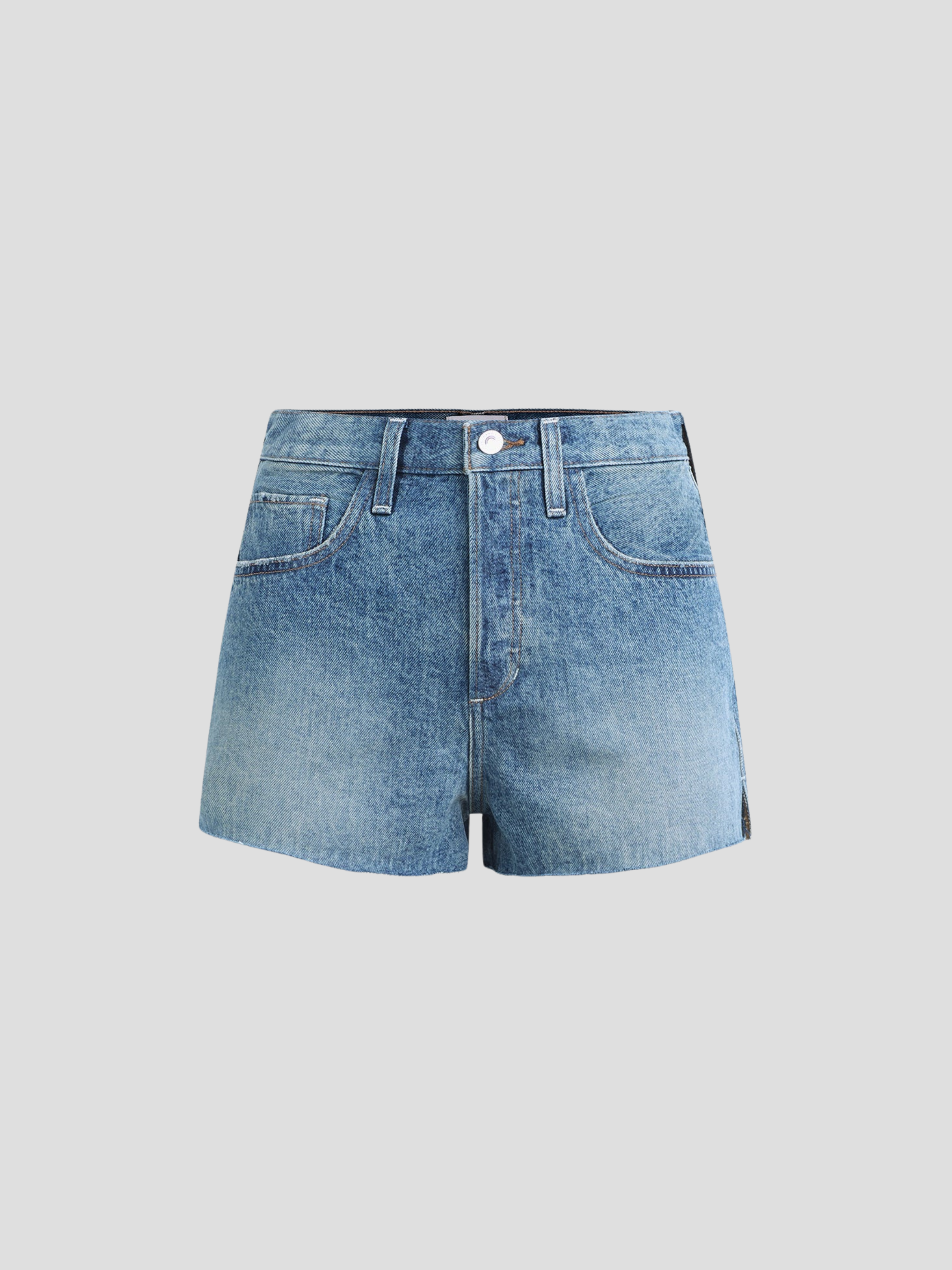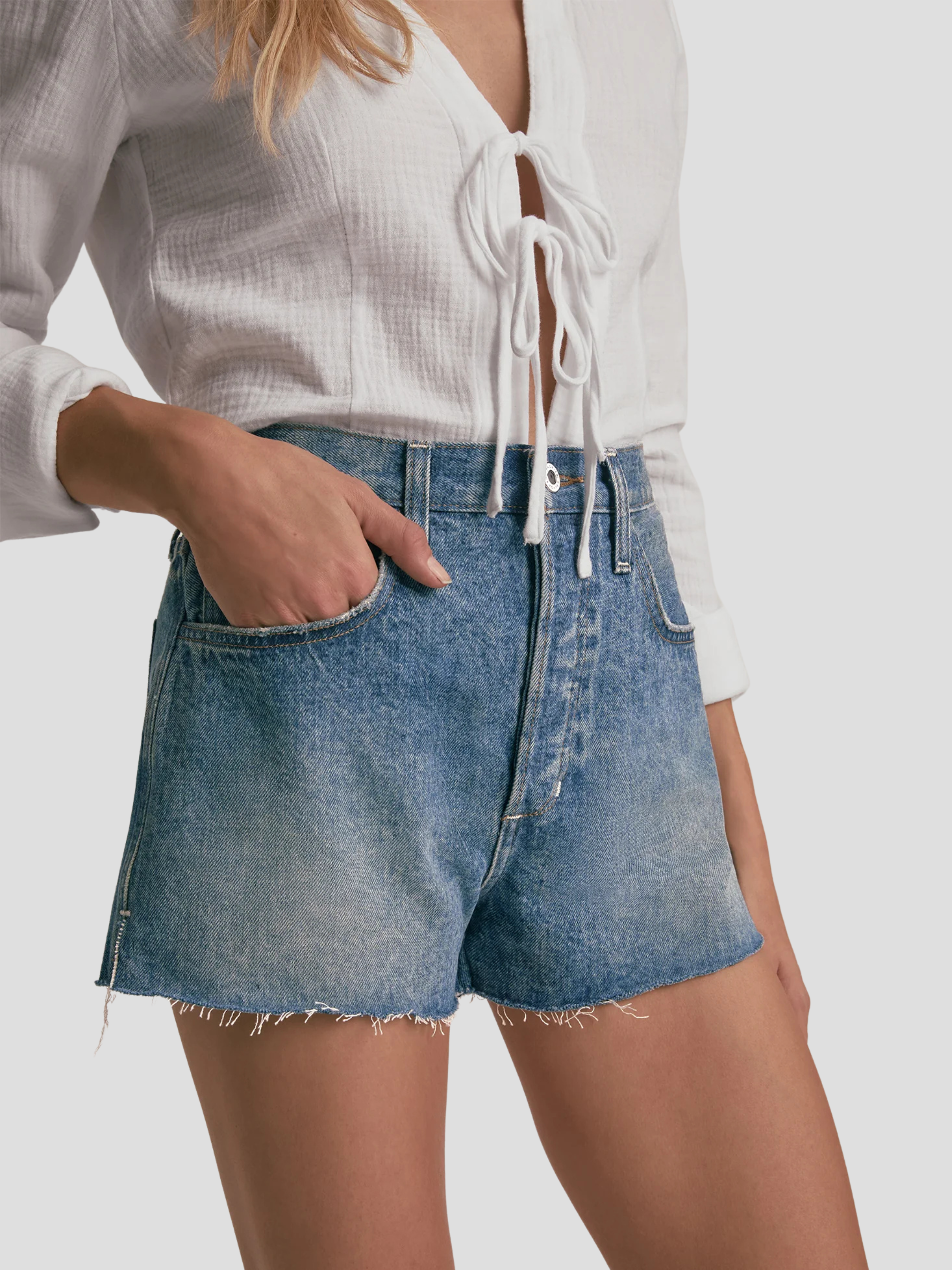A must-add to your warm weather lineup. The Caroline Short has a 11.75" high rise and 2.5" inseam that's easy at the hips and thigh. Cut from rigid denim, Brisbane is a medium-blue, settle acid wash with a subtle marbling effect all over. Our favorite detail is the raw cut hems with side slits.