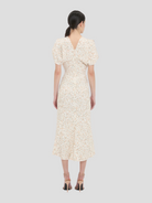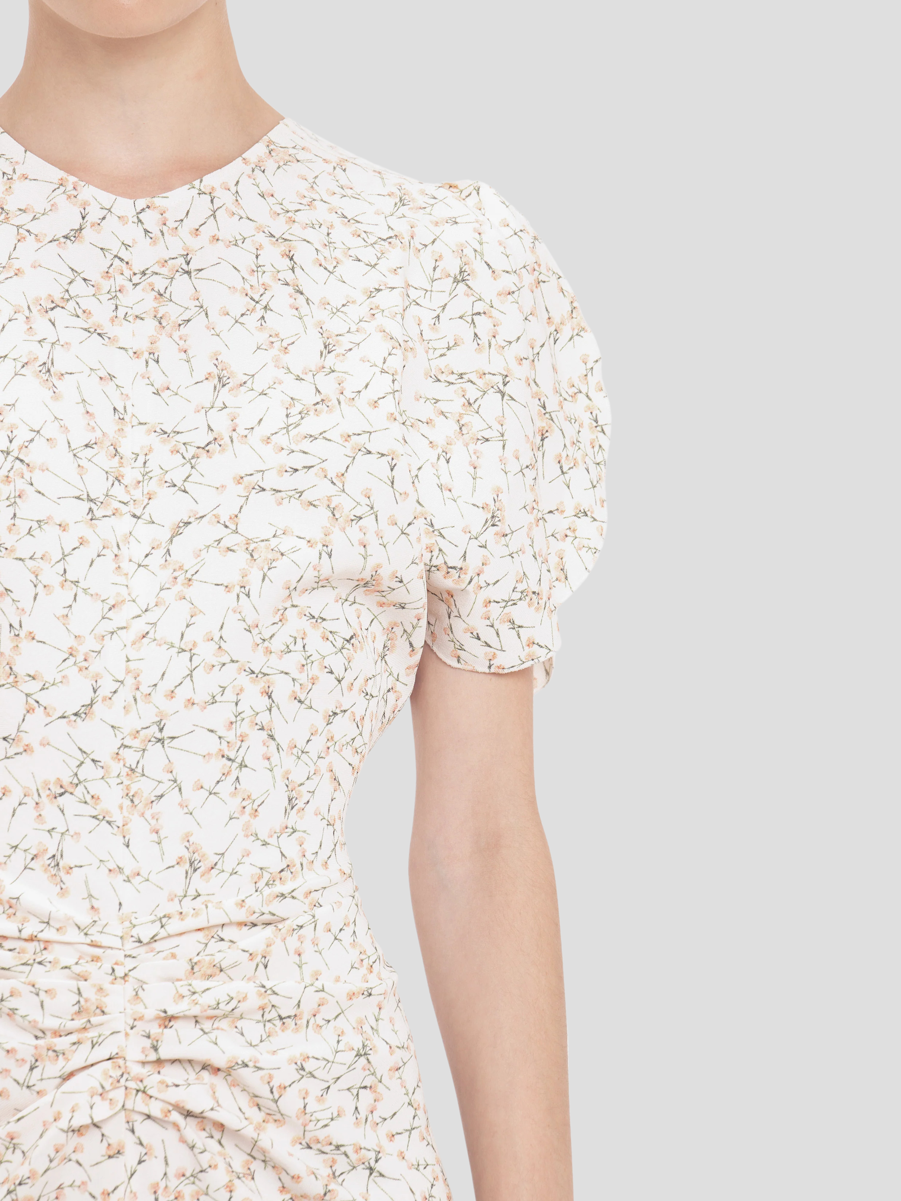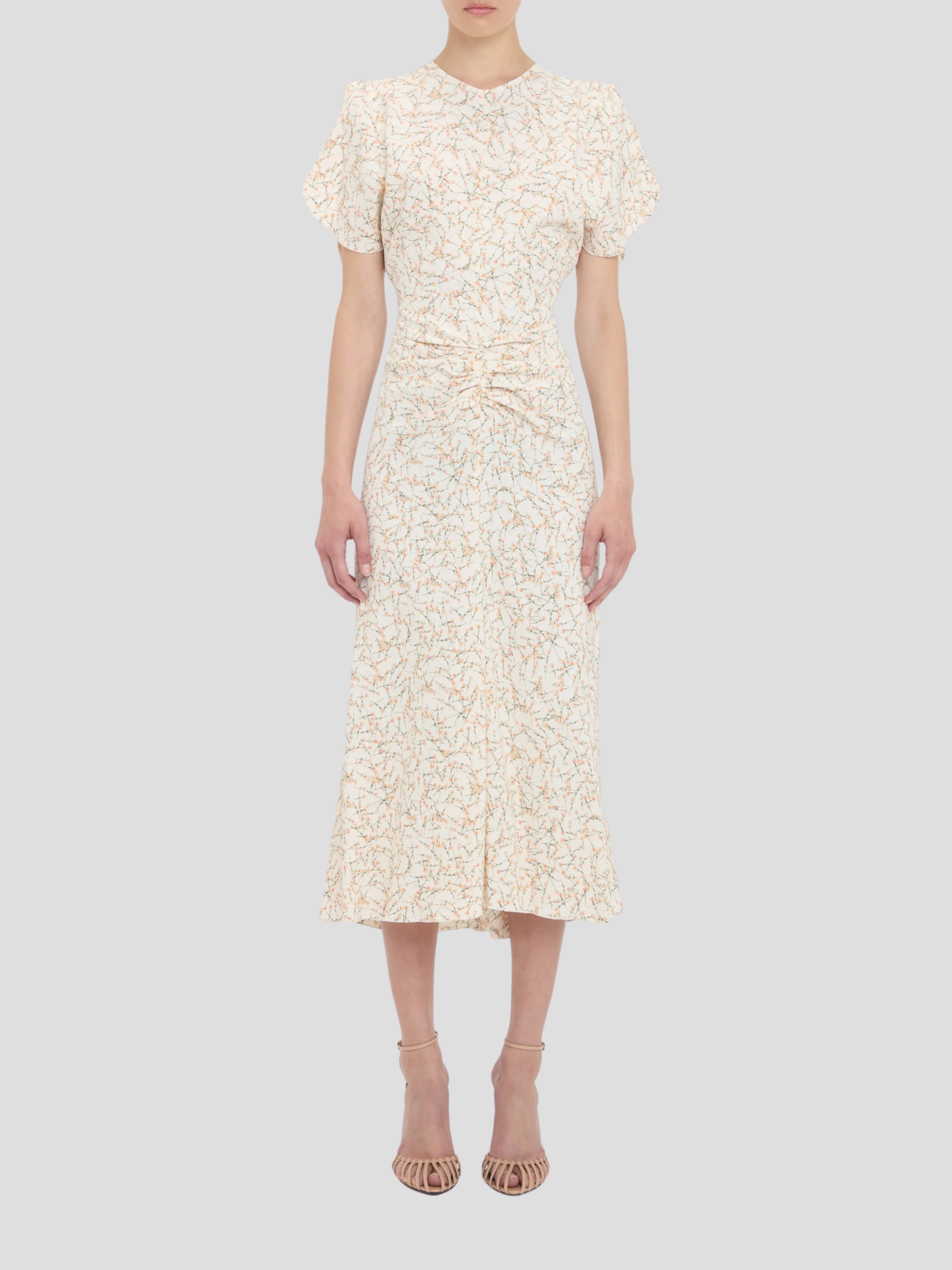 A charming peach floral print breathes fresh personality into the house’s Gathered Waist Midi Dress. Signature gathered detailing at the waist creates a flattering focal point, while a round front neckline and V-shaped neckline at the back looks unexpected and modern. Exposed seams, contrast topstitch details and a longer-length hemline at the back add visual interest.