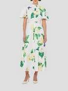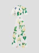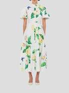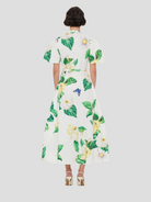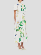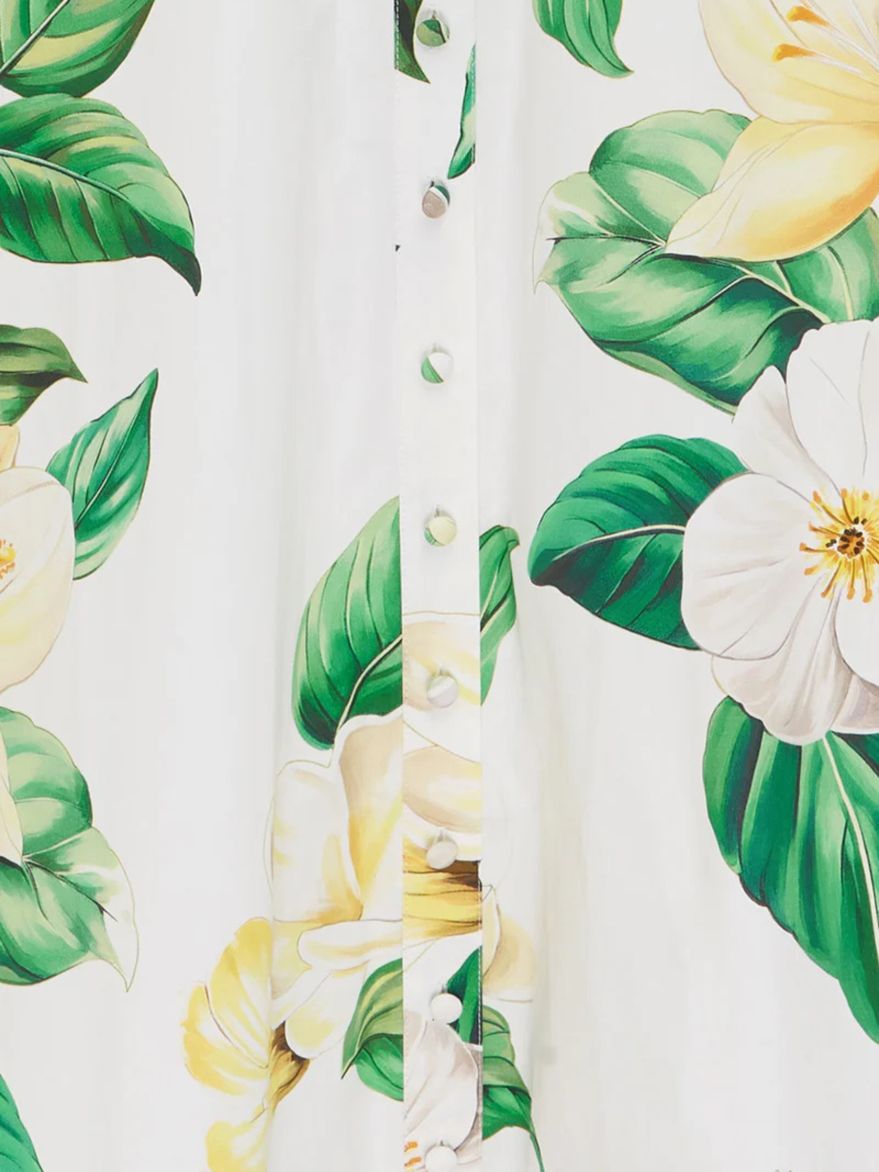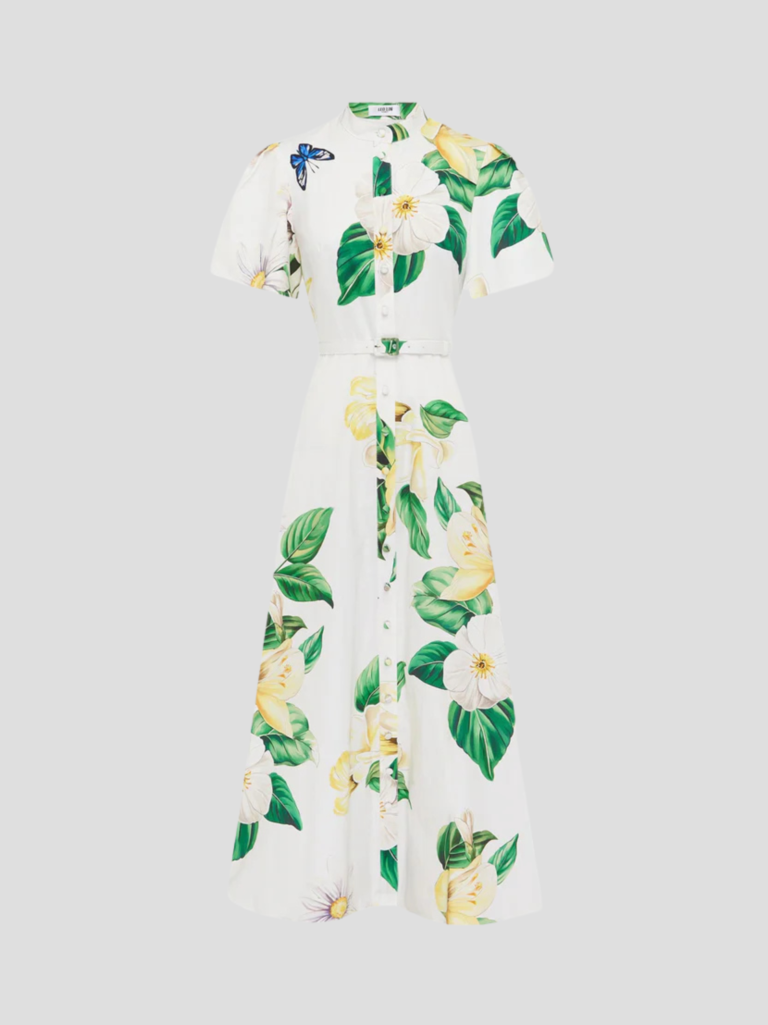 Delicate daisies and camellias are hand-painted onto a fresh white canvas. Playful cobalt blue butterflies flutter irregularly across the print, one can almost feel the sensation of sunshine through the fabric.