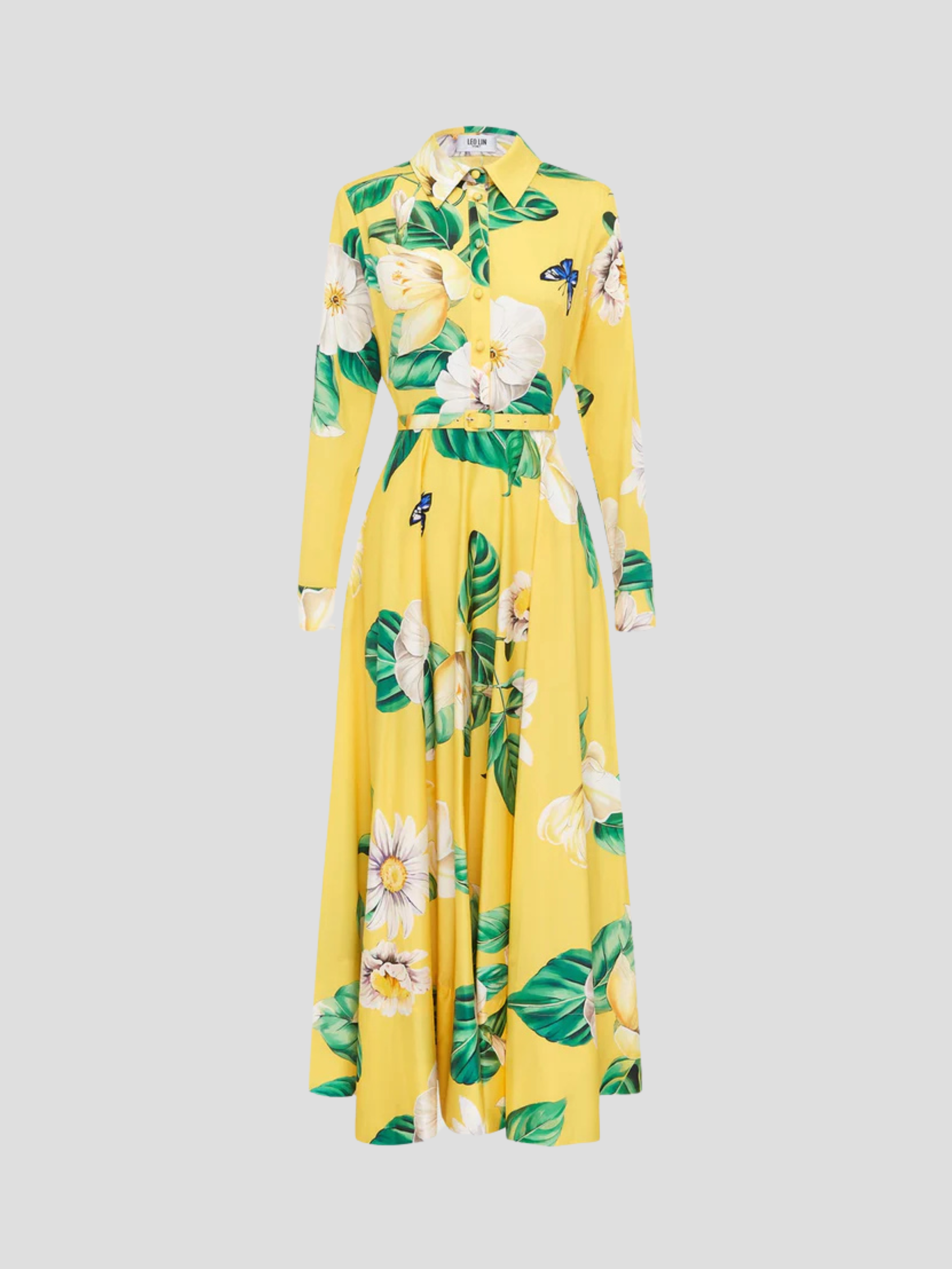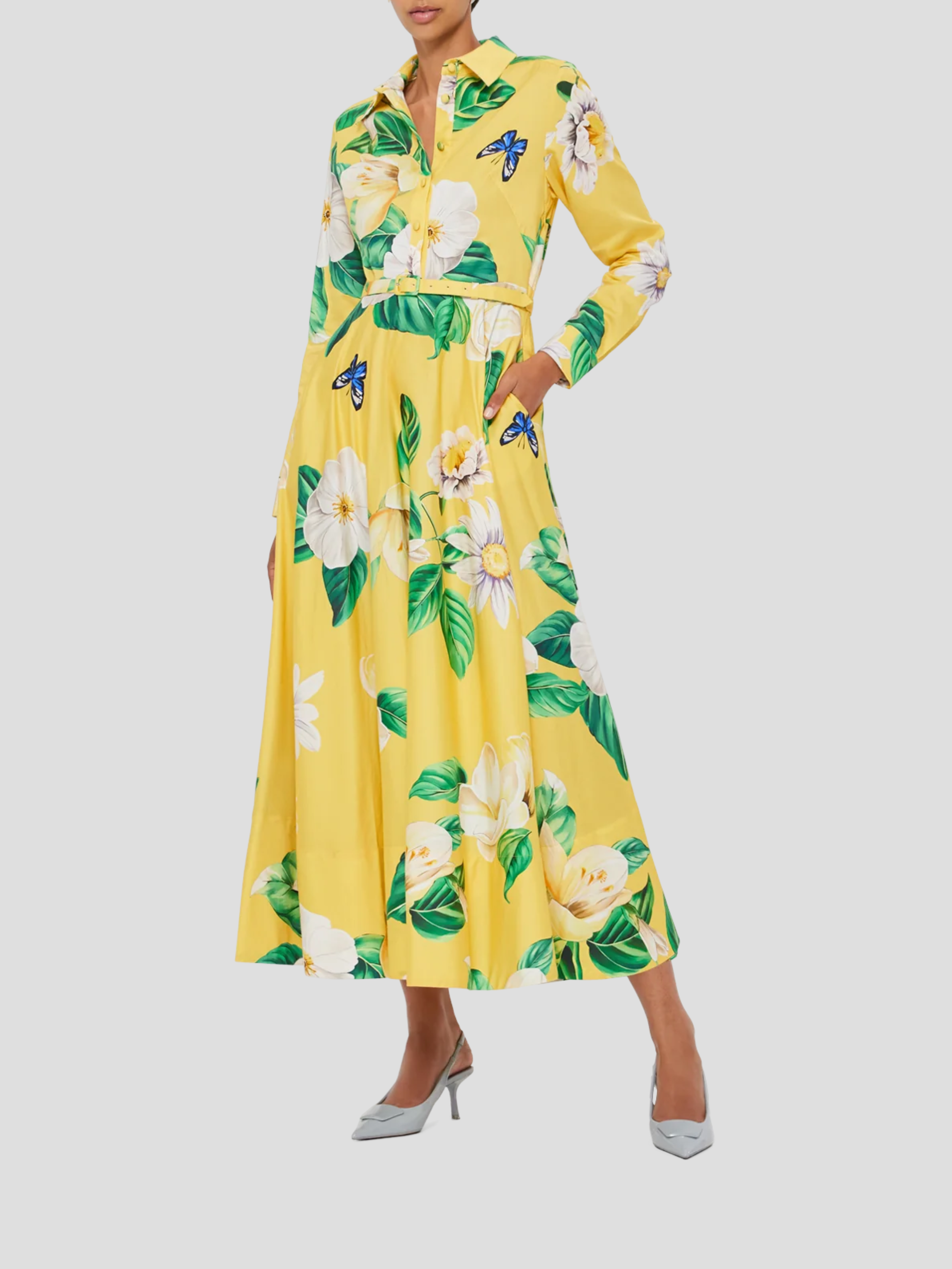 Delicate daisies and camellias are hand-painted onto a vibrant canary yellow canvas. Playful cobalt blue butterflies flutter irregularly across the print, one can almost feel the sensation of sunshine through the fabric.