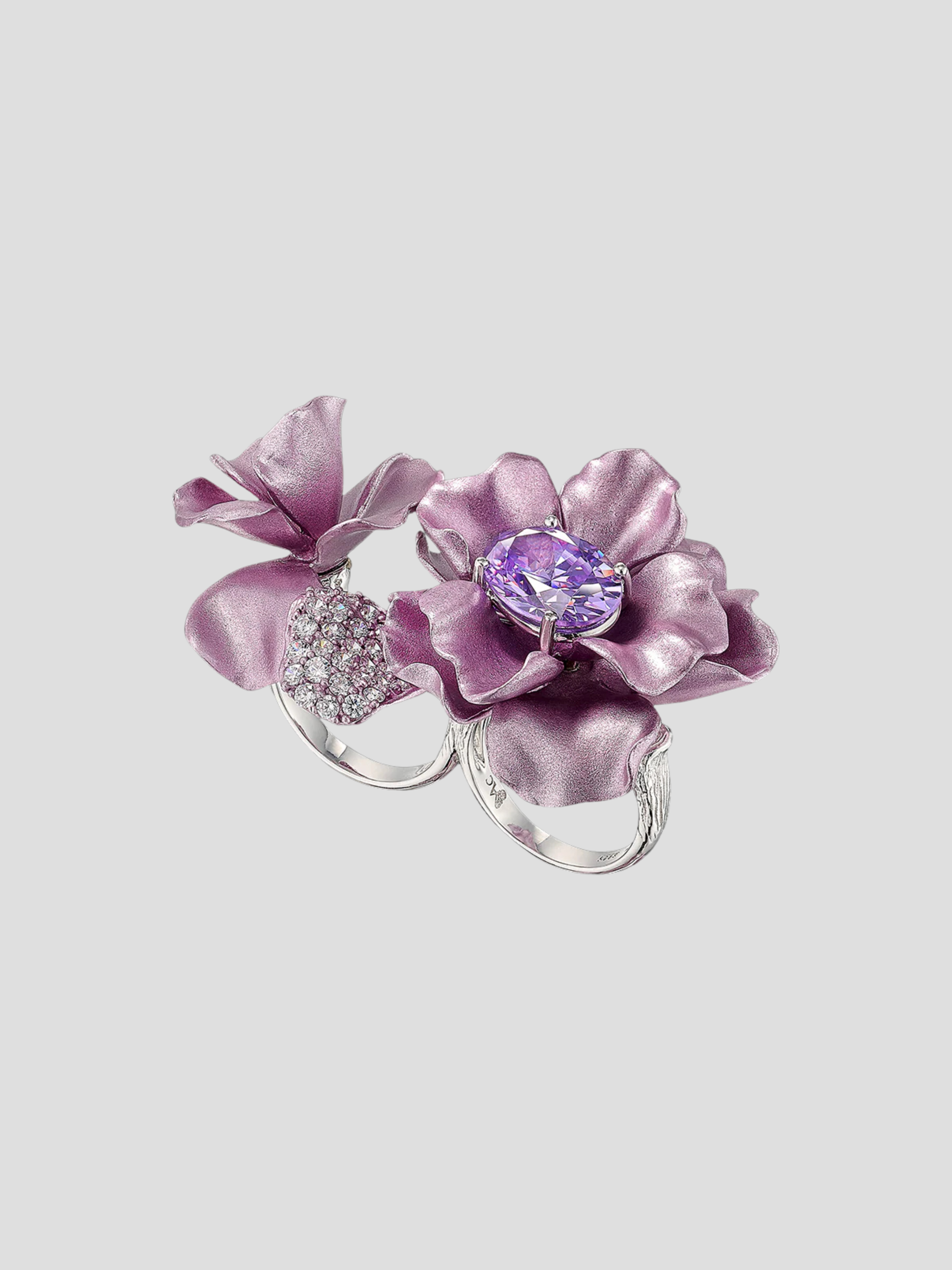 A stunning cocktail ring in recycled lavender aluminium and 18k white gold and rhodium vermeil, hand-set with laboratory-grown and created gemstones including an oval-cut lilac amethyst of 10.2 carats, and pavé-set simulated white diamonds of the highest brilliance.