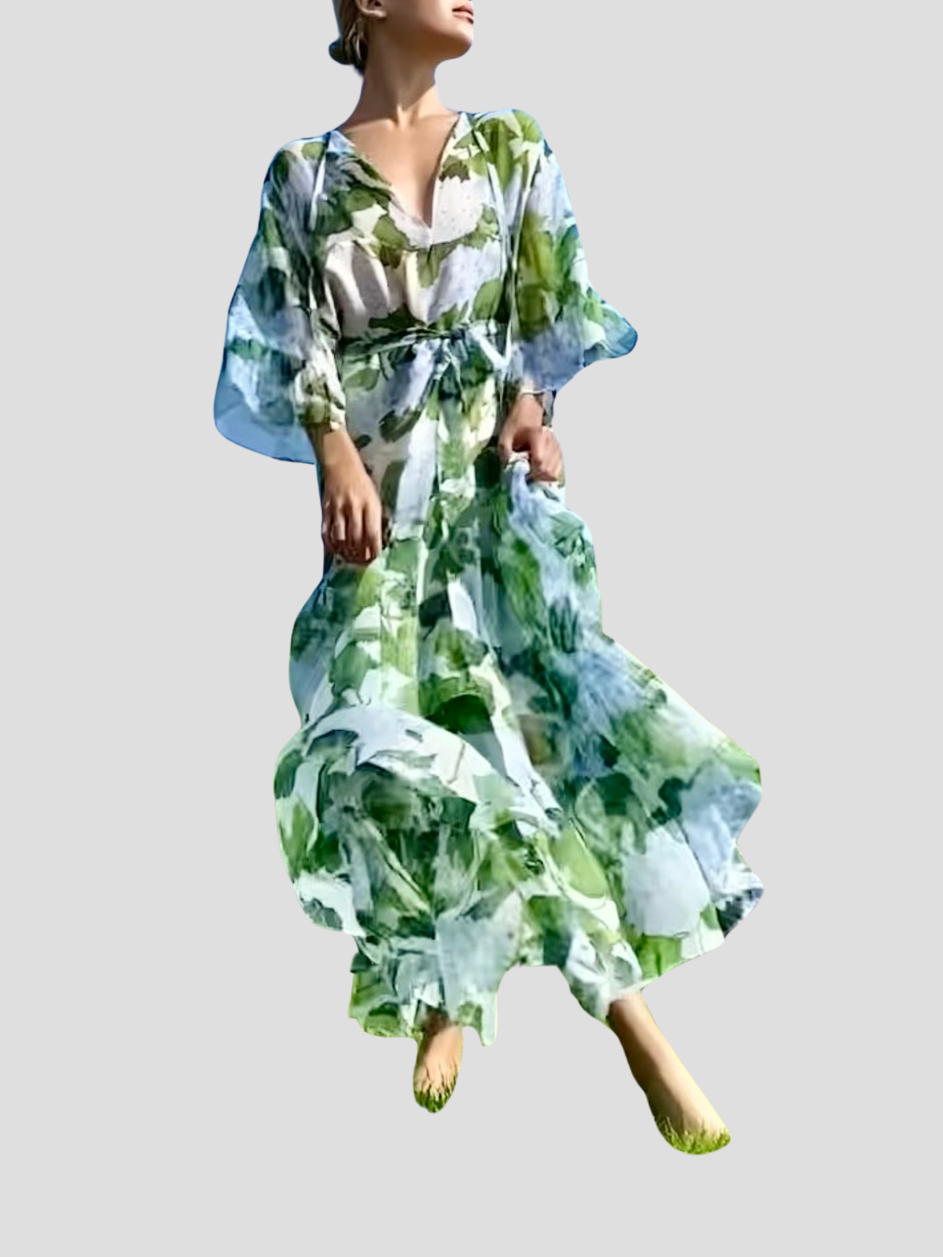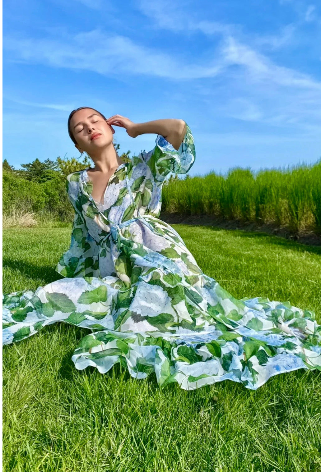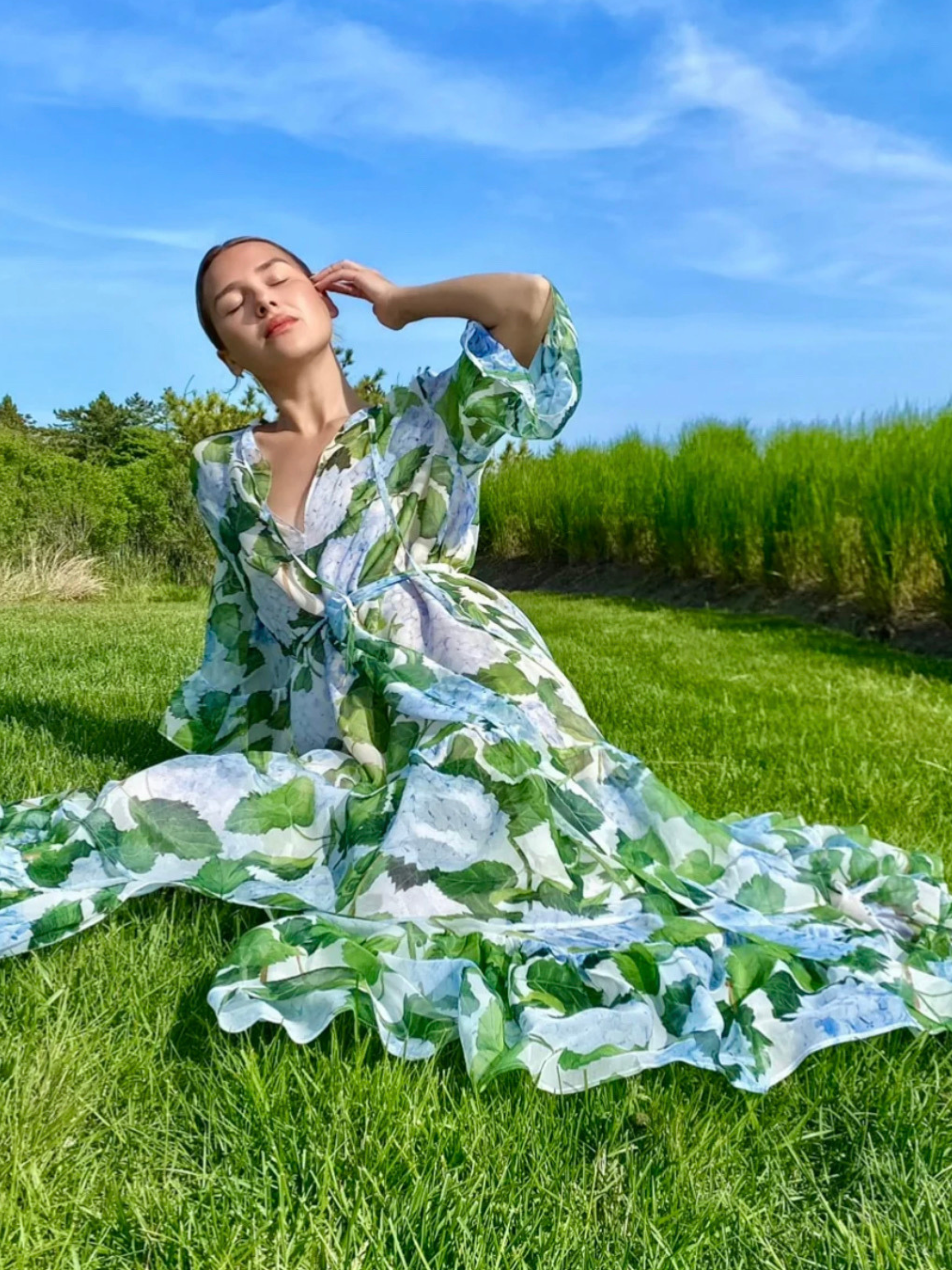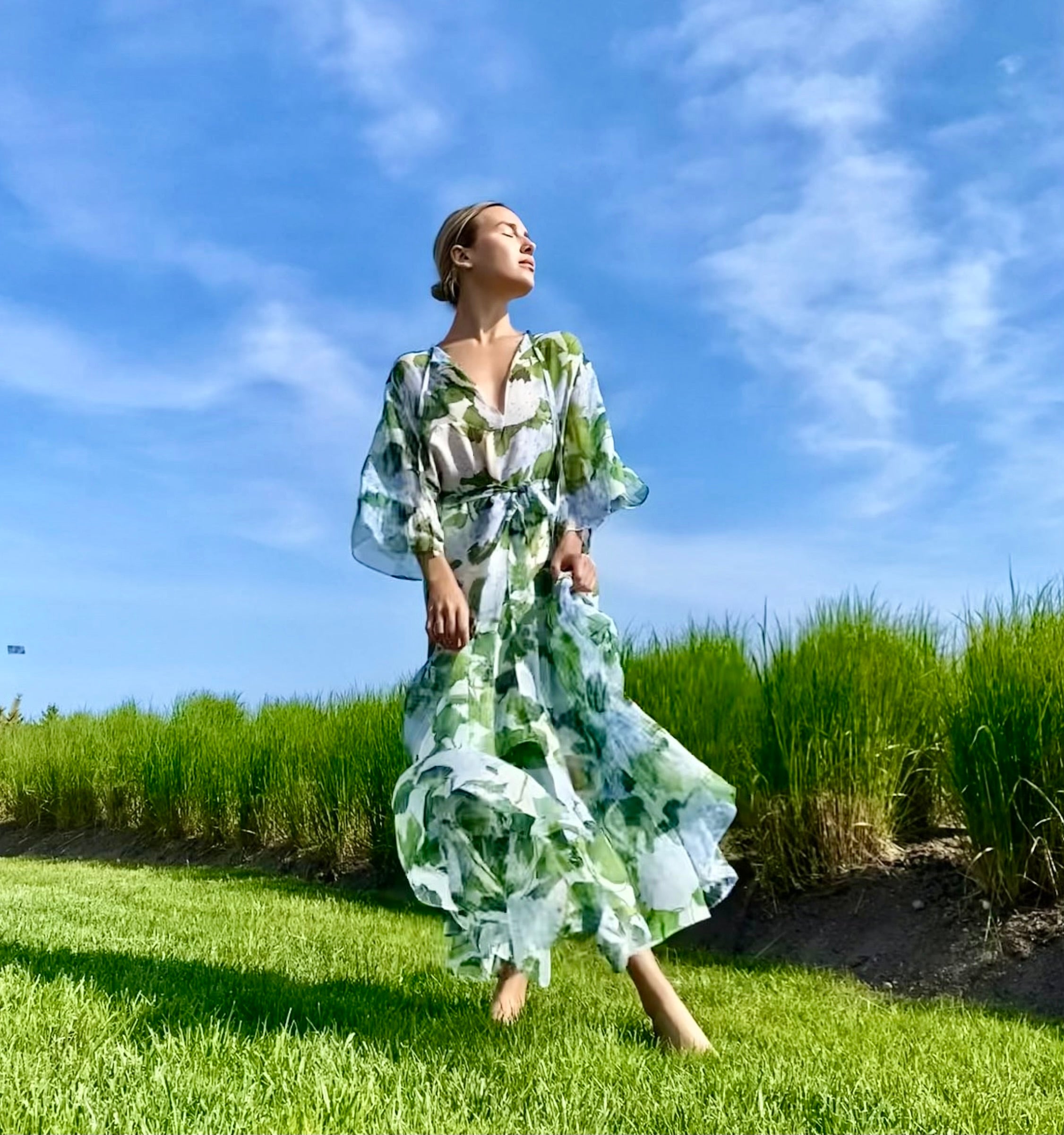 Praire Floral Silk Chiffon Maxi Dress in Green and White